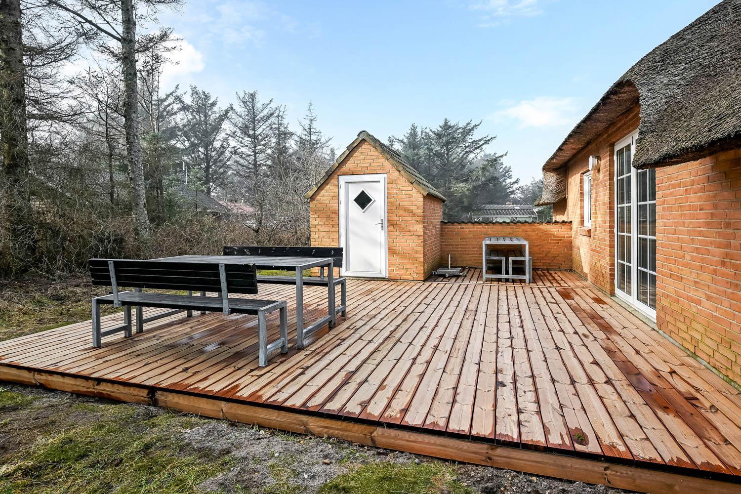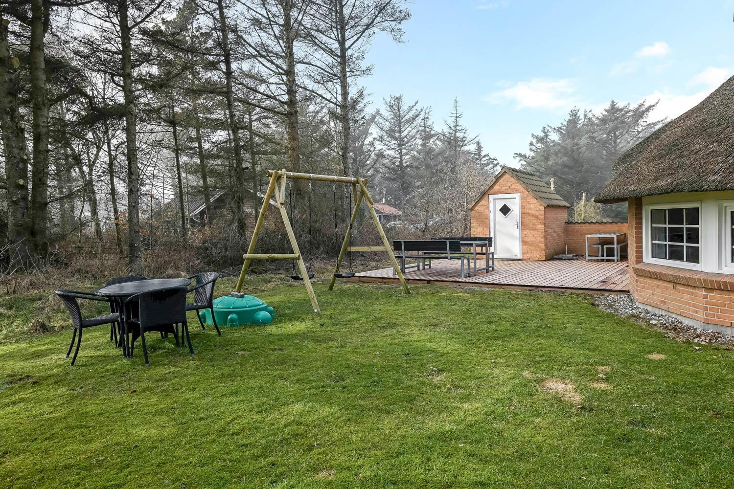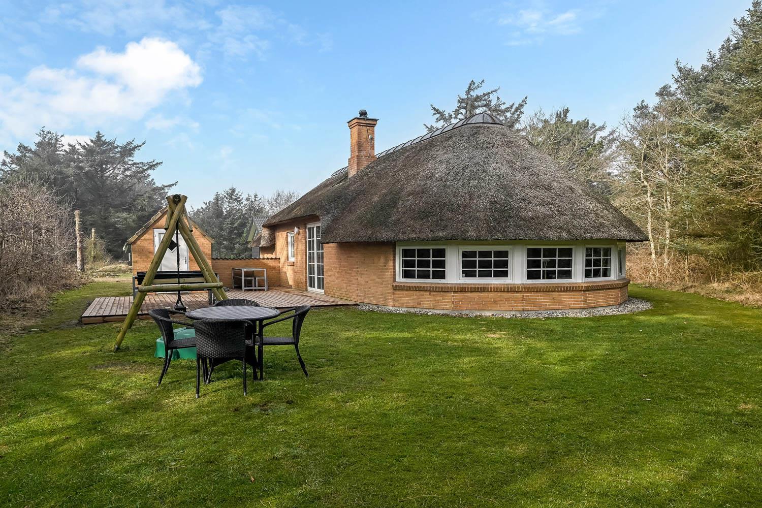 Das Ferienhaus befindet sich auf einem schönen, circa 1.600 m² Grundstück mit vielen Sonnenplätzen. Die Terrassenanlage ist ausgestattet mit guten Gartenmöbeln, Liegestühlen, Kissen, Sonnenschirm und Gasgrill, die übrigens auch optimal für einen schönen Grillabend ist. Das gepflegte Naturgrundstück ist von hohen Bäumen umgeben, die einen guten Schutz bieten, sodass Sie die Sonne sowohl morgens als auch abends genießen können. Nur etwas 350 m entfernt liegt die brausende Nordsee, die jeden Tag ein neues, malerisches Erlebnis bietet. In der Saison holen Sie Frühstücksbrötchen, Kaufmannswaren oder laden die Familie zum Essen ein, nur etwa fünf Gehminuten vom Haus. Ganz gleich, ob Sie für Aktivurlaub oder totale Entspannung sind - dieses schöne Ferienhaus selbst bildet mit seiner Lage und Umgebung den perfekten Rahmen dafür.