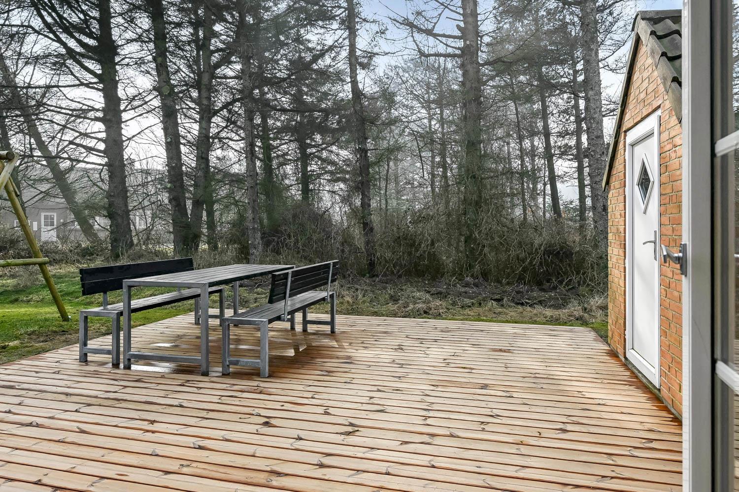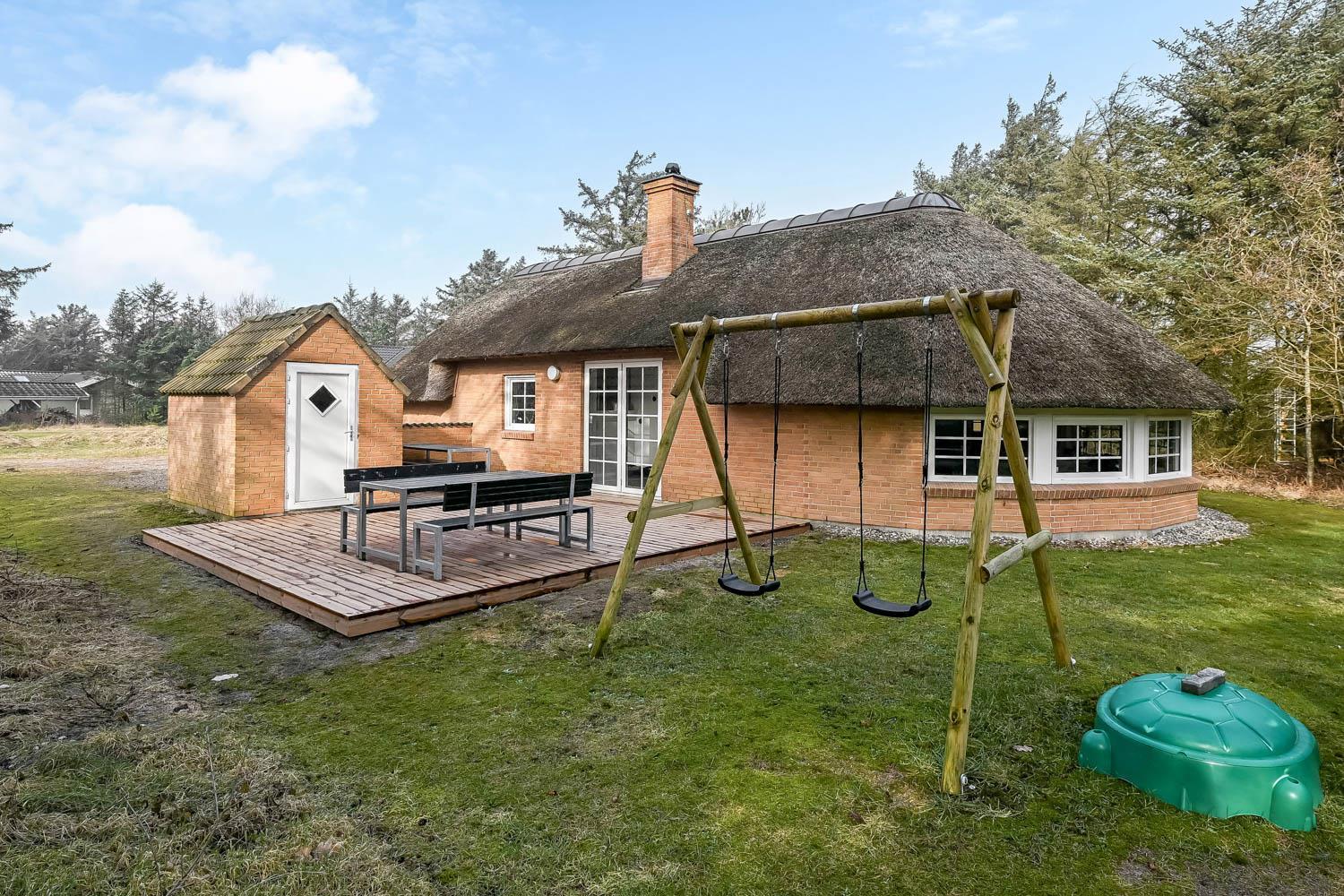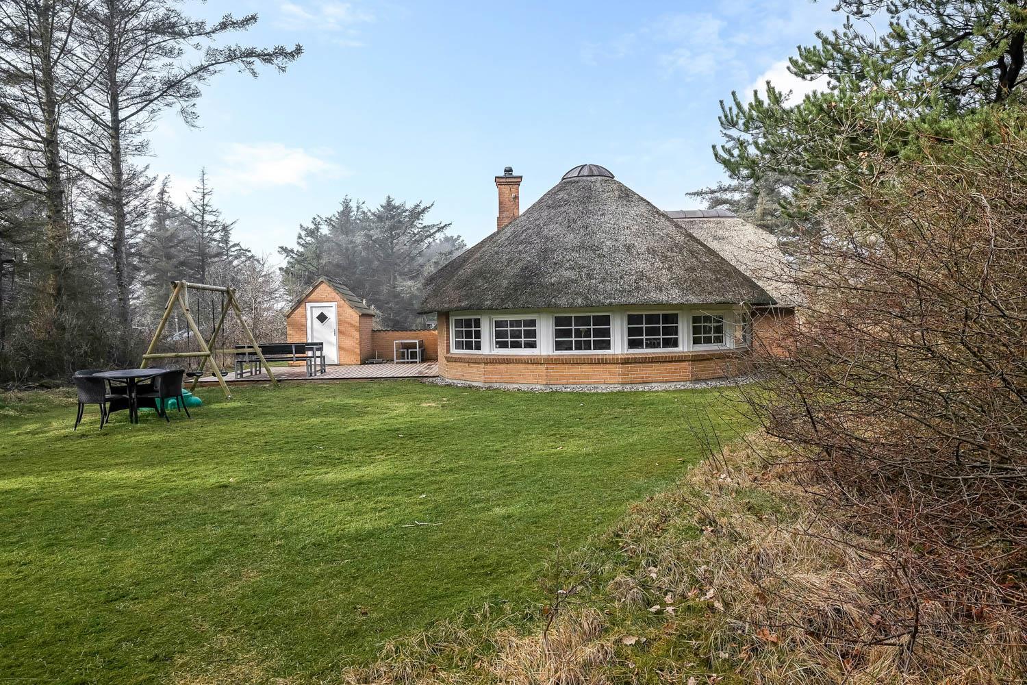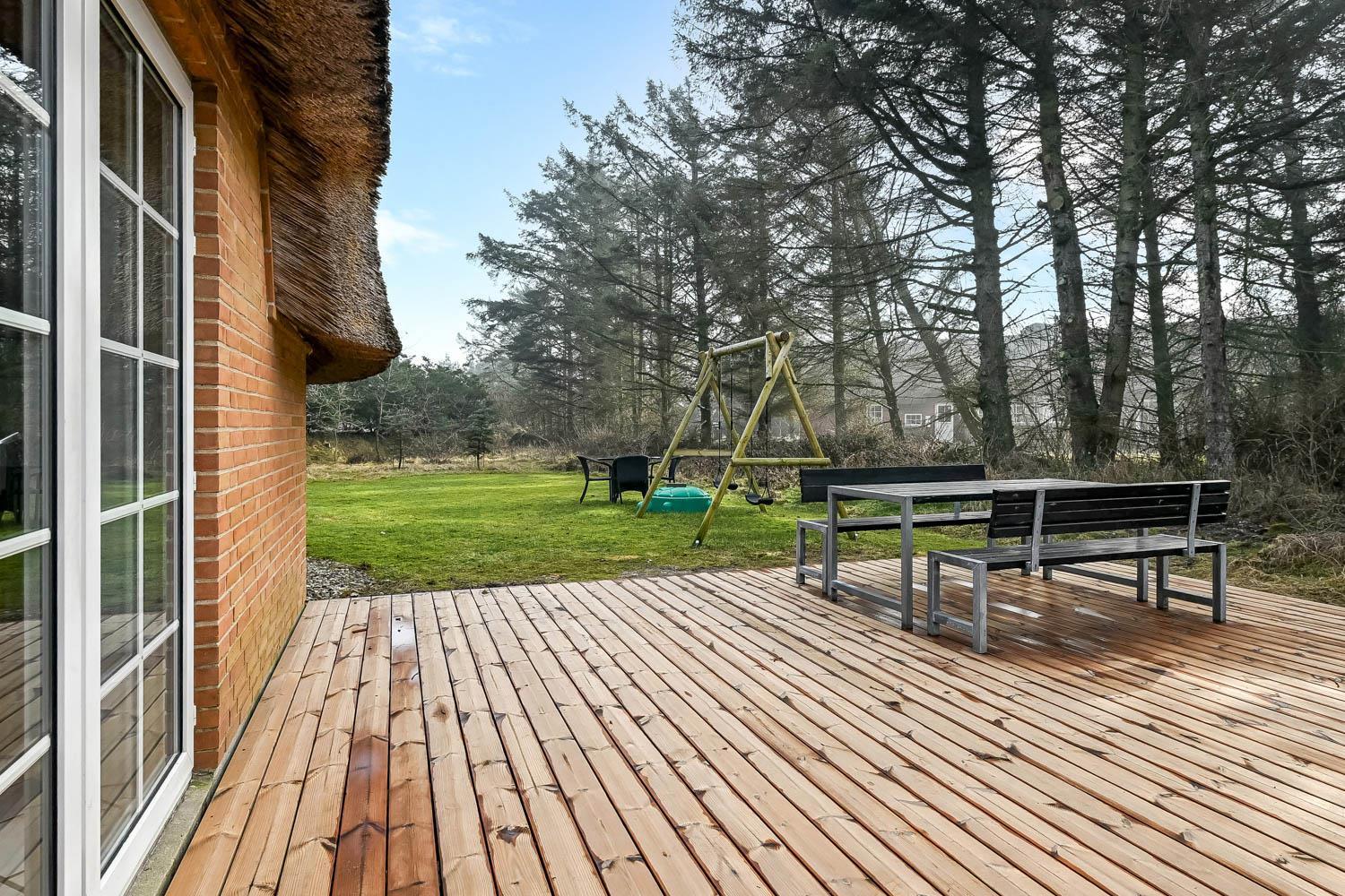 Das Ferienhaus befindet sich auf einem schönen, circa 1.600 m² Grundstück mit vielen Sonnenplätzen. Die Terrassenanlage ist ausgestattet mit guten Gartenmöbeln, Liegestühlen, Kissen, Sonnenschirm und Gasgrill, die übrigens auch optimal für einen schönen Grillabend ist. Das gepflegte Naturgrundstück ist von hohen Bäumen umgeben, die einen guten Schutz bieten, sodass Sie die Sonne sowohl morgens als auch abends genießen können. Nur etwas 350 m entfernt liegt die brausende Nordsee, die jeden Tag ein neues, malerisches Erlebnis bietet. In der Saison holen Sie Frühstücksbrötchen, Kaufmannswaren oder laden die Familie zum Essen ein, nur etwa fünf Gehminuten vom Haus. Ganz gleich, ob Sie für Aktivurlaub oder totale Entspannung sind - dieses schöne Ferienhaus selbst bildet mit seiner Lage und Umgebung den perfekten Rahmen dafür.