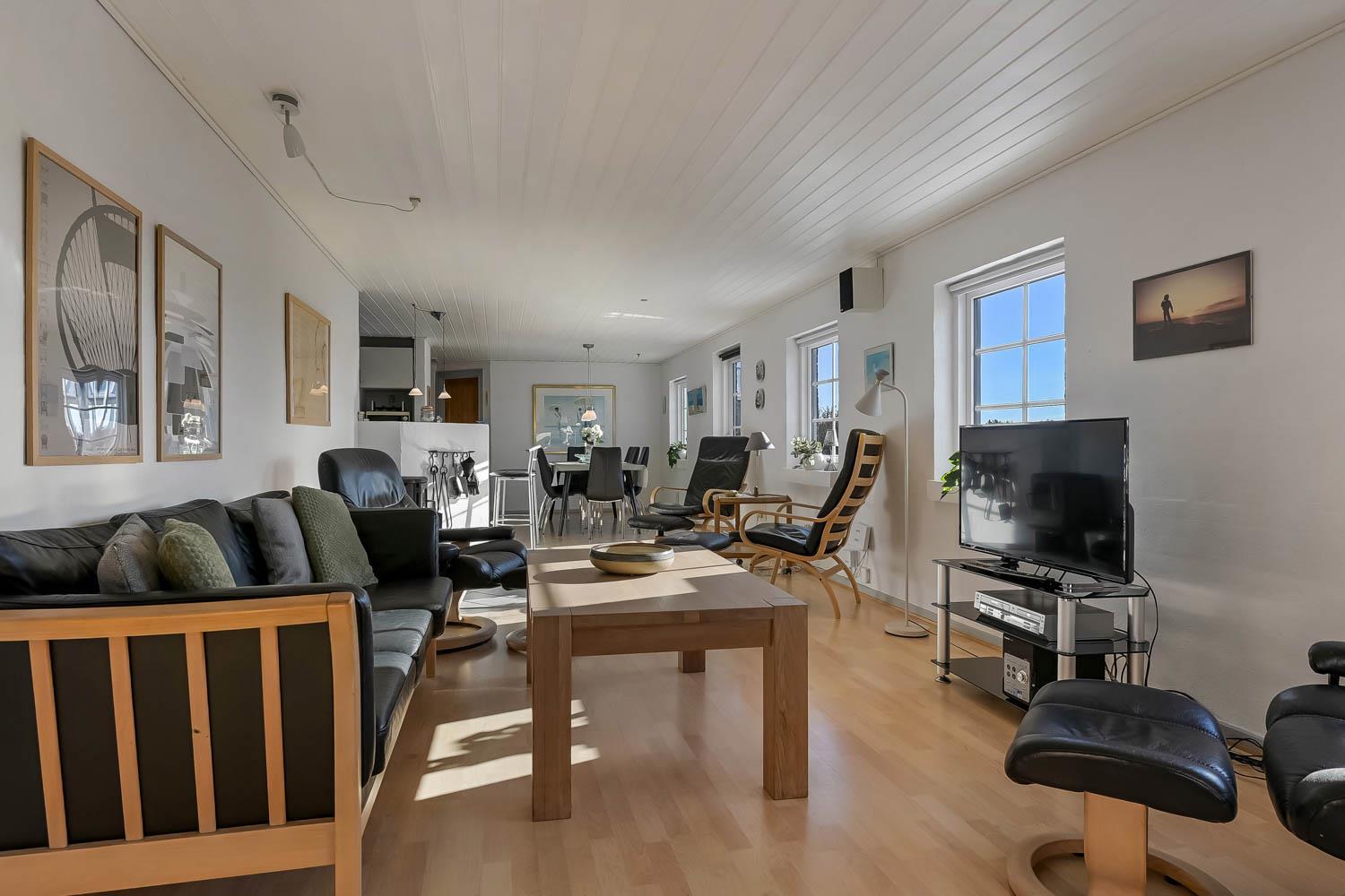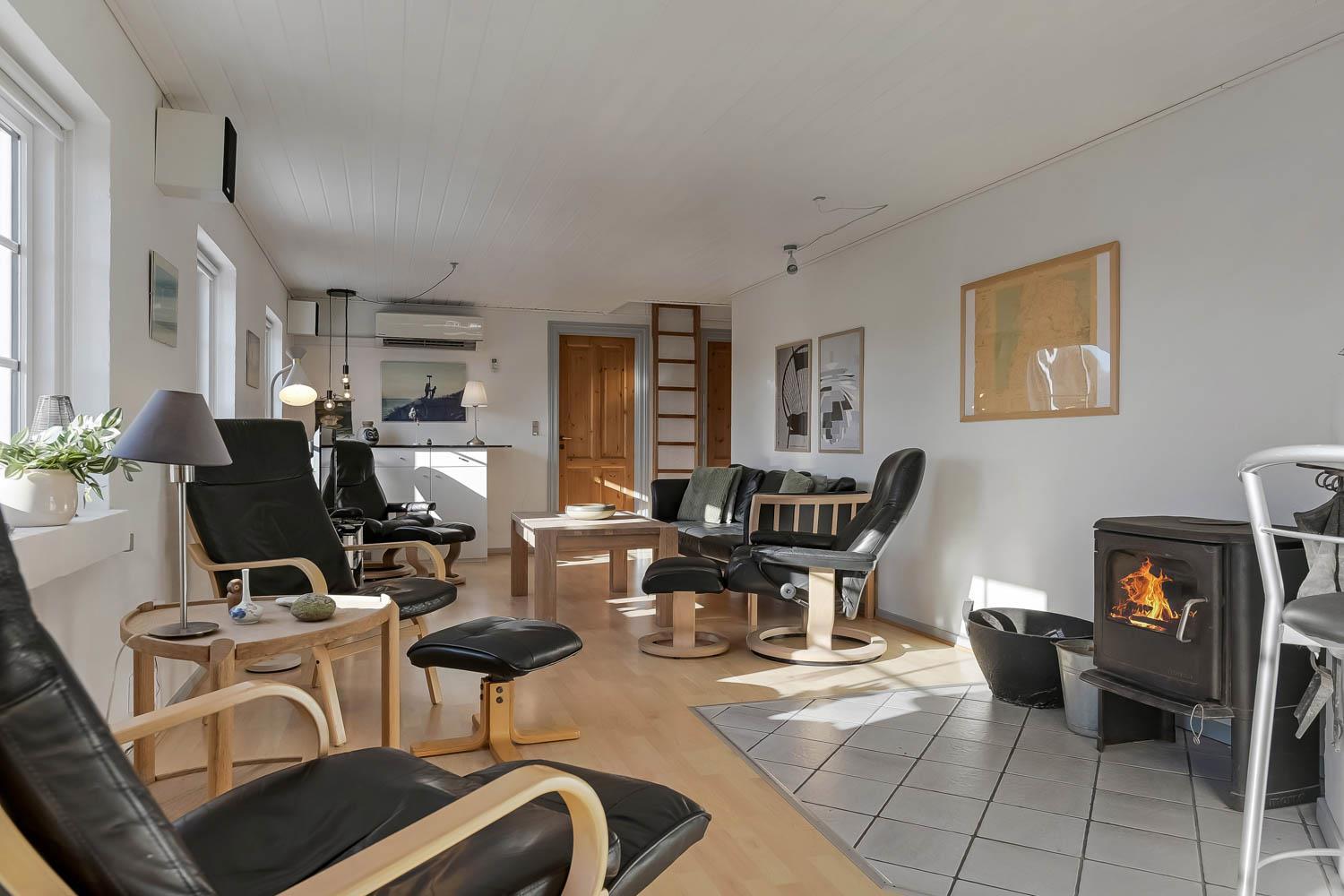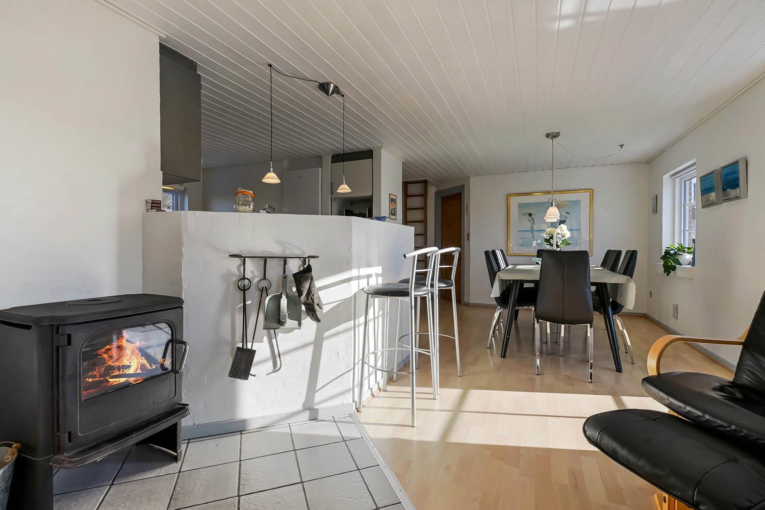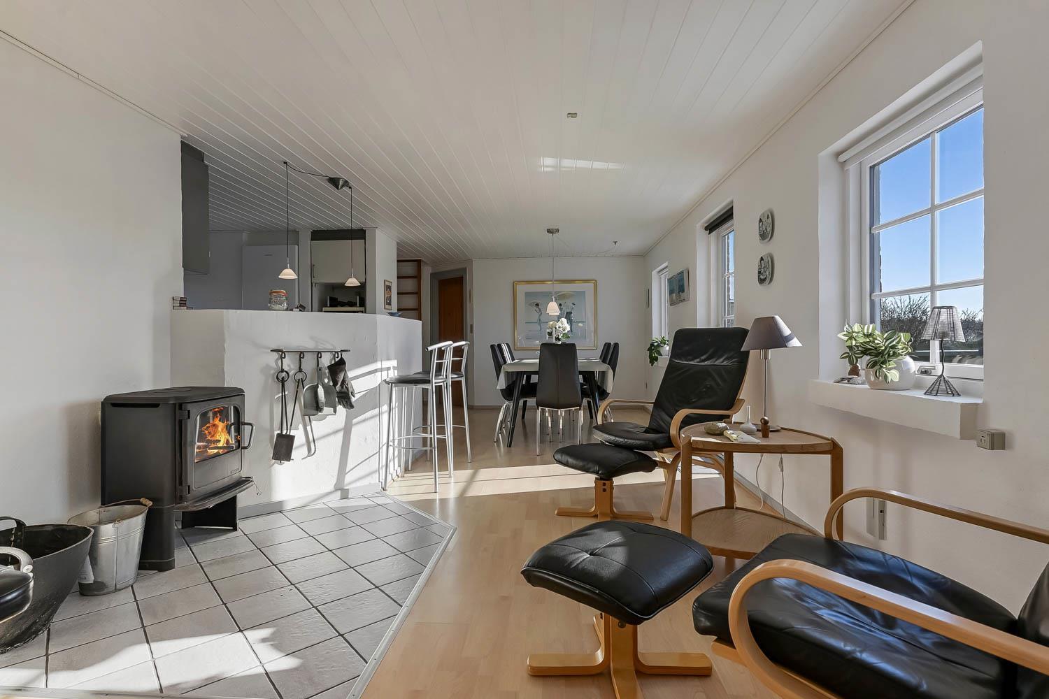 Dieses 120 m² große Haus wurde 1991 gebaut und im Jahr 2015 kontinuierlich renoviert. Es bietet ein helles und gemütliches Wohnzimmer mit Linoleumboden, das mit Ledermöbeln und einem Fernseher mit dänischen und deutschen Kanälen ausgestattet ist. Außerdem gibt es einen DVD- und CD-Player sowie ein Radio. Im Wohnzimmer befindet sich auch ein gemütlicher Kaminofen sowie eine Wärmepumpe, die zur Beheizung des Hauses beitragen. Die offene Küche ist in das Wohnzimmer und den Essbereich integriert, wo alle Gäste des Hauses Platz finden. Die Küche ist mit einem Glaskeramikherd, Abzugshaube, Mikrowelle, Kühl-/Gefrierschrank, Geschirrspüler und Fliesenboden ausgestattet. Das Haus verfügt über 3 gute Schlafzimmer, jedes mit einem Doppelbett. Im Wohnzimmer befindet sich der Aufgang zum Schlafboden, wo zwei weitere Schlafmöglichkeiten vorhanden sind. An beiden Enden des Hauses befindet sich ein Badezimmer. Eines der Badezimmer ist mit Toilette, Waschbecken, Dusche und Fliesenboden ausgestattet. Das andere Badezimmer verfügt ebenfalls über Toilette, Waschbecken, Dusche sowie einen Whirlpool und eine Sauna. Auch hier ist der Boden mit Fliesen belegt. Außerdem gibt es für die kleinsten Gäste einen Hochstuhl, ein Kinderbett, eine Babybadewanne und einen Wickeltisch. Sollte während des Urlaubs Wäsche gewaschen werden müssen, stehen Waschmaschine und Trockner zur Verfügung.