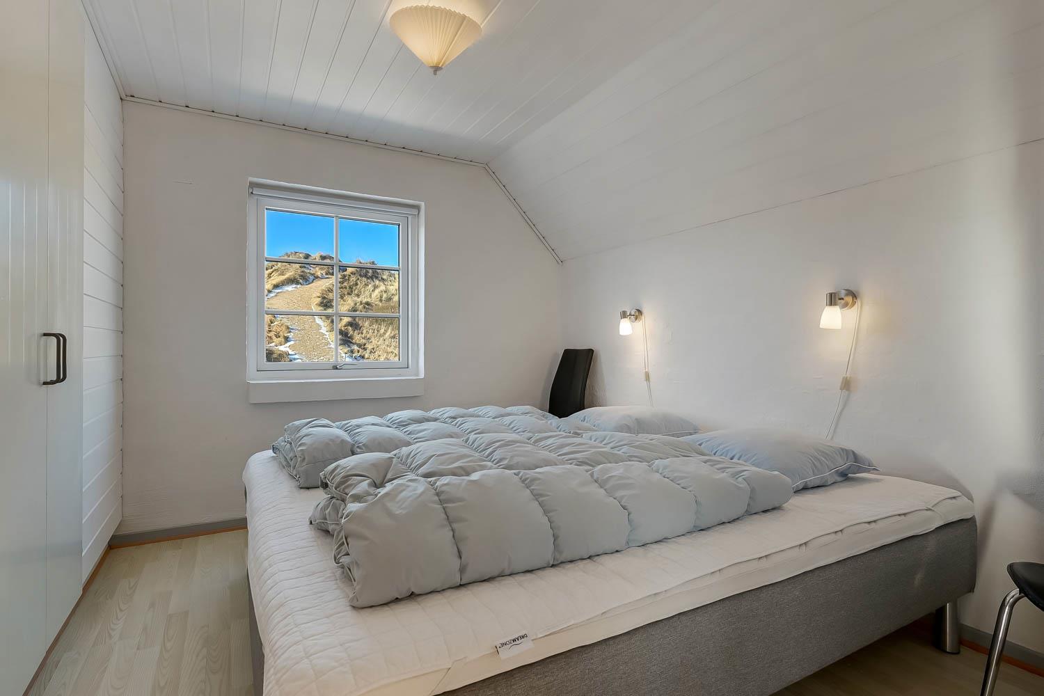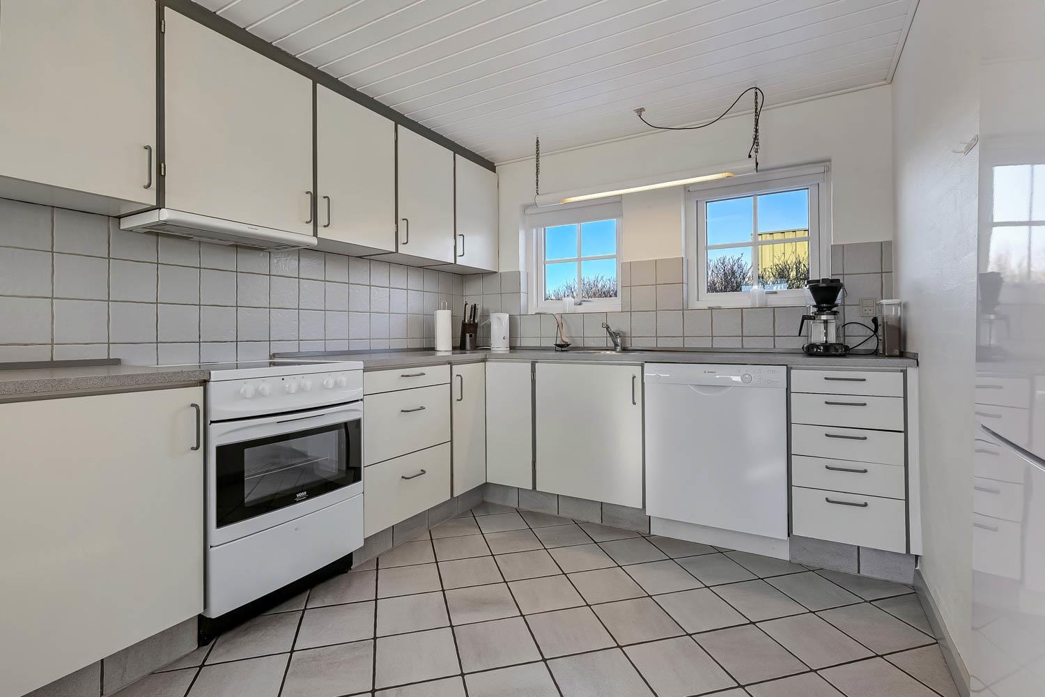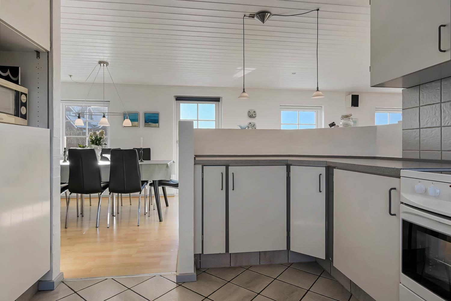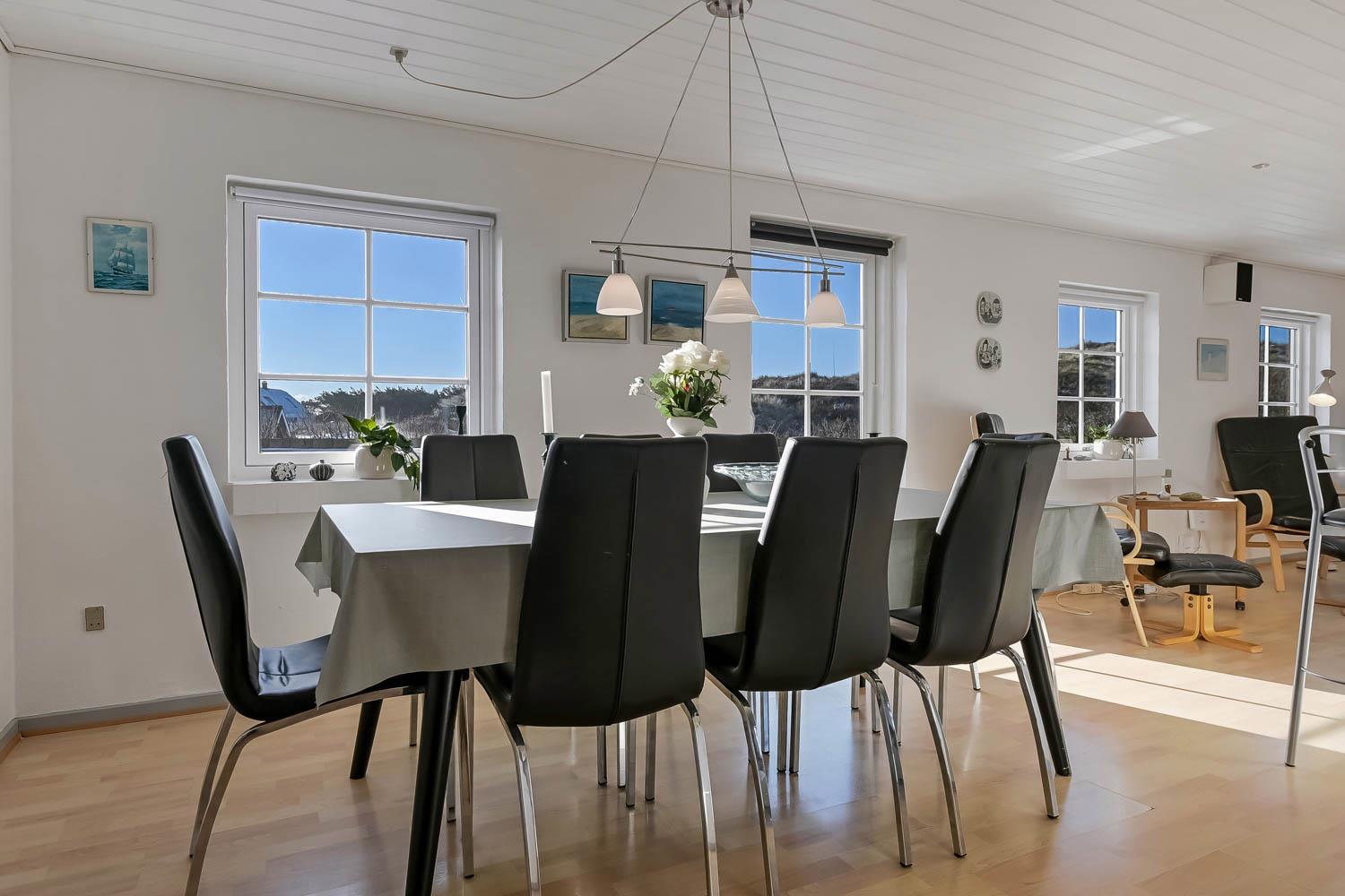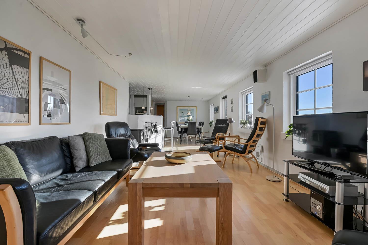 Dieses 120 m² große Haus wurde 1991 gebaut und im Jahr 2015 kontinuierlich renoviert. Es bietet ein helles und gemütliches Wohnzimmer mit Linoleumboden, das mit Ledermöbeln und einem Fernseher mit dänischen und deutschen Kanälen ausgestattet ist. Außerdem gibt es einen DVD- und CD-Player sowie ein Radio. Im Wohnzimmer befindet sich auch ein gemütlicher Kaminofen sowie eine Wärmepumpe, die zur Beheizung des Hauses beitragen. Die offene Küche ist in das Wohnzimmer und den Essbereich integriert, wo alle Gäste des Hauses Platz finden. Die Küche ist mit einem Glaskeramikherd, Abzugshaube, Mikrowelle, Kühl-/Gefrierschrank, Geschirrspüler und Fliesenboden ausgestattet. Das Haus verfügt über 3 gute Schlafzimmer, jedes mit einem Doppelbett. Im Wohnzimmer befindet sich der Aufgang zum Schlafboden, wo zwei weitere Schlafmöglichkeiten vorhanden sind. An beiden Enden des Hauses befindet sich ein Badezimmer. Eines der Badezimmer ist mit Toilette, Waschbecken, Dusche und Fliesenboden ausgestattet. Das andere Badezimmer verfügt ebenfalls über Toilette, Waschbecken, Dusche sowie einen Whirlpool und eine Sauna. Auch hier ist der Boden mit Fliesen belegt. Außerdem gibt es für die kleinsten Gäste einen Hochstuhl, ein Kinderbett, eine Babybadewanne und einen Wickeltisch. Sollte während des Urlaubs Wäsche gewaschen werden müssen, stehen Waschmaschine und Trockner zur Verfügung.