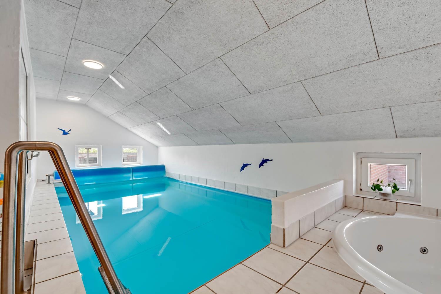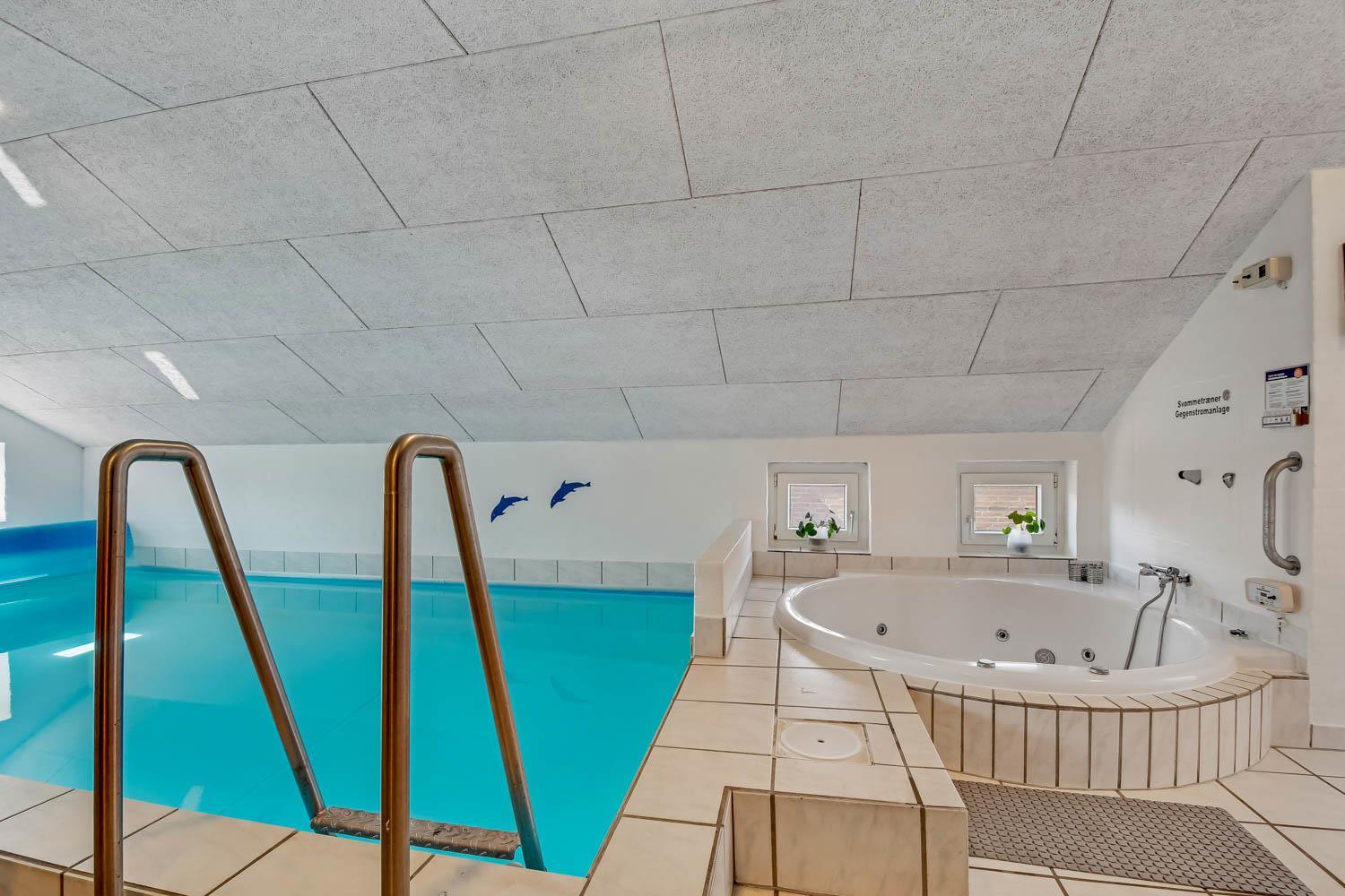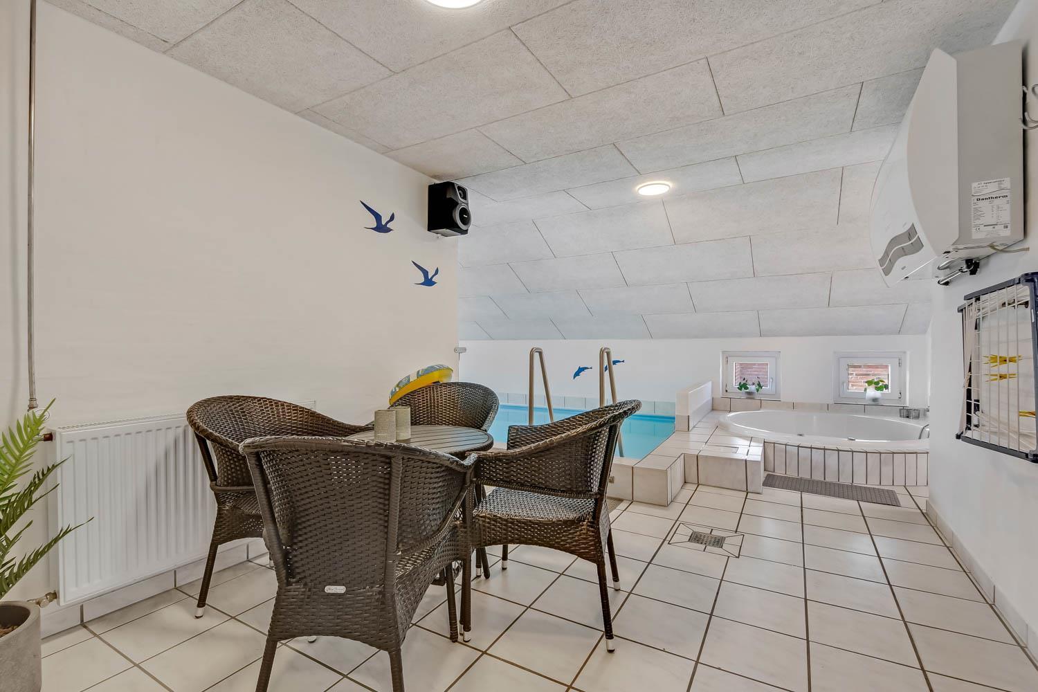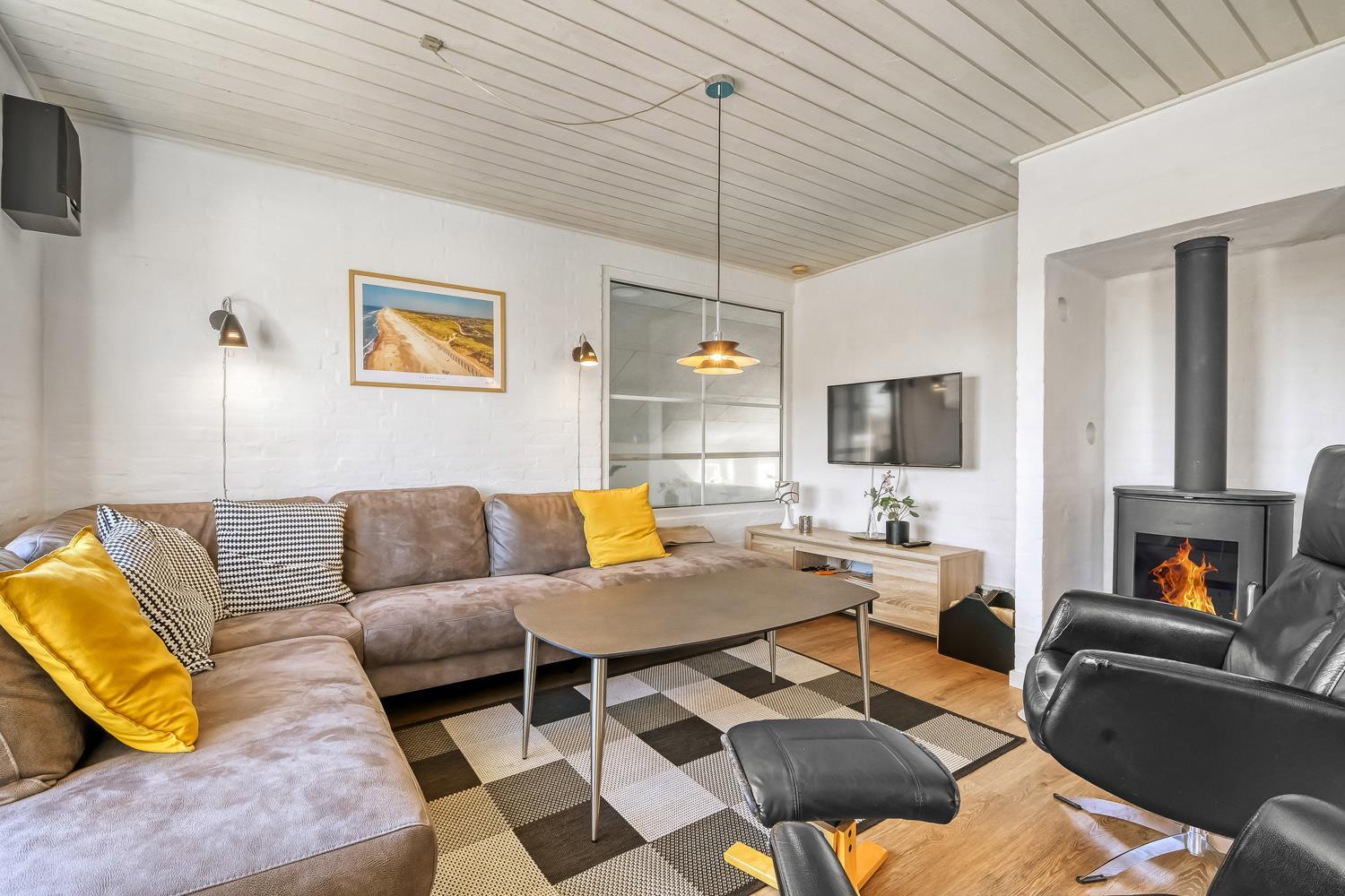 Gemütlich eingerichtetes Wohnzimmer mit bequemen Möbeln, Holzofen, Flachbildschirm-TV mit dänischem (DR1, TV2) und deutschem Programm (Satellitenempfang). Hauswirtschaftsraum mit Waschmaschine und Wäschetrockner. Sehr gut ausgestattete Küche mit Geschirrspüler, Mikrowelle und Kühlschrank mit Gefrierfach. 4 Schlafzimmer mit Doppelbetten (DB) und Einzelbetten (EB): 1 DB + 1 DB + 2 EB + 2 EB und ein Hems (Schlafboden) mit 2 weiteren Schlafmöglichkeiten. Für die kleinen Gäste gibt es ein Kinderbett und einen Hochstuhl. Im Poolraum befinden sich der Pool mit Gegenstromanlage und ein 4-5-Personen-Whirlpool. Von hier haben Sie Zugang zu einem Badezimmer mit Sauna, Dusche, Toilette und Waschbecken. Das zweite Badezimmer ist mit Dusche, Waschbecken, Toilette und Fußbodenheizung ausgestattet. Das Haus hat Erdwärme und ist später nachisoliert worden mit 400 mm – was es sehr Energiefreundlich macht. 2 Haustiere sind erlaubt. Kaution Wintersaison EUR 400 und Sommersaison EUR 300