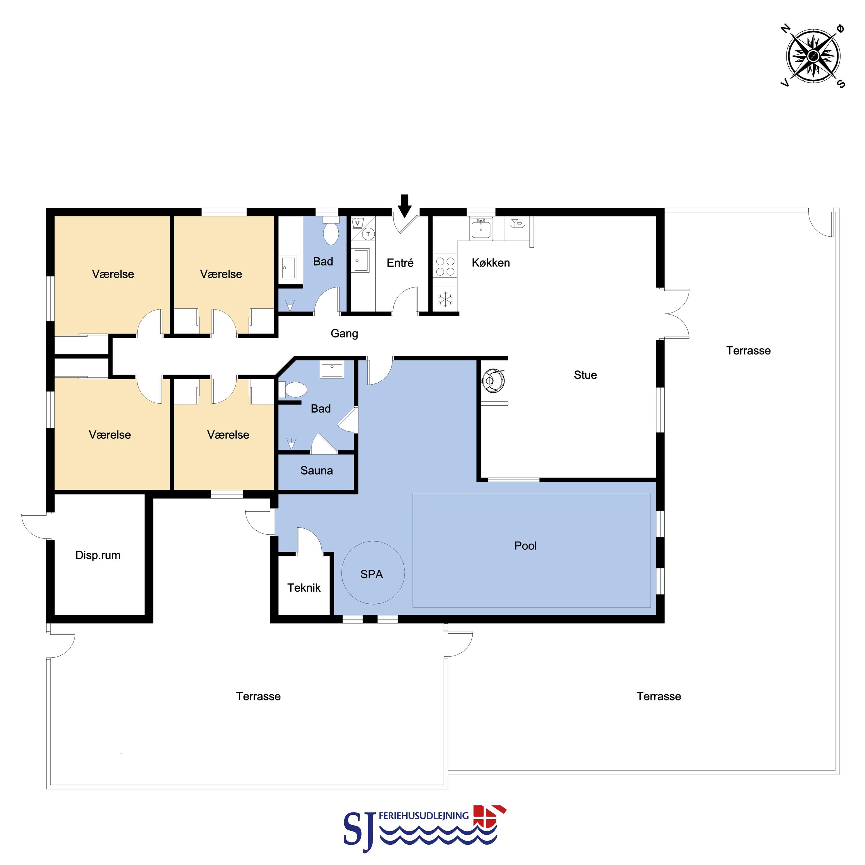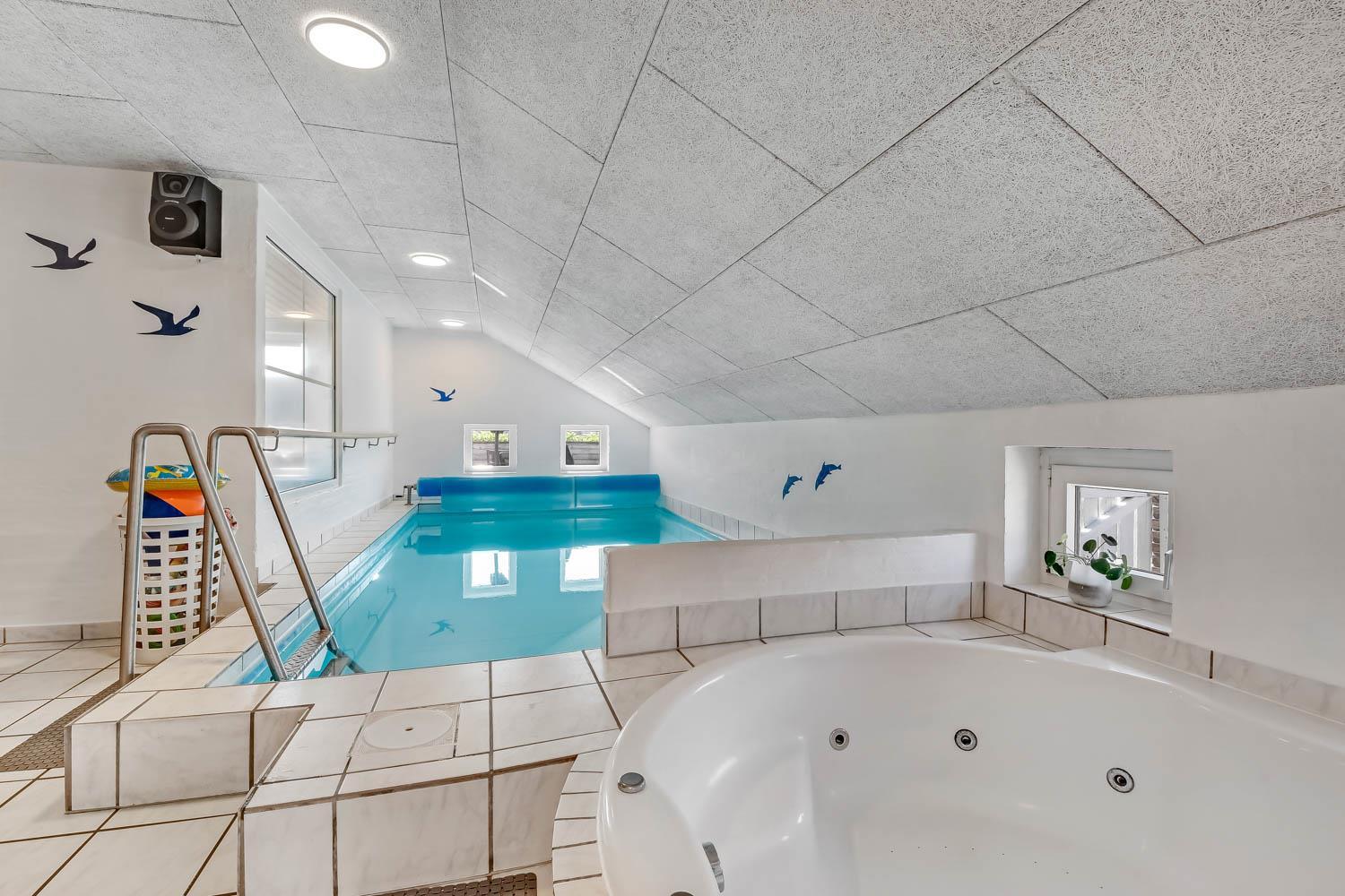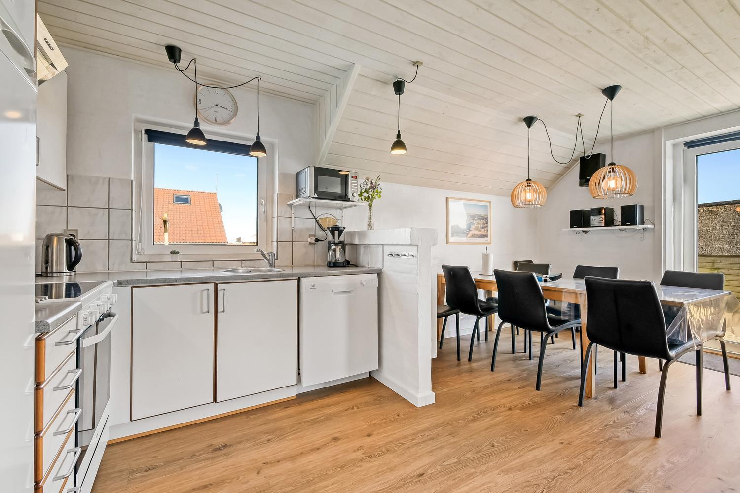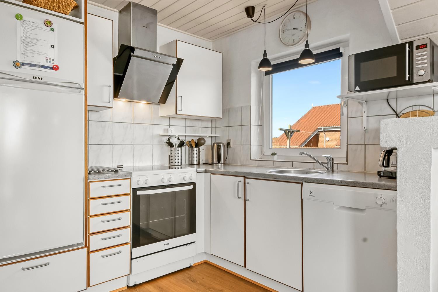 Gemütlich eingerichtetes Wohnzimmer mit bequemen Möbeln, Holzofen, Flachbildschirm-TV mit dänischem (DR1, TV2) und deutschem Programm (Satellitenempfang). Hauswirtschaftsraum mit Waschmaschine und Wäschetrockner. Sehr gut ausgestattete Küche mit Geschirrspüler, Mikrowelle und Kühlschrank mit Gefrierfach. 4 Schlafzimmer mit Doppelbetten (DB) und Einzelbetten (EB): 1 DB + 1 DB + 2 EB + 2 EB und ein Hems (Schlafboden) mit 2 weiteren Schlafmöglichkeiten. Für die kleinen Gäste gibt es ein Kinderbett und einen Hochstuhl. Im Poolraum befinden sich der Pool mit Gegenstromanlage und ein 4-5-Personen-Whirlpool. Von hier haben Sie Zugang zu einem Badezimmer mit Sauna, Dusche, Toilette und Waschbecken. Das zweite Badezimmer ist mit Dusche, Waschbecken, Toilette und Fußbodenheizung ausgestattet. Das Haus hat Erdwärme und ist später nachisoliert worden mit 400 mm – was es sehr Energiefreundlich macht. 2 Haustiere sind erlaubt. Kaution Wintersaison EUR 400 und Sommersaison EUR 300