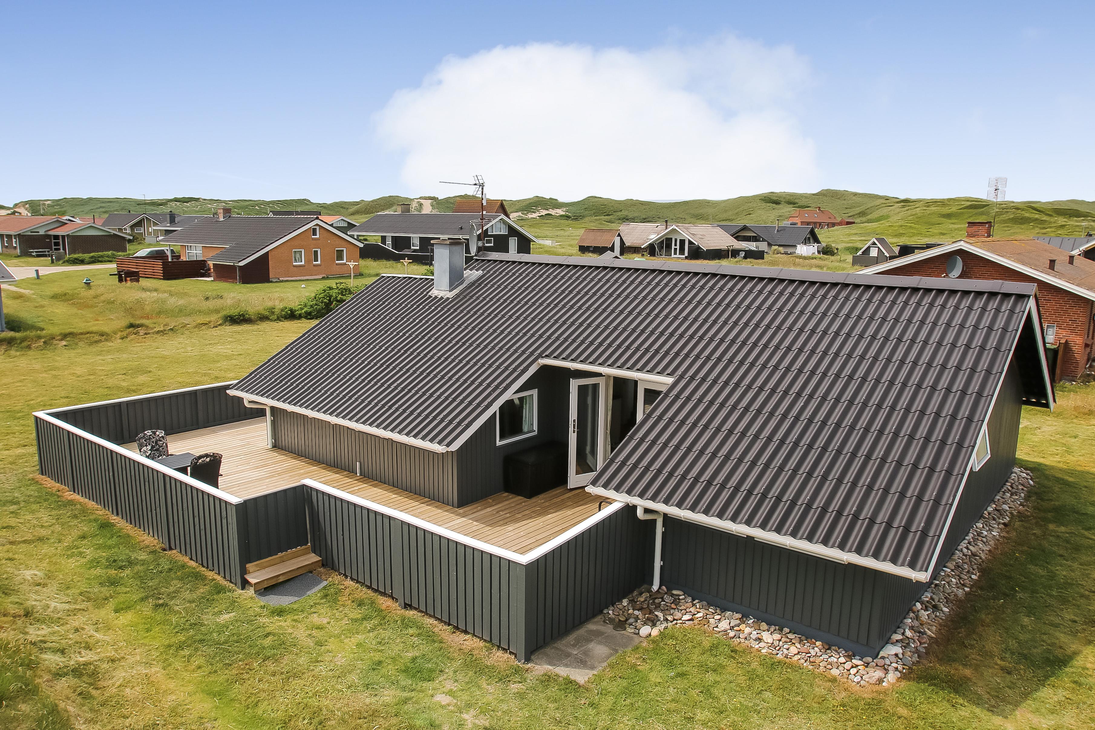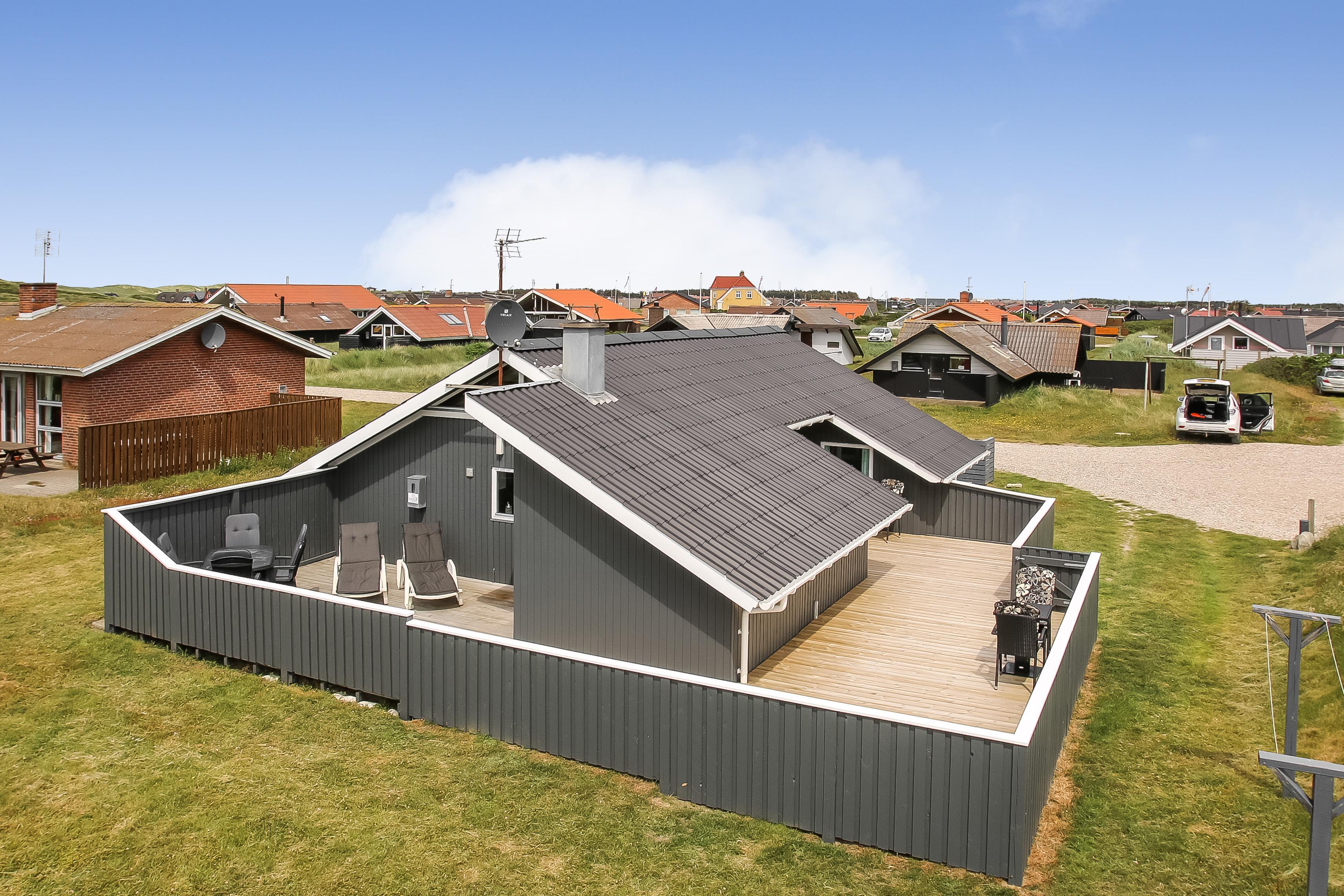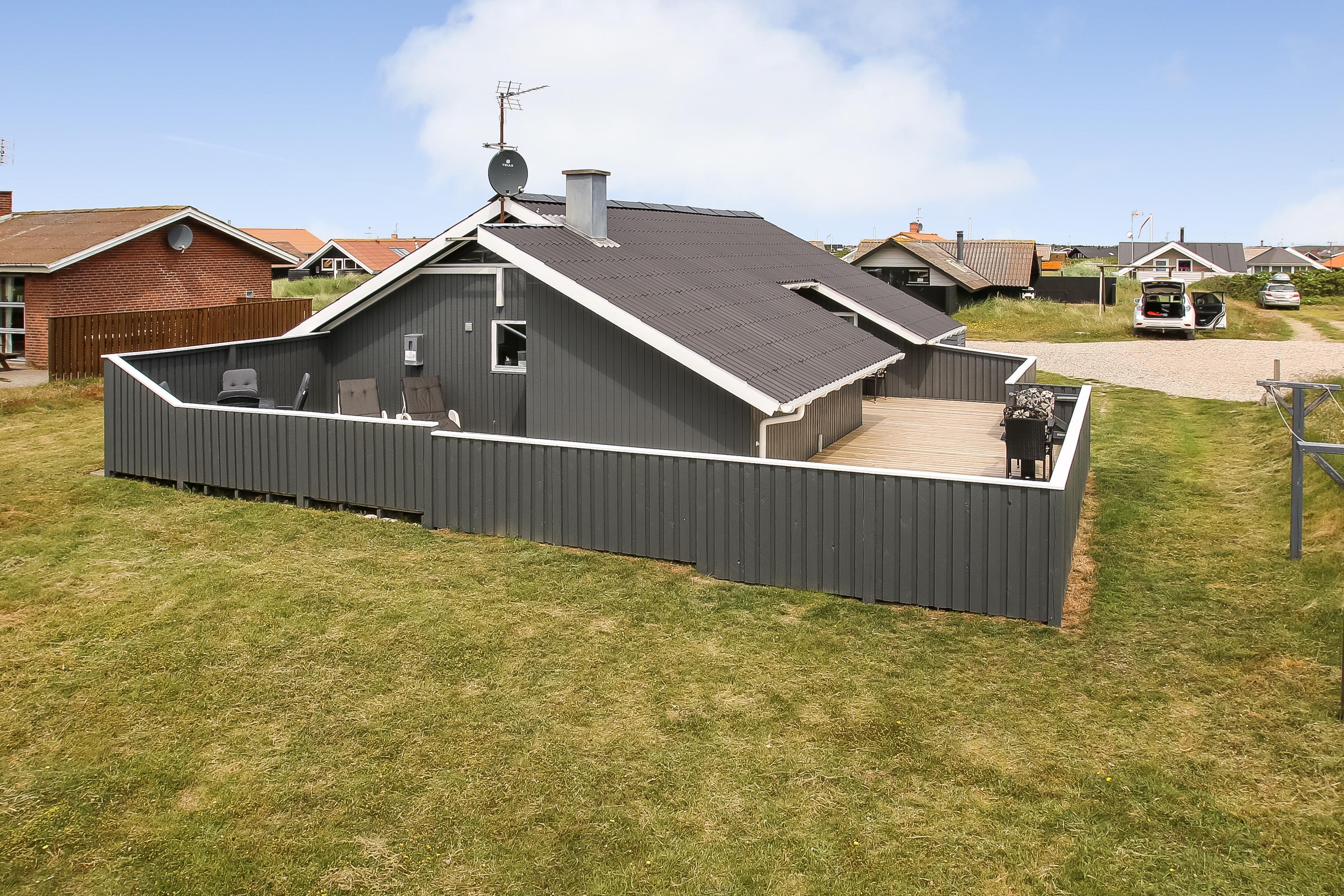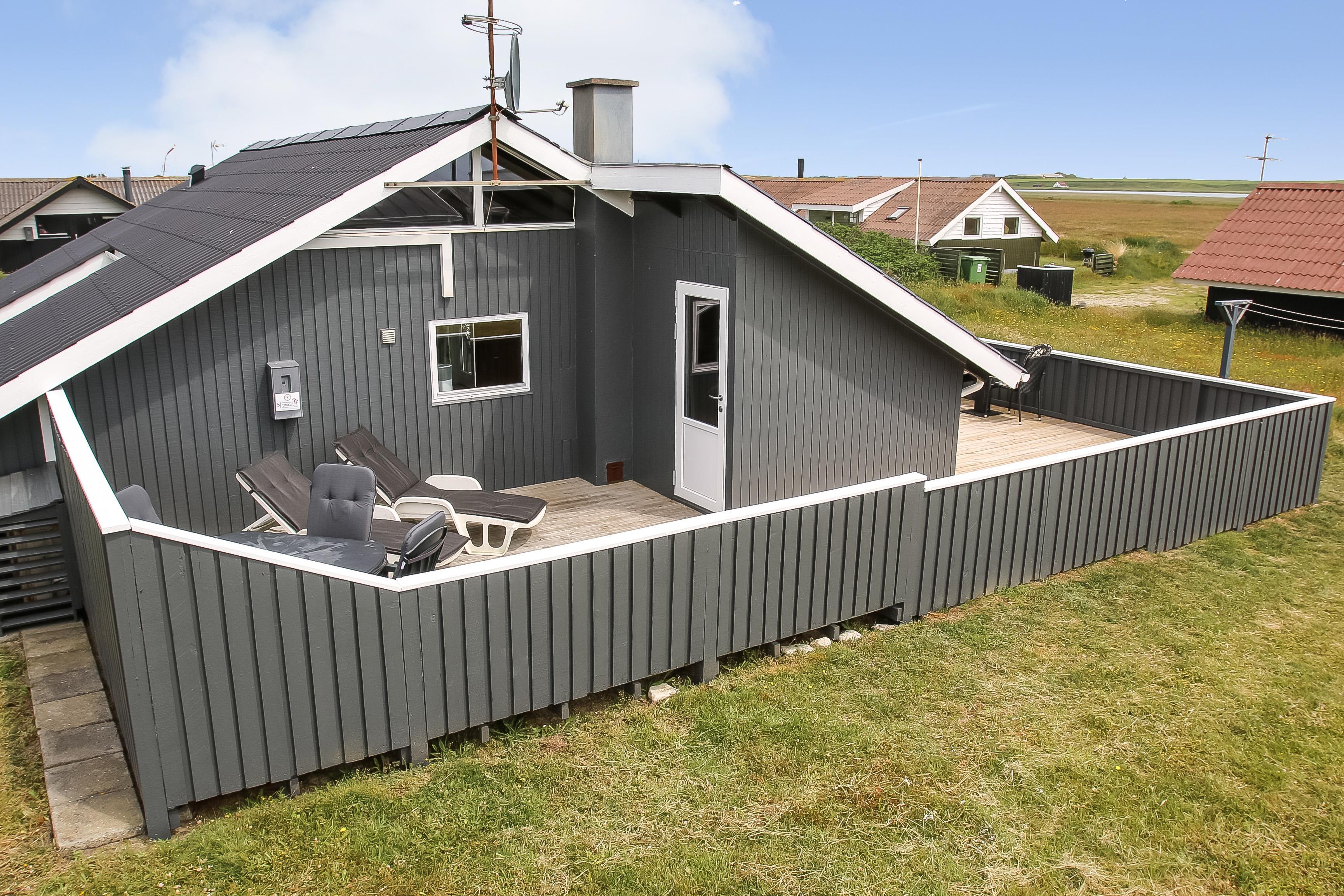 Der Ausgang vom Wohnraum führt auf eine schöne eingezäunte Holzterrasse mit Gartenmöbeln, Grill und Sonnenliegen. Eine fantastische Terrasse, die perfekt für die Familie mit Kindern und Hund ist. Setzen Sie sich auf die Terrasse und geniessen Sie die Aussicht, während die Sonne hinter den hohen Dünen untergeht. Bewegen Sie die Gartenmöbel und geniessen Sie den ganzen Tag von morgens bis abends die Sonne. Nur etwa 275 m vom Haus entfernt befindet sich die rauschende Nordsee, die jeden Tag ein neues malerisches Erlebnis bietet und Sie haben einen Blick auf den Ferring See. Es gibt viele Möglichkeiten für Wanderungen, laufen oder eine Fahrradtour. In der Saison können Sie Ihre Brötchen und Einkäufe beim Kaufmann in der Nähe tätigen, oder die Familien zum Essen einladen. Der Weg beträgt nur 5-10 Min. zu Fuss vom Haus. Perfekt für die kleine Familie, die das ganze Jahr über eine zentrale Lage in einer schönen Umgebung sucht.