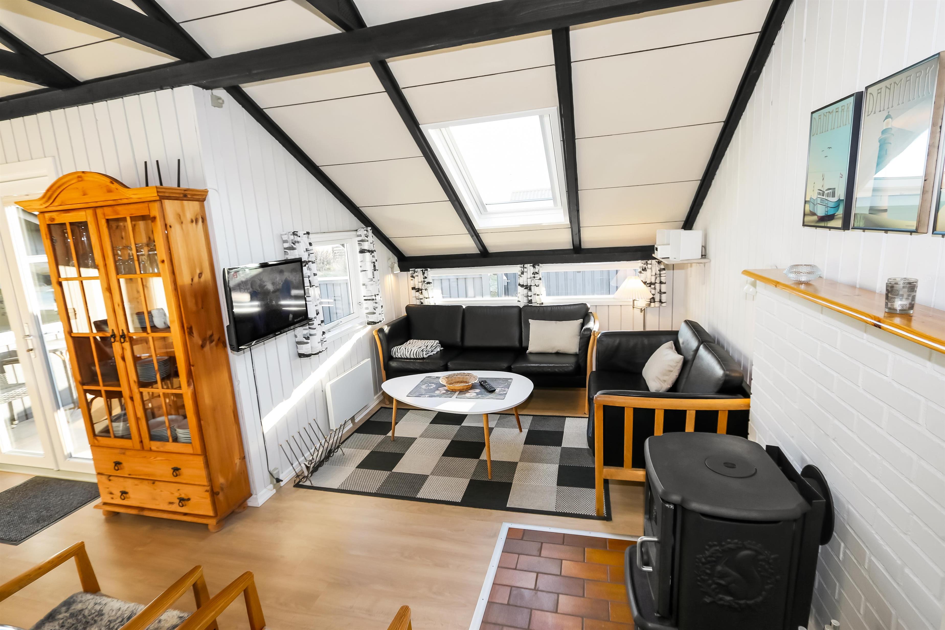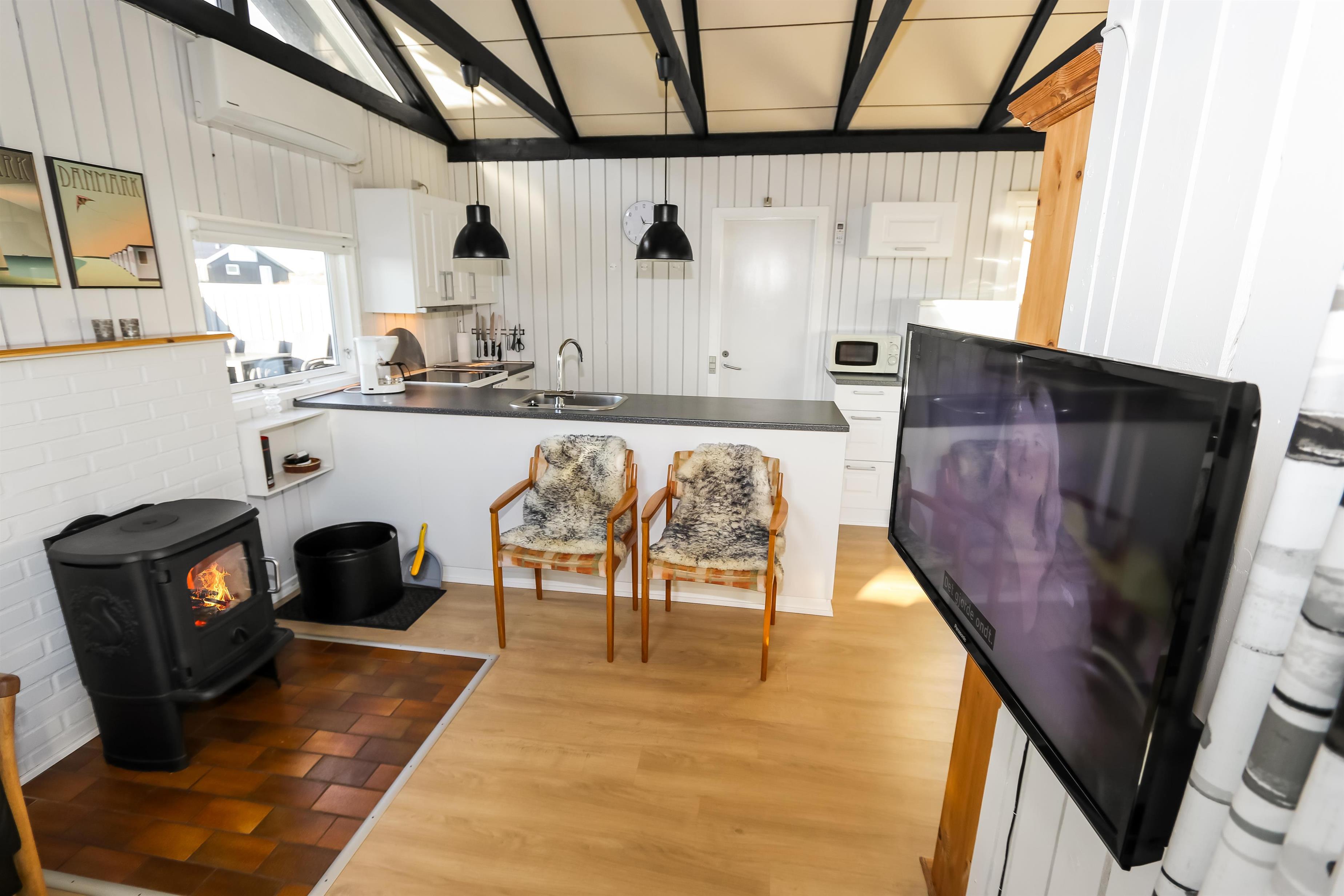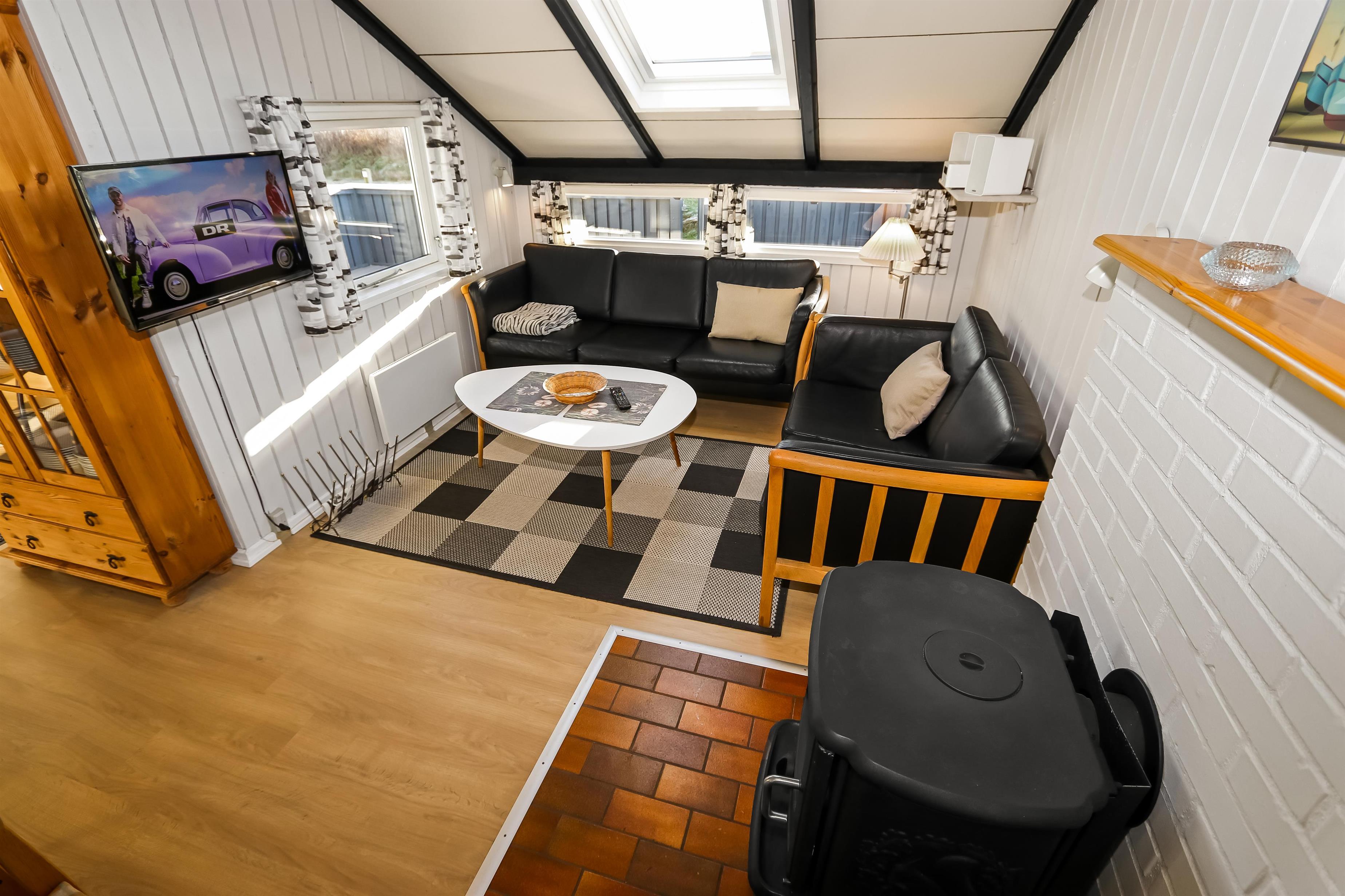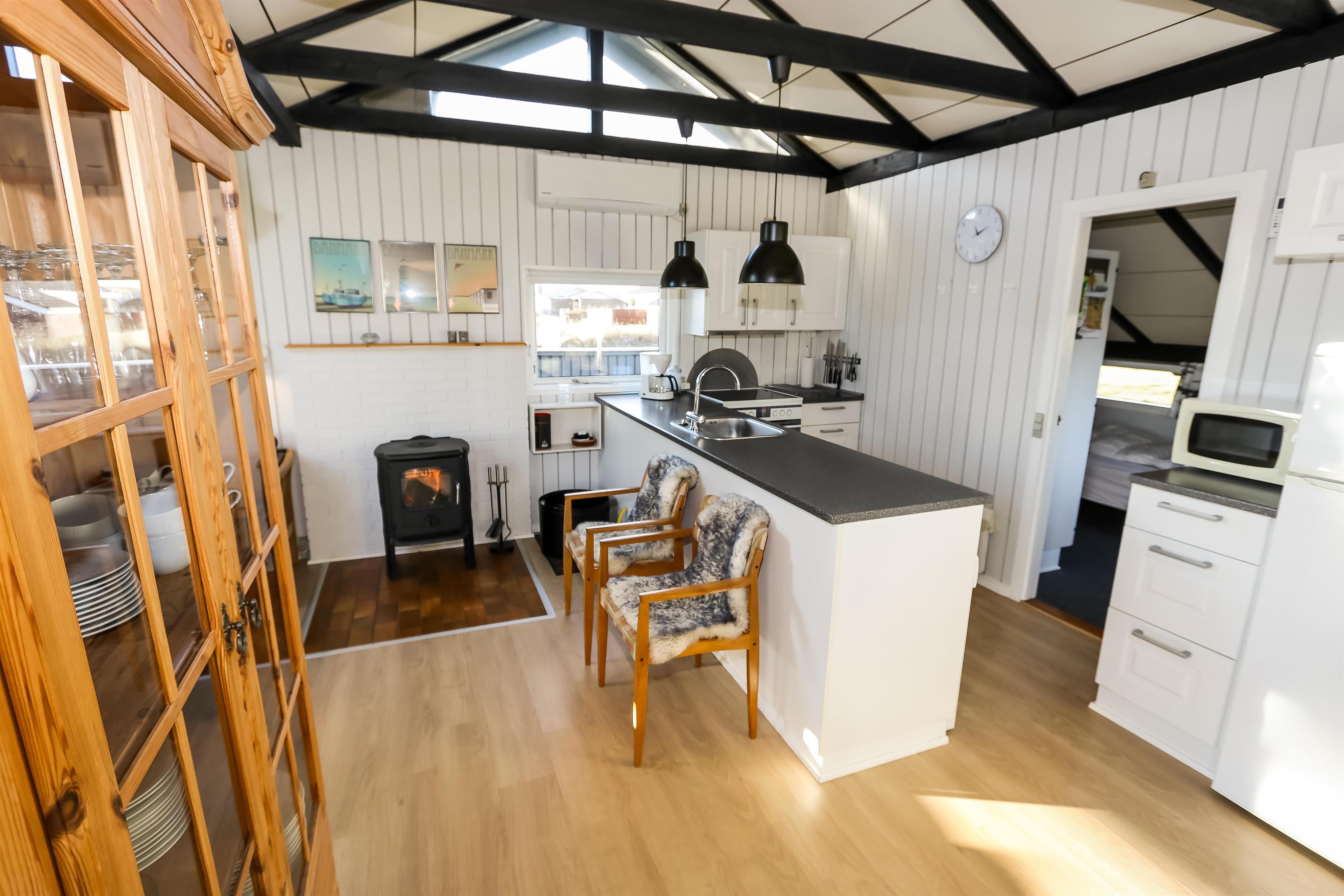 Ein gut ausgenutztes Holzhaus mit 64 m² und mit freiem WLAN. Sie parken das Auto gerade am Haus und den Eingang zum Haus erreichen Sie über die geschlossene Terrasse. 3 Schlafräume: 1DB + 2B + 1B mit Teppichböden. Gemütlicher Wohnraum mit neuen Ledermöbeln, TV mit dänischen und deutschen Programmen. Der neue schöne Kaminofen betont den Komfort des Raumes und zusammen mit der neuen Wärempumpe wird der Verbrauch im Haus minimiert. Gute Küchenecke mit Herd mit Cerankochfeld, Abzugshaube, Kühlschrank mit kleinem Gefrierfach, Geschirrspüler und Waschmaschine. Es gibt praktische Holzböden im Küchenbereich und dem Aufenthaltsraum. Das Badezimmer ist neu renoviert in wunderschön abgestimmten Farben und hat Fliesenboden mit Fussbodenheizung, Toilette, Waschbecken und Dusche. 2 Haustier ist erlaubt. Nichtraucher-Haus.