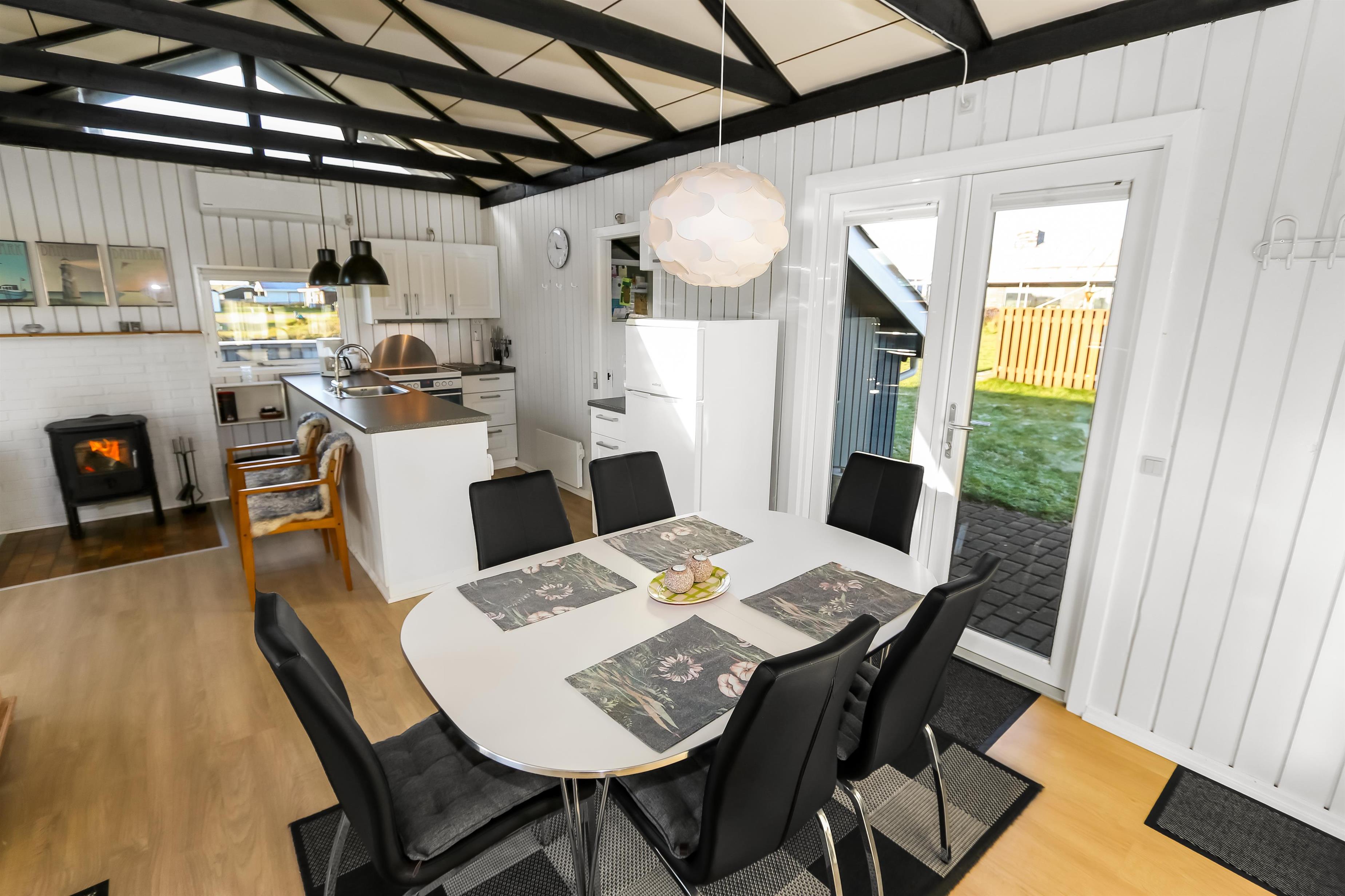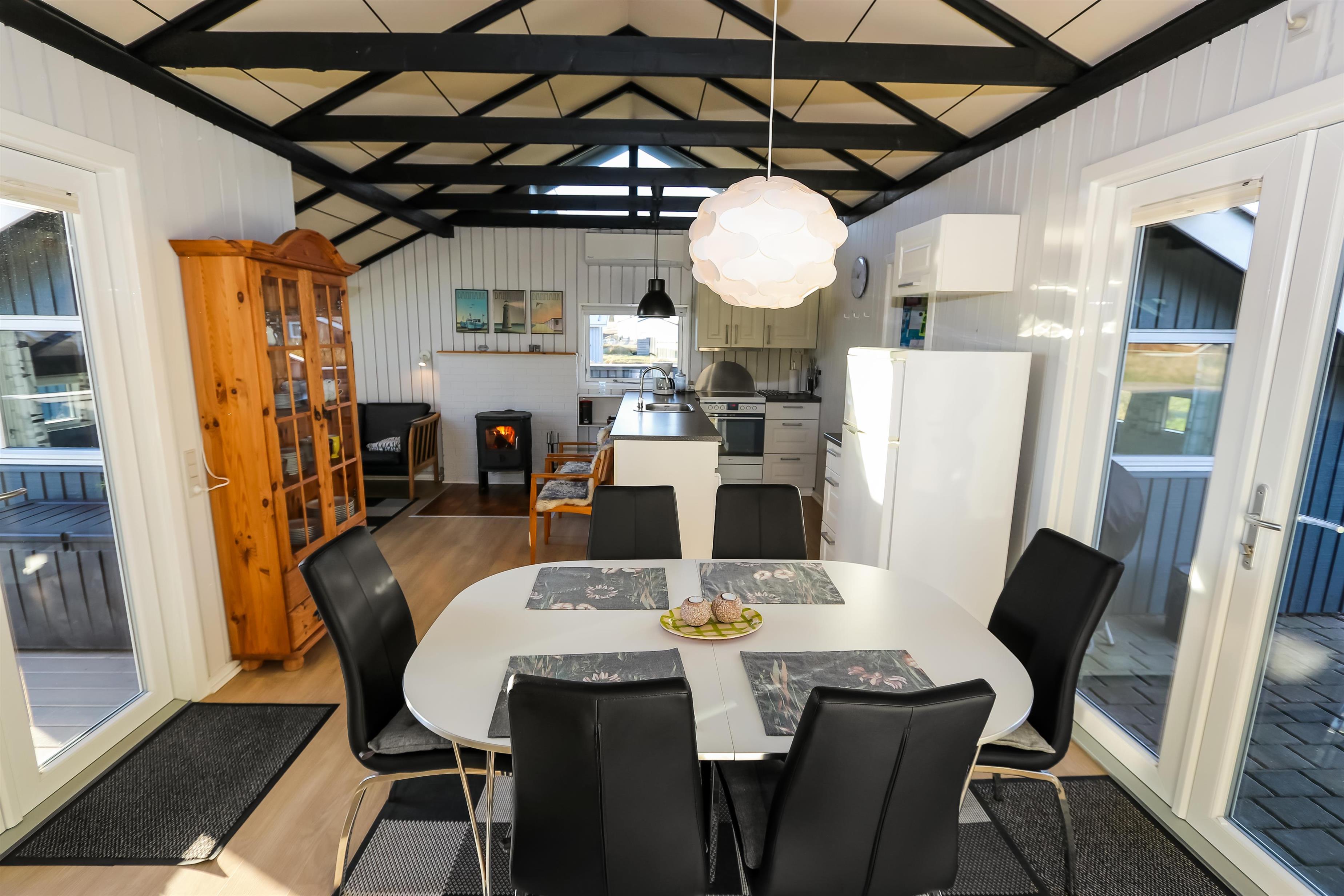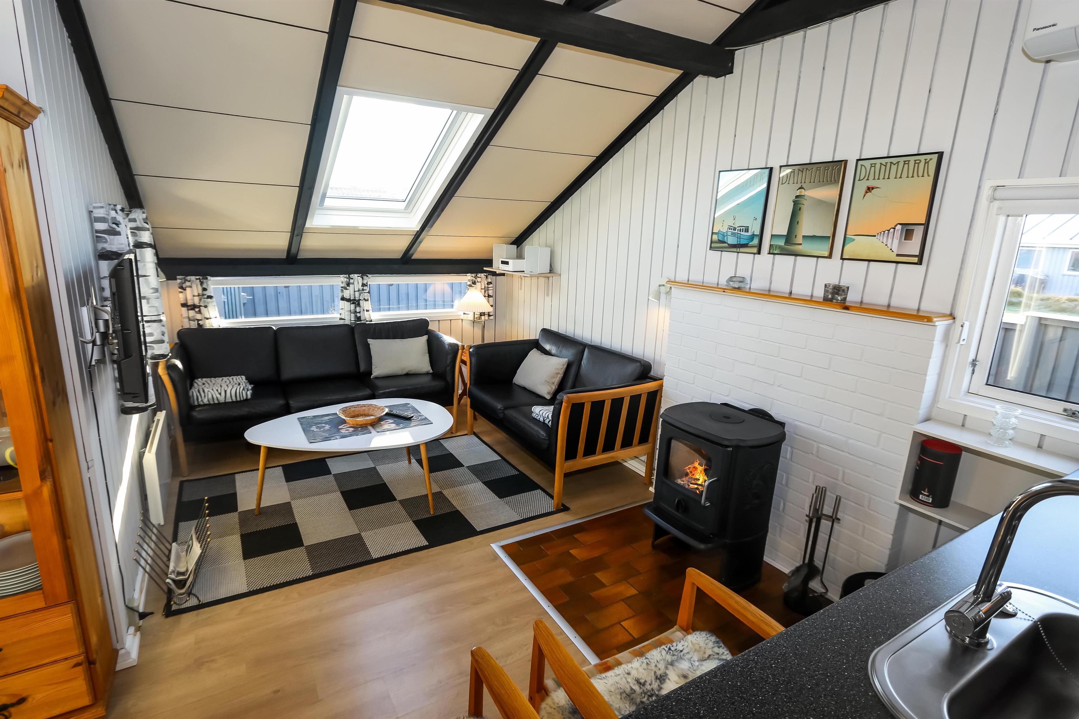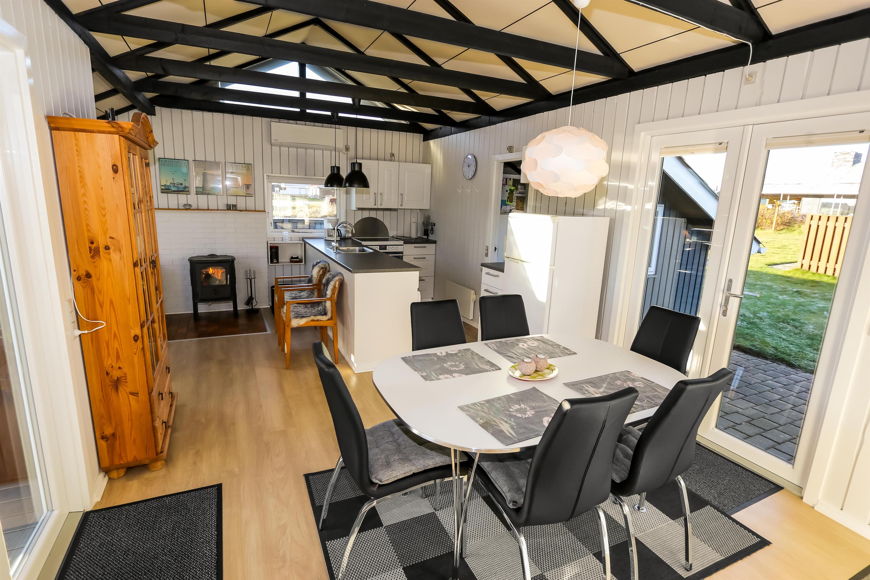 Ein gut ausgenutztes Holzhaus mit 64 m² und mit freiem WLAN. Sie parken das Auto gerade am Haus und den Eingang zum Haus erreichen Sie über die geschlossene Terrasse. 3 Schlafräume: 1DB + 2B + 1B mit Teppichböden. Gemütlicher Wohnraum mit neuen Ledermöbeln, TV mit dänischen und deutschen Programmen. Der neue schöne Kaminofen betont den Komfort des Raumes und zusammen mit der neuen Wärempumpe wird der Verbrauch im Haus minimiert. Gute Küchenecke mit Herd mit Cerankochfeld, Abzugshaube, Kühlschrank mit kleinem Gefrierfach, Geschirrspüler und Waschmaschine. Es gibt praktische Holzböden im Küchenbereich und dem Aufenthaltsraum. Das Badezimmer ist neu renoviert in wunderschön abgestimmten Farben und hat Fliesenboden mit Fussbodenheizung, Toilette, Waschbecken und Dusche. 2 Haustier ist erlaubt. Nichtraucher-Haus.