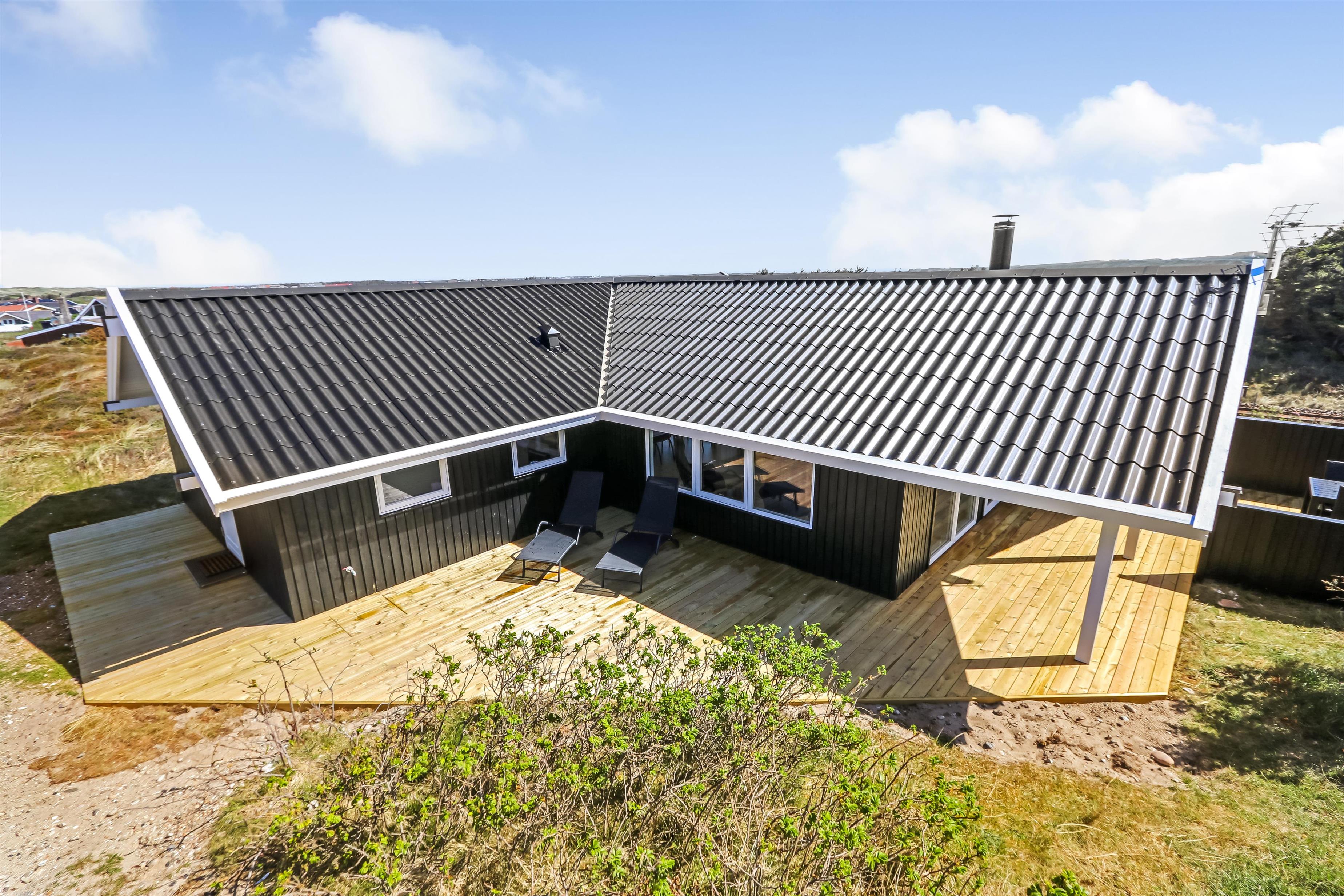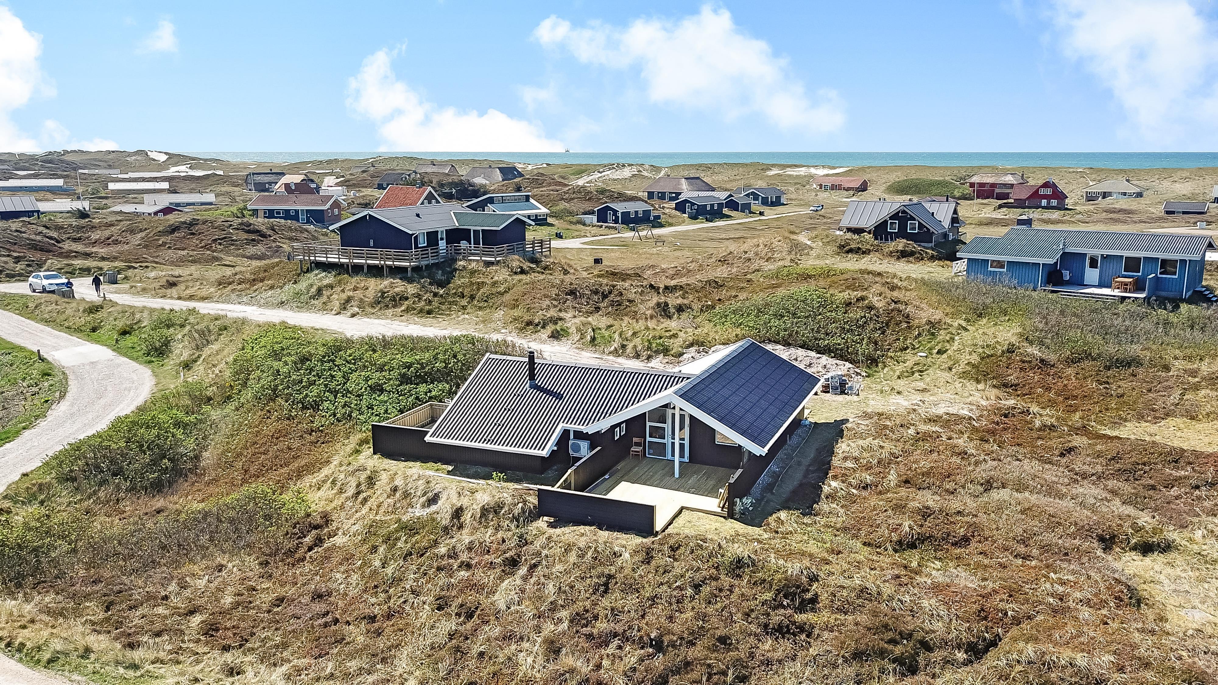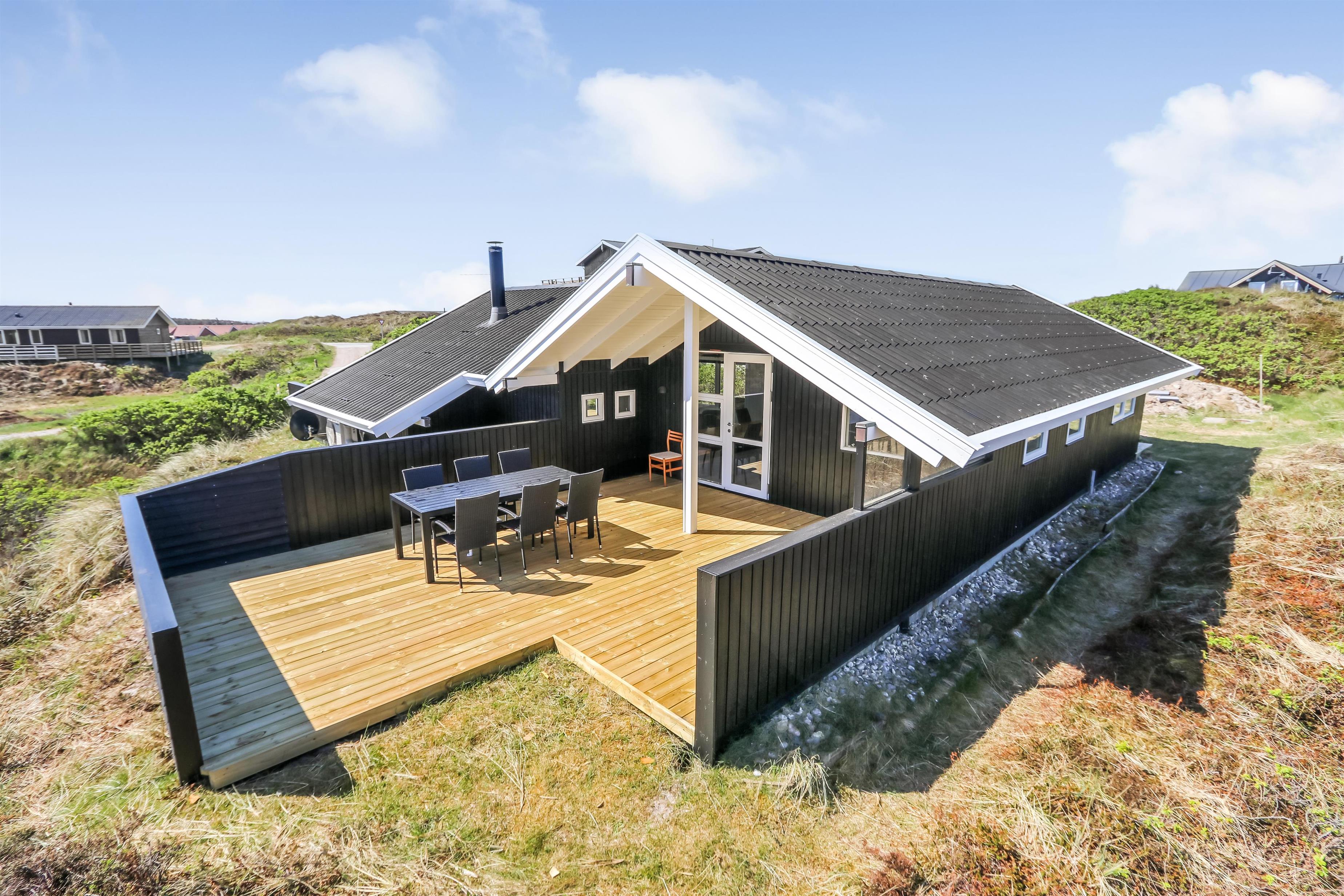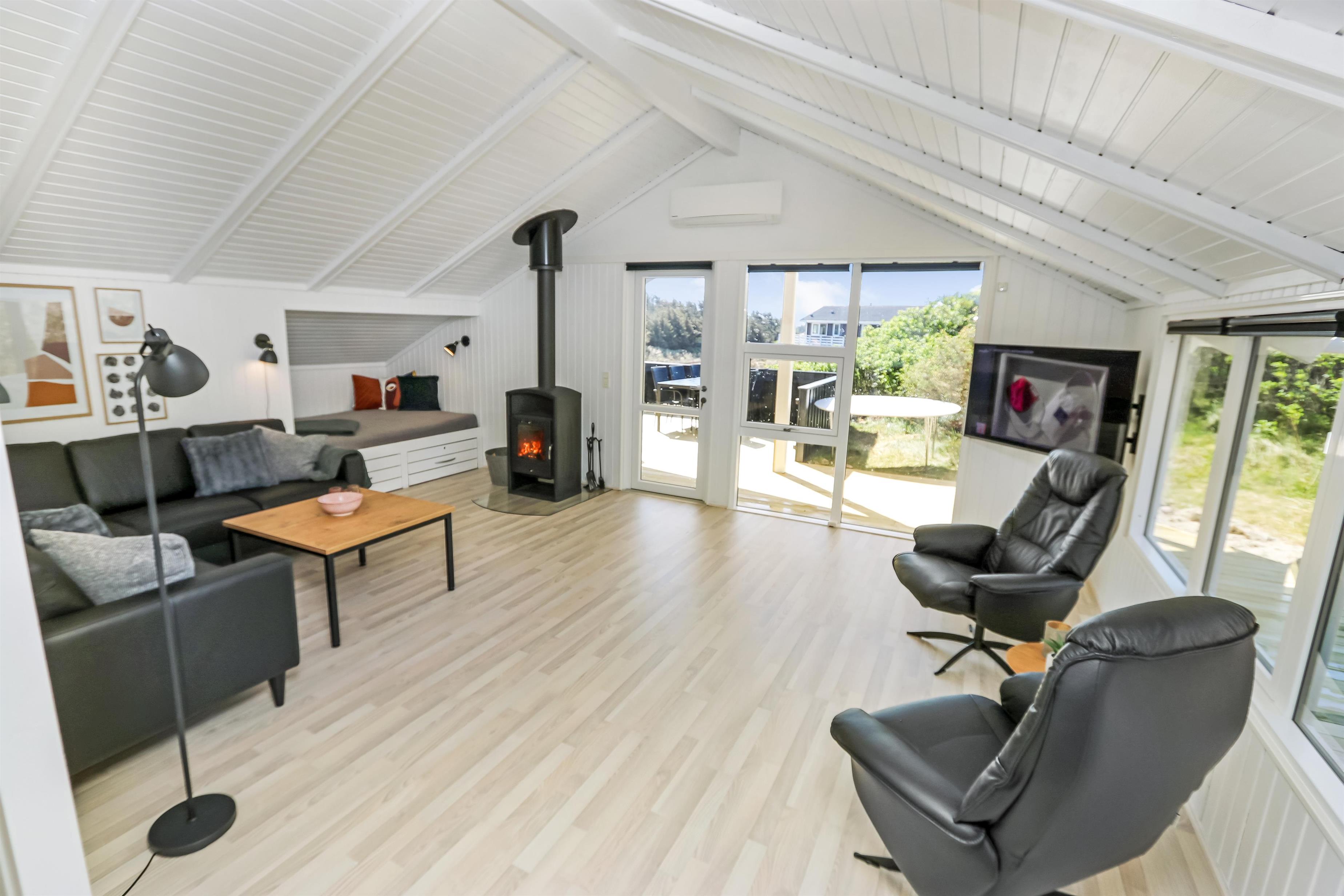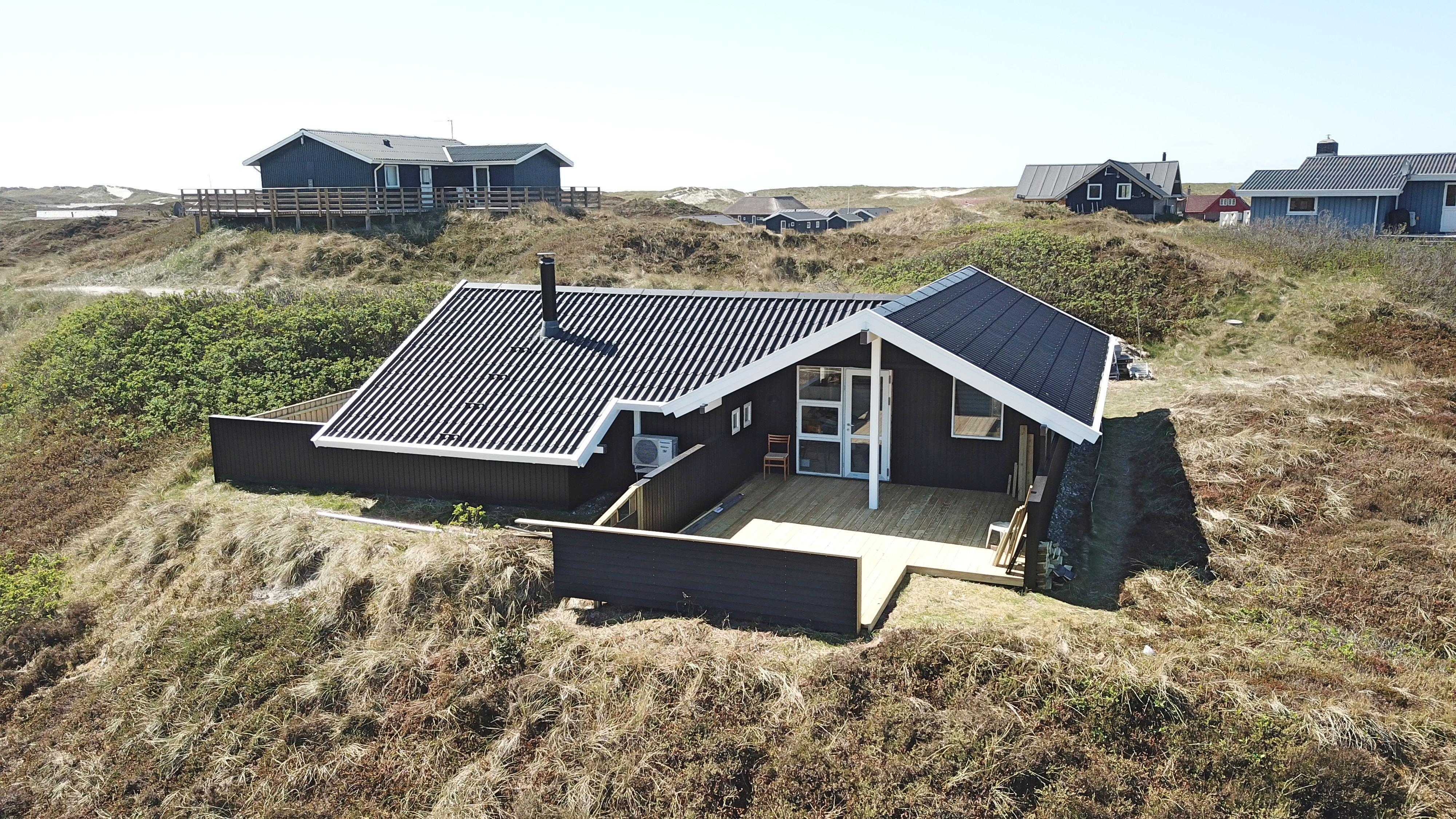 Auf einem schönen hügeligen Naturgrundstück und bloss 200 m von der Nordsee entfernt, liegt dieses prachtvolle Ferienhaus mit 76 m². Das Haus wurde in 1989 erbaut – aber in 2020 total renoviert -. Das Haus ist minimalistisch in seinem Ausdruck und praktisch eingerichtet. Ein Flur mit extra Platz zum Ablegen heisst Sie wilkommen. Kombinierter Wohnraum und Küchenecke mit einem offenen Dachboden. Der Wohnraum ist mit neuen schönen Ledermöbeln, Esstisch, Smart-TV mit dänischen und deutschen Programmen und der Möglichkeit für Streaming von TV/Radio/Apps eingerichtet. Haben Sie ein Handy oder ein anderes Gerät mit dem Sie streamen können, haben Sie hier die Möglickeit. Entspannen Sie vor dem Kaminofen, der zusammen mit der Wärmepumpe für niedrige Nebenkosten sorgt. Praktische harte Boden im Wohnraum und der Küche. 3 gute Schlafräume, alle mit neuen guten Betten: 1DB + 1DB + 1E und ein Alkoven mit 2 Schlafplätzen im Wohnraum. Für die Kleinsten gibt es Kinderbett und Kinderstuhl. Ganz neue Küche mit allem an Kochgeschirr und Geschirr und ein Herd mit Cerankochfeld, Abzugshaube, Geschirrspüler, Kühlschrank mit Gefrierdach und Mikrowelle. Schönes neues Badezimmer mit Fliesenboden, Toilette, Waschbecken und Dusche. Waschmaschine vorhanden. Nichtraucher-Haus. Max. 1 Haustier ist erlaubt.