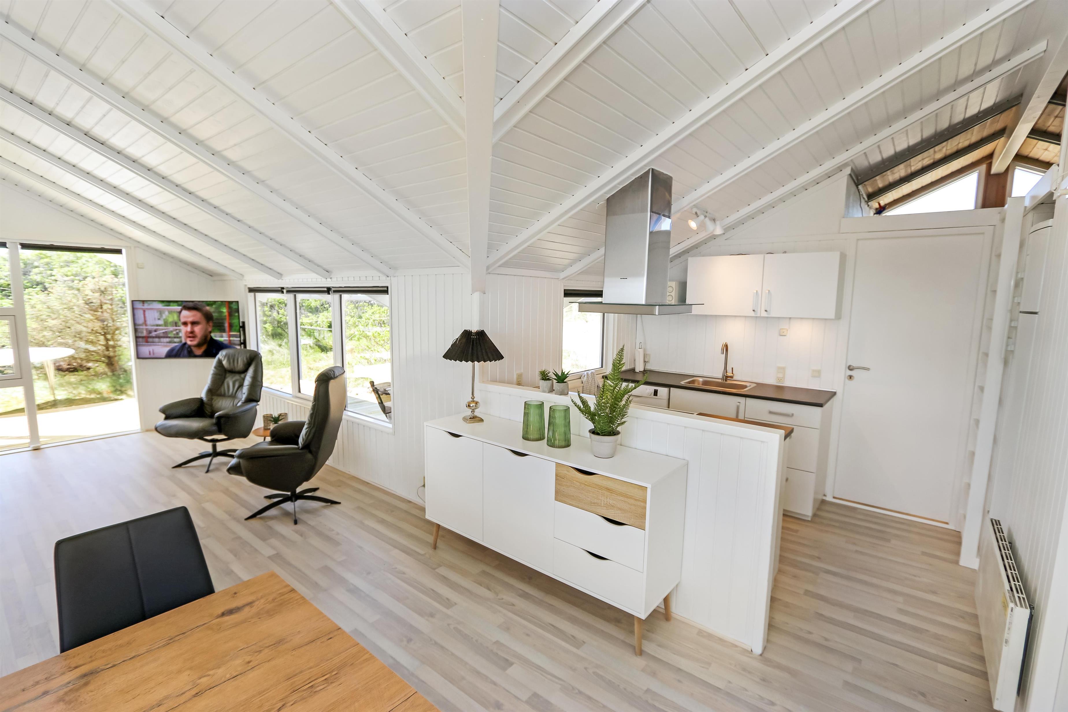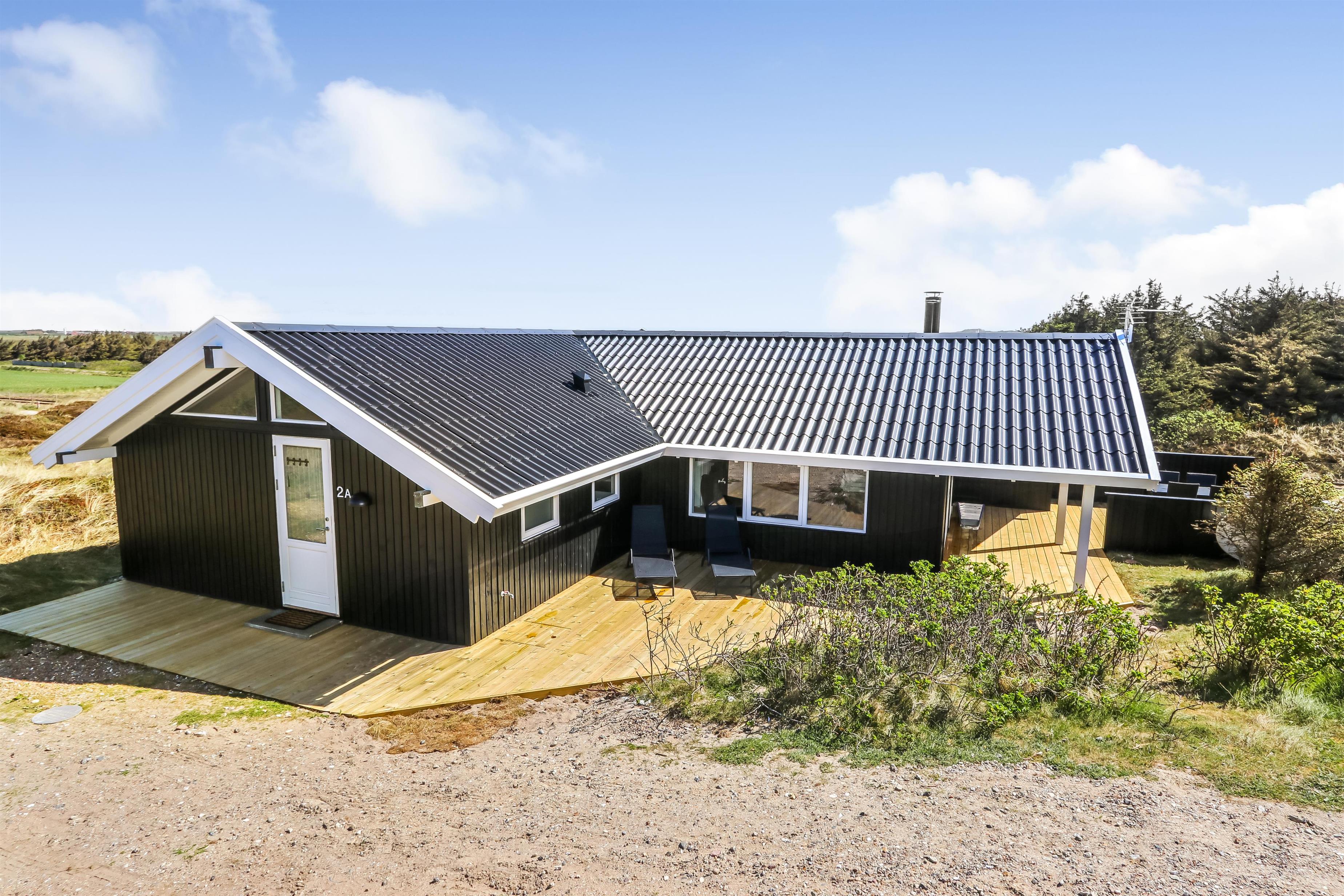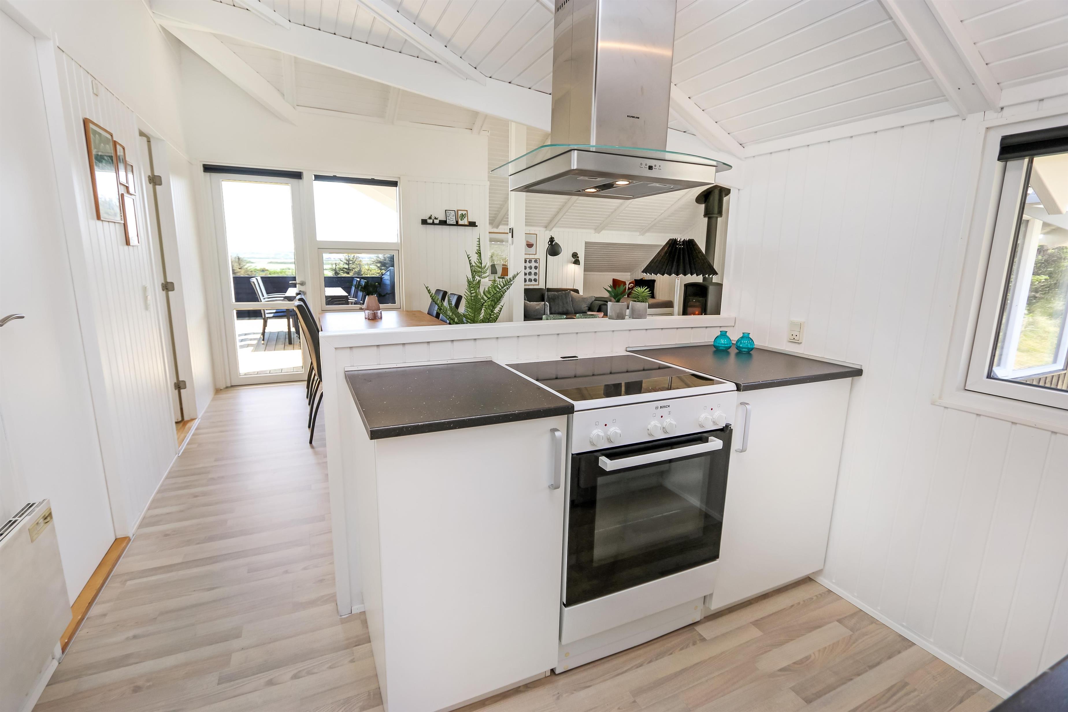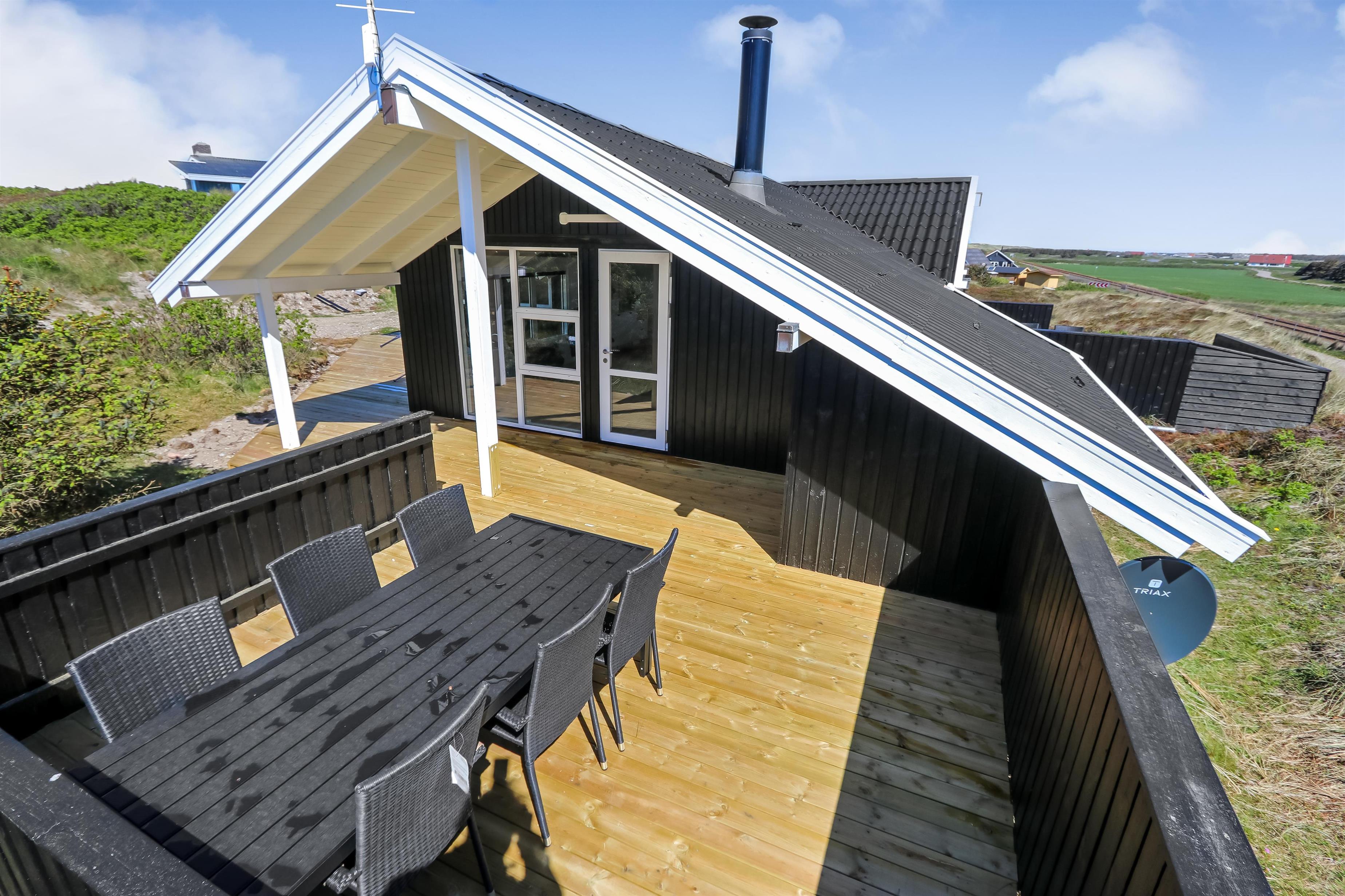 Auf einem schönen hügeligen Naturgrundstück und bloss 200 m von der Nordsee entfernt, liegt dieses prachtvolle Ferienhaus mit 76 m². Das Haus wurde in 1989 erbaut – aber in 2020 total renoviert -. Das Haus ist minimalistisch in seinem Ausdruck und praktisch eingerichtet. Ein Flur mit extra Platz zum Ablegen heisst Sie wilkommen. Kombinierter Wohnraum und Küchenecke mit einem offenen Dachboden. Der Wohnraum ist mit neuen schönen Ledermöbeln, Esstisch, Smart-TV mit dänischen und deutschen Programmen und der Möglichkeit für Streaming von TV/Radio/Apps eingerichtet. Haben Sie ein Handy oder ein anderes Gerät mit dem Sie streamen können, haben Sie hier die Möglickeit. Entspannen Sie vor dem Kaminofen, der zusammen mit der Wärmepumpe für niedrige Nebenkosten sorgt. Praktische harte Boden im Wohnraum und der Küche. 3 gute Schlafräume, alle mit neuen guten Betten: 1DB + 1DB + 1E und ein Alkoven mit 2 Schlafplätzen im Wohnraum. Für die Kleinsten gibt es Kinderbett und Kinderstuhl. Ganz neue Küche mit allem an Kochgeschirr und Geschirr und ein Herd mit Cerankochfeld, Abzugshaube, Geschirrspüler, Kühlschrank mit Gefrierdach und Mikrowelle. Schönes neues Badezimmer mit Fliesenboden, Toilette, Waschbecken und Dusche. Waschmaschine vorhanden. Nichtraucher-Haus. Max. 1 Haustier ist erlaubt.