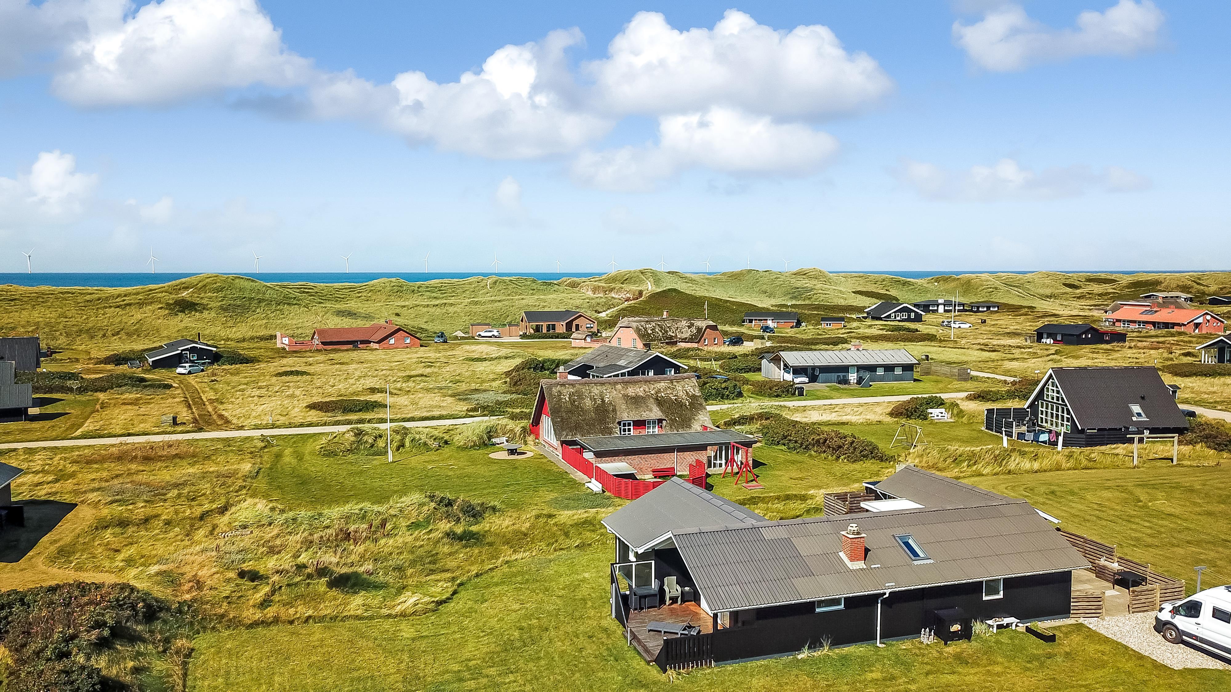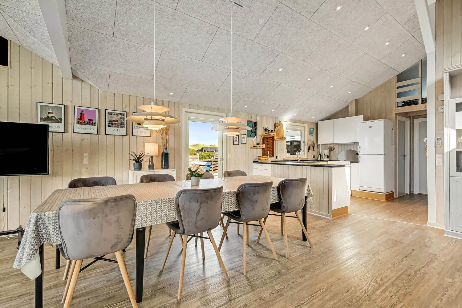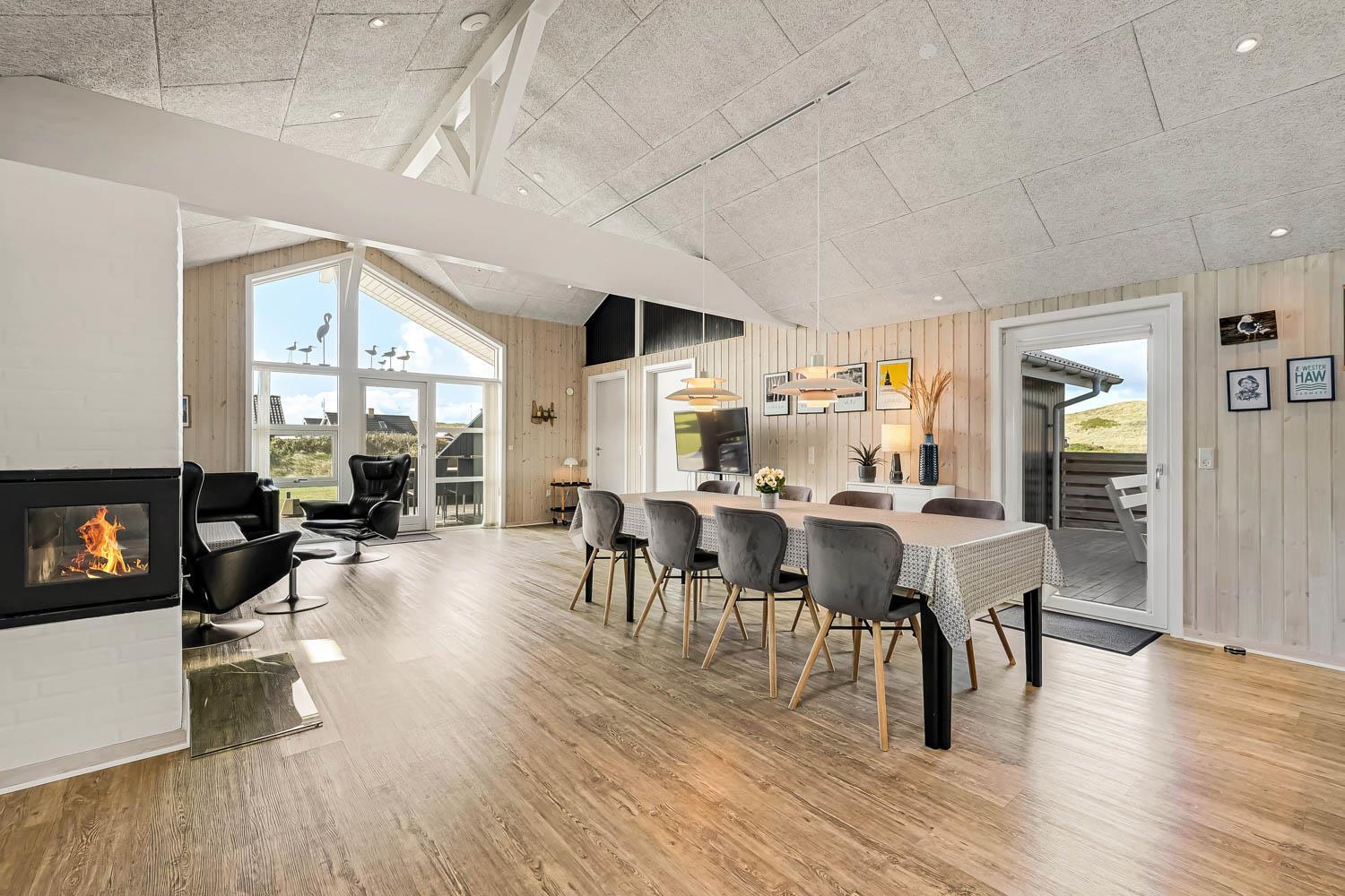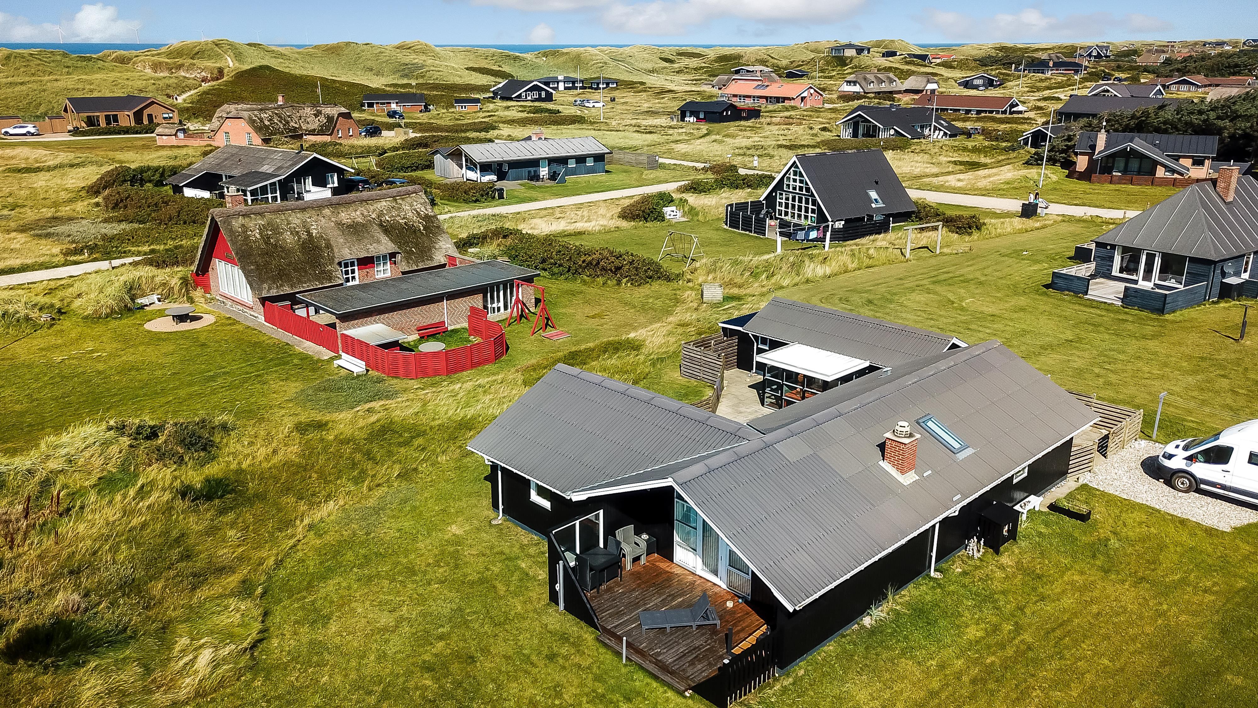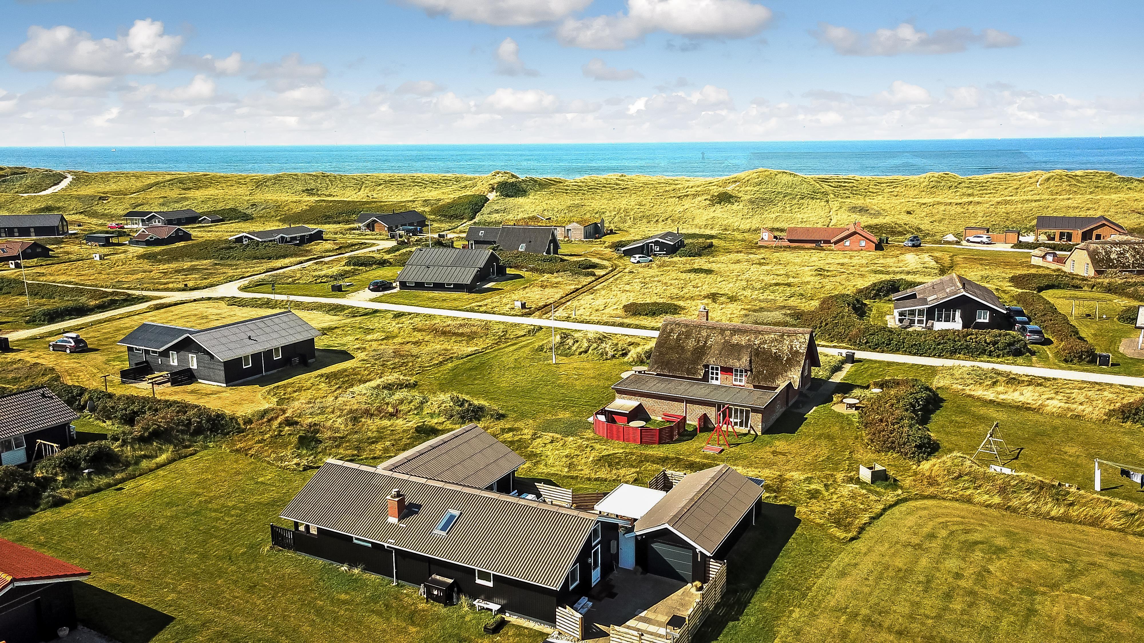 Dieses gut gelegene Ferienhaus verfügt über 4 Schlafzimmer (1DB, 1DB, 1DB + 1K). Das Haus ist 120 m² groß und das große, helle Wohnzimmer ist offen bis zum Giebel, mit einem fantastischen Lichteinfall durch ein Oberlichtfenster und große Fensterpartien, von denen aus man den Blick auf die Dünen in Richtung Meer genießen kann. Das Haus ist eingerichtet mit einem Eingangsbereich mit Waschmaschine, 4 Schlafzimmern, einem Badezimmer mit Dusche sowie einer offenen und gut ausgestatteten Küche im Zusammenhang mit dem Wohnzimmer. Die Küche und das Wohnzimmer bilden einen großartigen Raum mit Zugang zu einem großen, hellen Schlafboden. Es gibt auch einen gemütlichen Kamin, und das Haus kann zusätzlich mit einer Wärmepumpe und elektrischen Heizkörpern beheizt werden. Das Haus ist immer angenehm warm, unabhängig vom Wetter und der Jahreszeit. In der gut ausgestatteten Küche gibt es eine Kaffeemaschine, einen Heißluftofen, ein Keramikkochfeld, eine Mikrowelle, eine Spülmaschine und einen Kühlschrank mit Gefrierfach. Im Wohnzimmer gibt es einen Esstisch, eine Sofaecke mit TV, TV mit dänischen und deutschen Kanälen sowie Chromecast und Wi-Fi. Maximal 1 Haustier erlaubt.