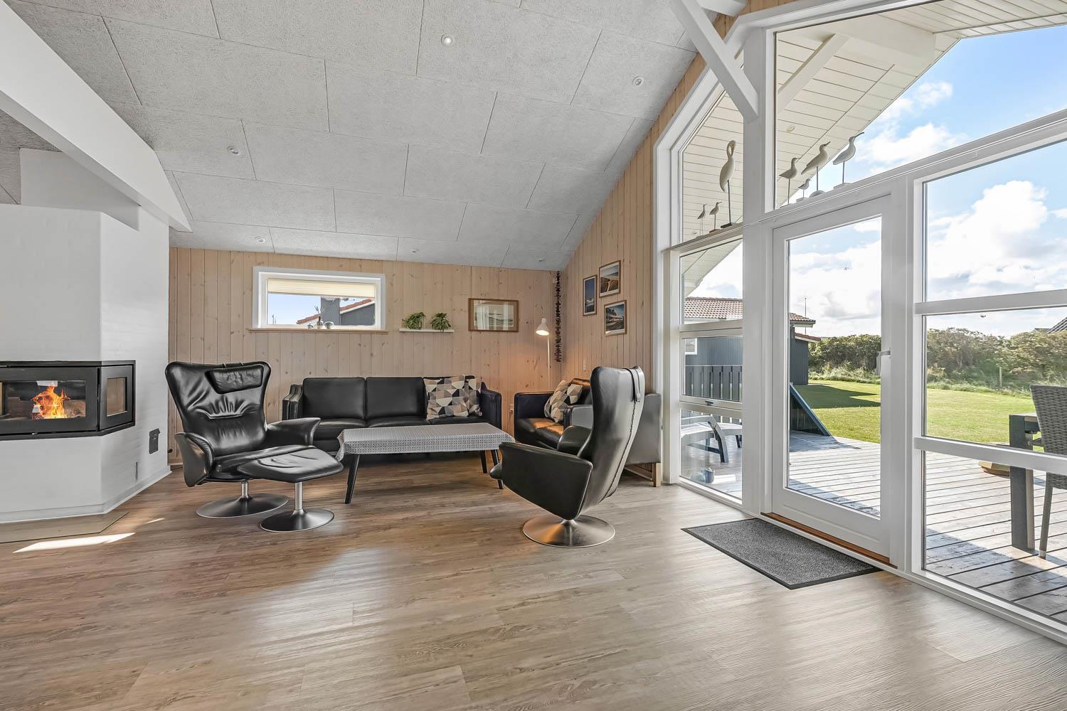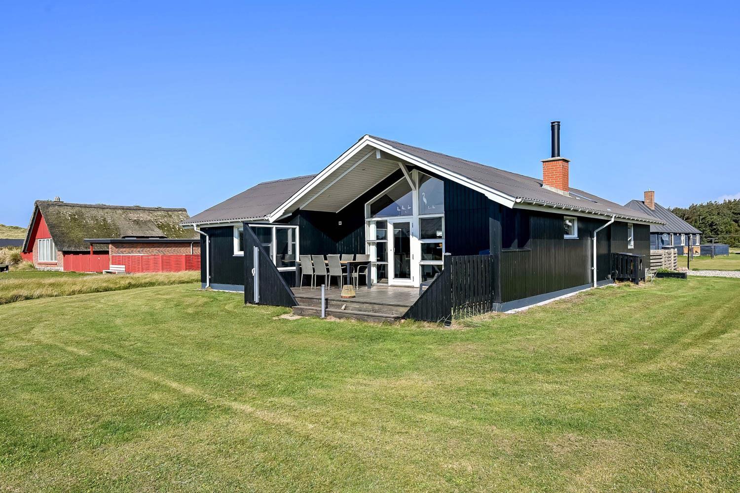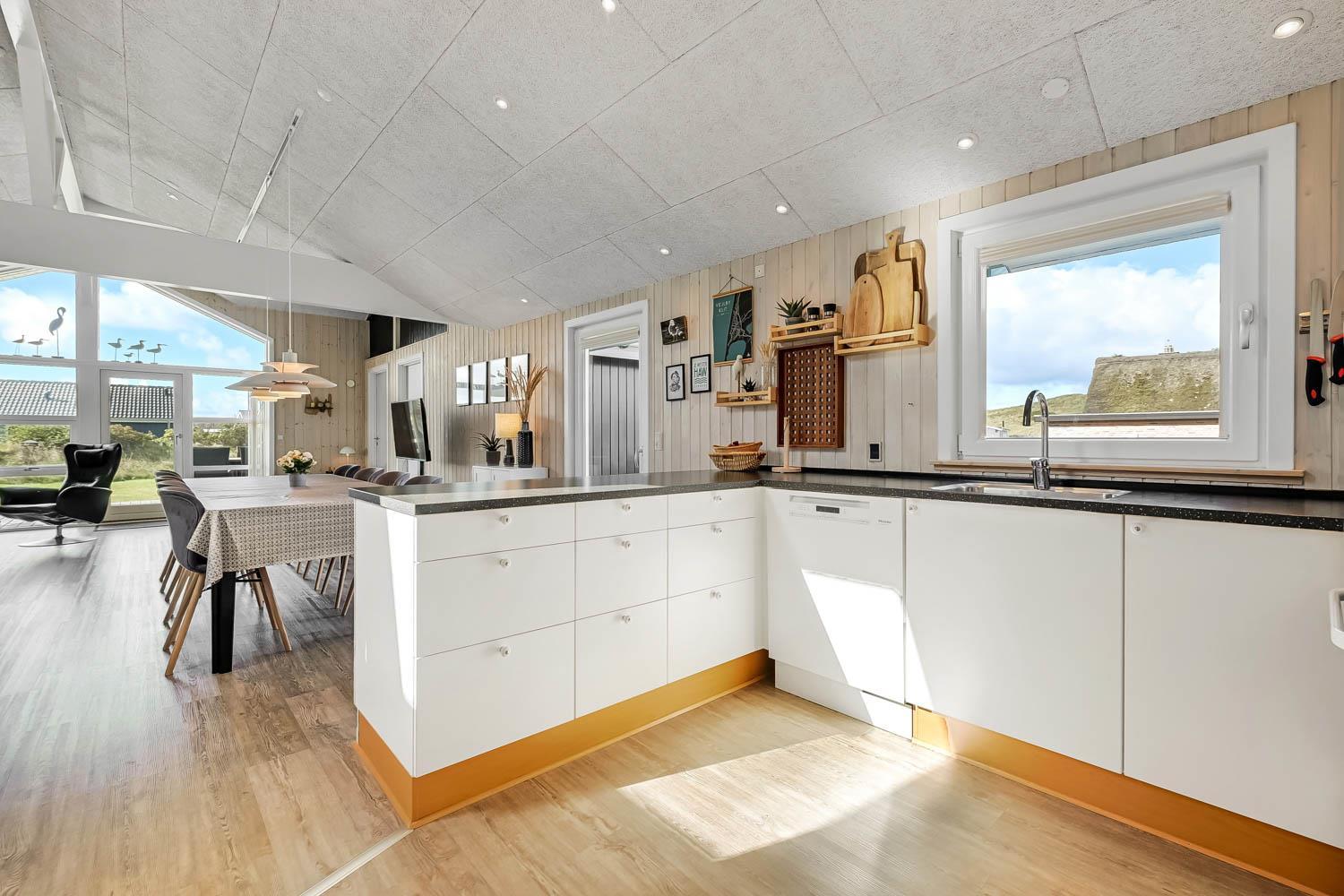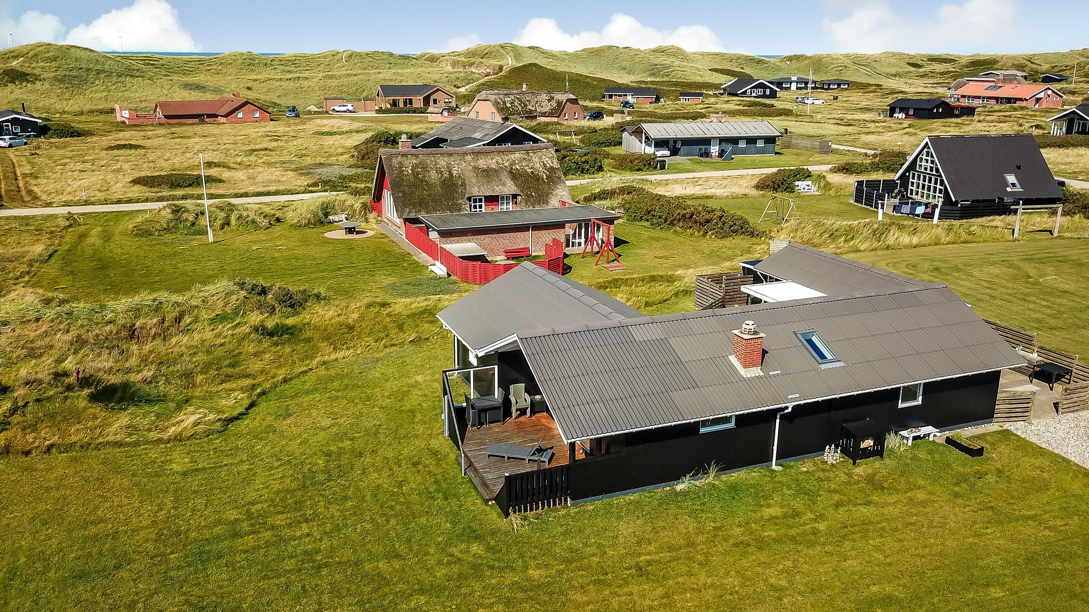 Dieses gut gelegene Ferienhaus verfügt über 4 Schlafzimmer (1DB, 1DB, 1DB + 1K). Das Haus ist 120 m² groß und das große, helle Wohnzimmer ist offen bis zum Giebel, mit einem fantastischen Lichteinfall durch ein Oberlichtfenster und große Fensterpartien, von denen aus man den Blick auf die Dünen in Richtung Meer genießen kann. Das Haus ist eingerichtet mit einem Eingangsbereich mit Waschmaschine, 4 Schlafzimmern, einem Badezimmer mit Dusche sowie einer offenen und gut ausgestatteten Küche im Zusammenhang mit dem Wohnzimmer. Die Küche und das Wohnzimmer bilden einen großartigen Raum mit Zugang zu einem großen, hellen Schlafboden. Es gibt auch einen gemütlichen Kamin, und das Haus kann zusätzlich mit einer Wärmepumpe und elektrischen Heizkörpern beheizt werden. Das Haus ist immer angenehm warm, unabhängig vom Wetter und der Jahreszeit. In der gut ausgestatteten Küche gibt es eine Kaffeemaschine, einen Heißluftofen, ein Keramikkochfeld, eine Mikrowelle, eine Spülmaschine und einen Kühlschrank mit Gefrierfach. Im Wohnzimmer gibt es einen Esstisch, eine Sofaecke mit TV, TV mit dänischen und deutschen Kanälen sowie Chromecast und Wi-Fi. Maximal 1 Haustier erlaubt.