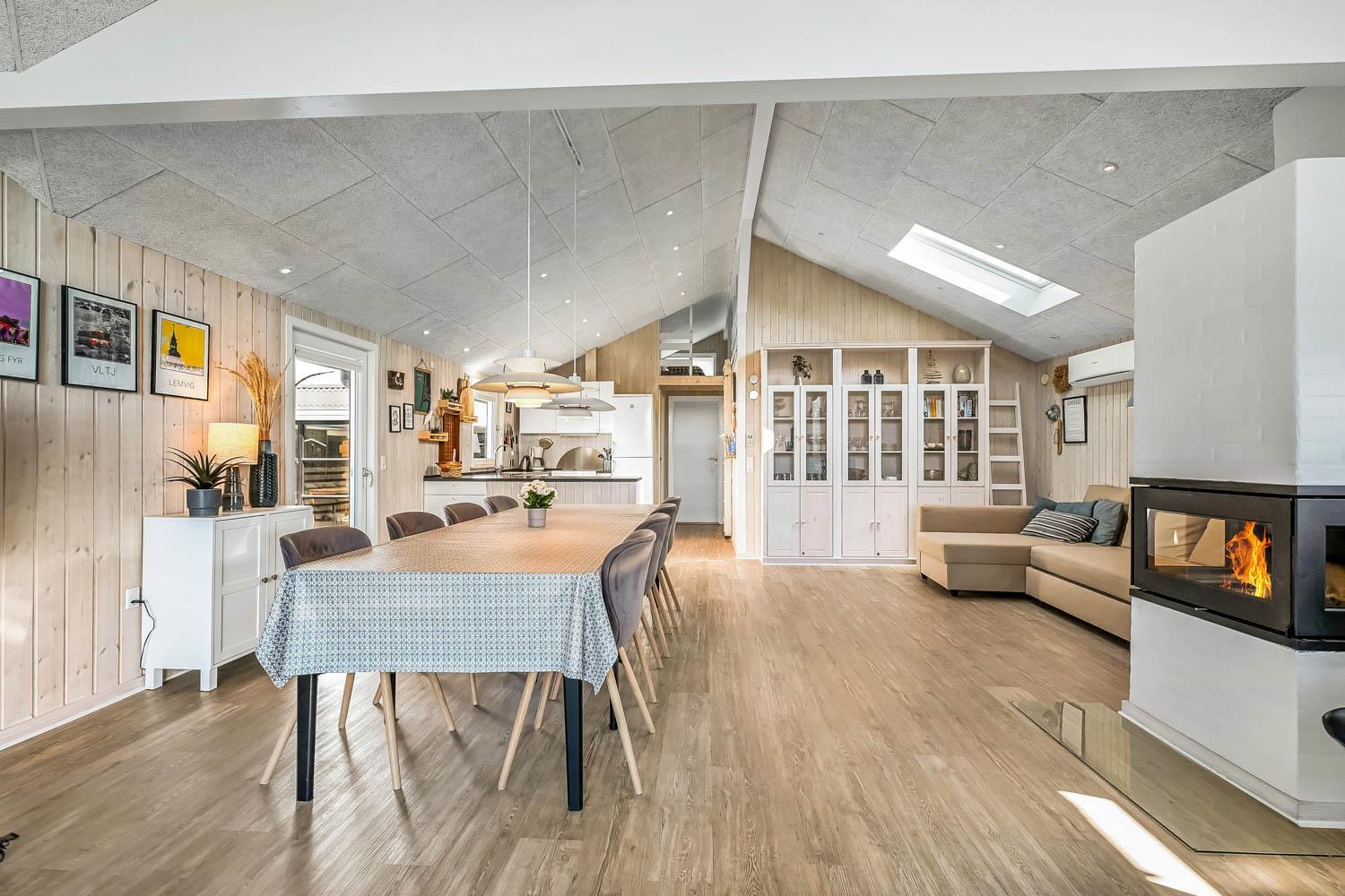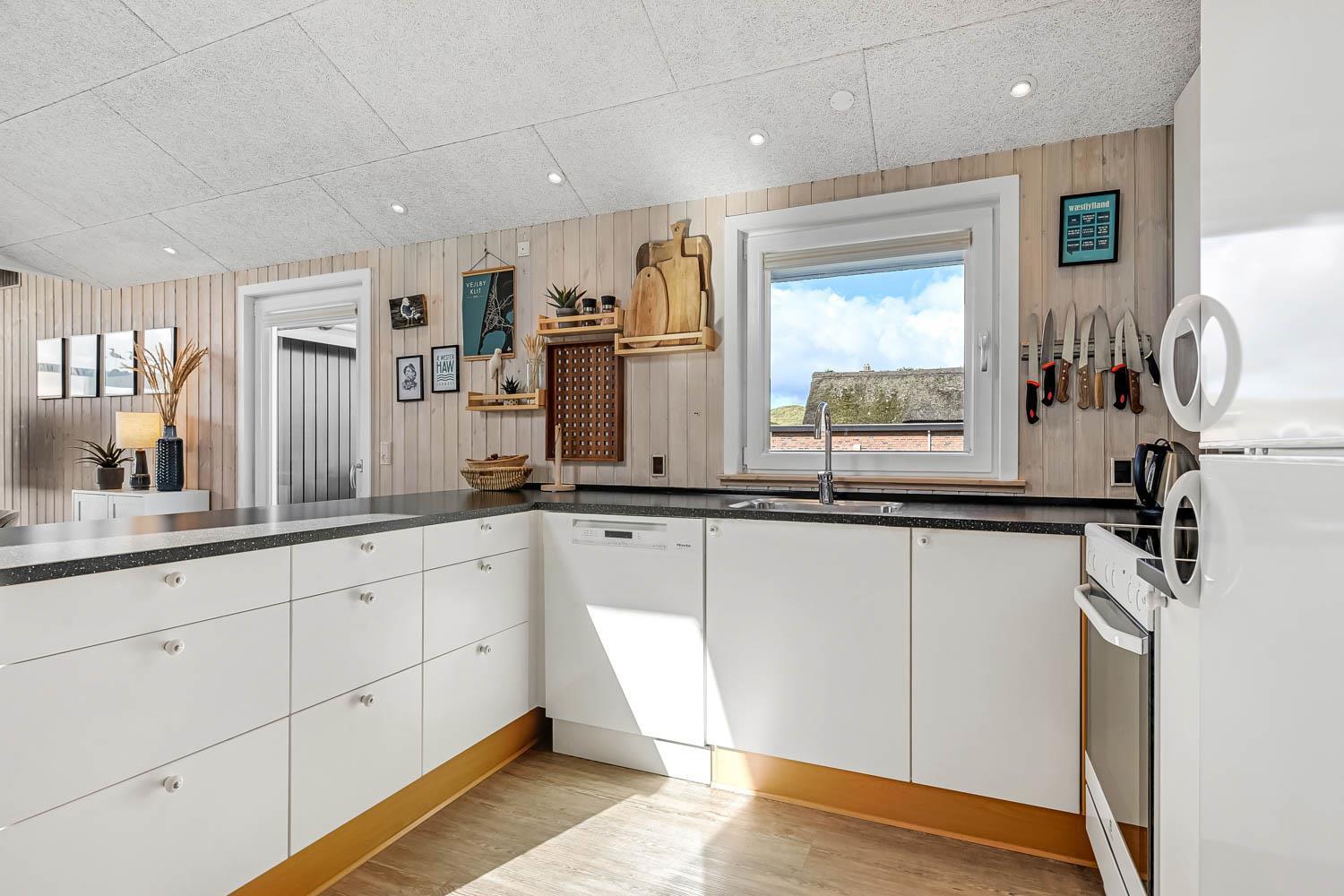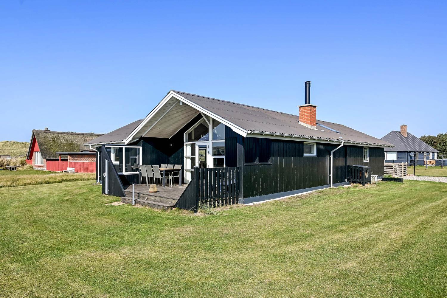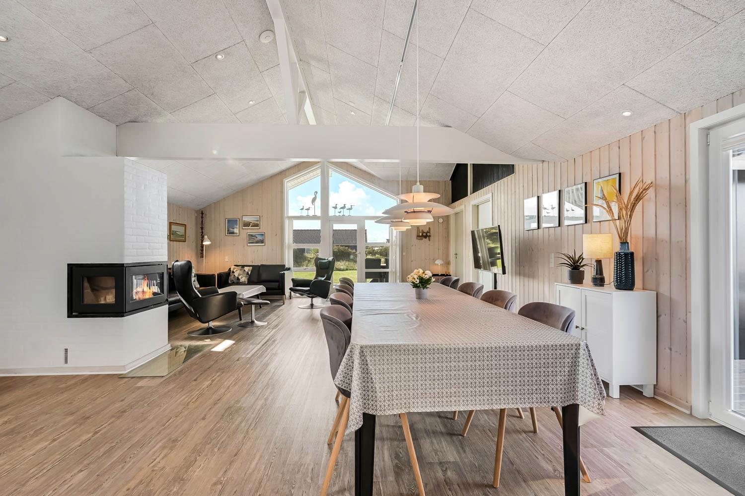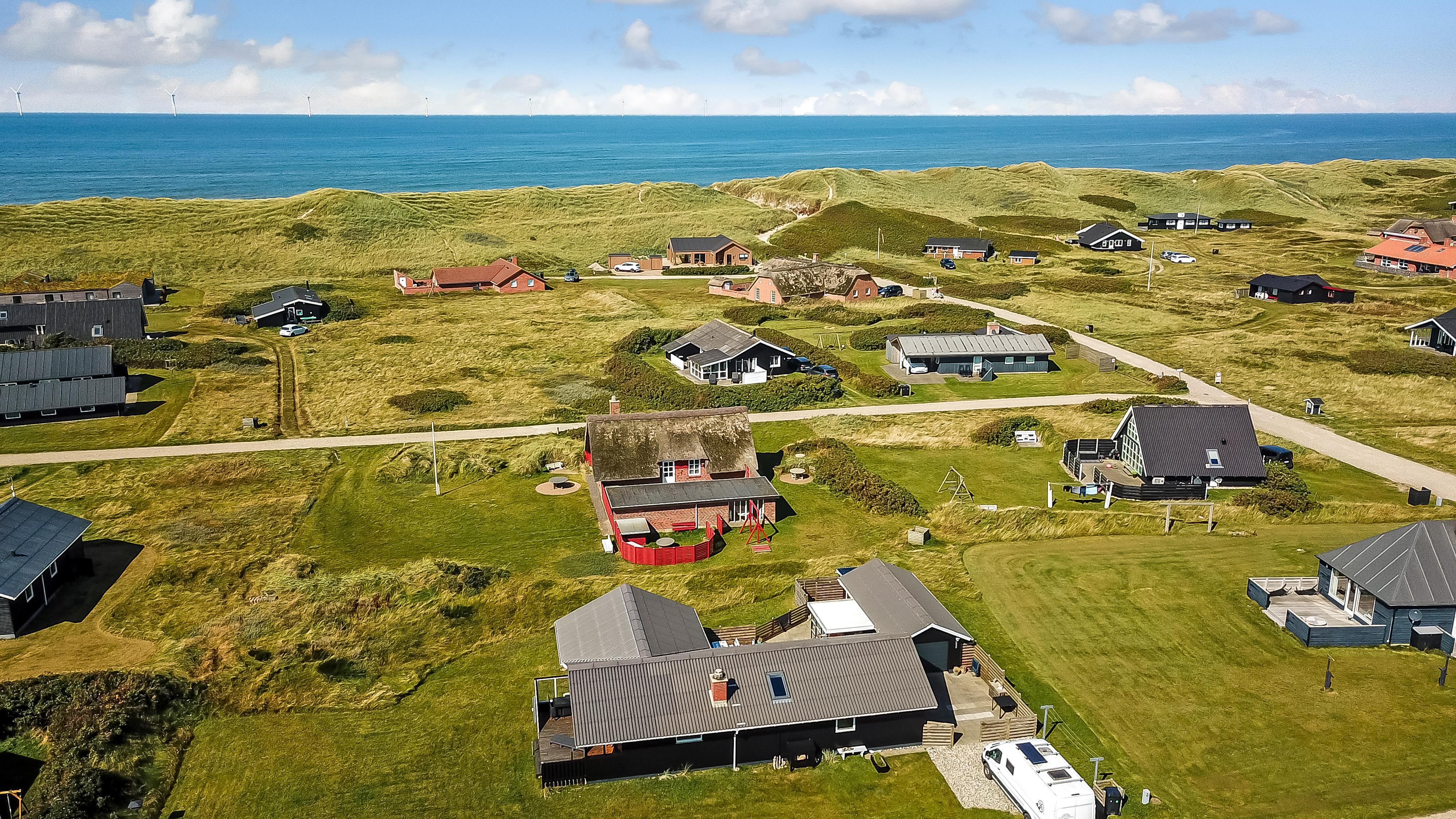 Dieses gut gelegene Ferienhaus verfügt über 4 Schlafzimmer (1DB, 1DB, 1DB + 1K). Das Haus ist 120 m² groß und das große, helle Wohnzimmer ist offen bis zum Giebel, mit einem fantastischen Lichteinfall durch ein Oberlichtfenster und große Fensterpartien, von denen aus man den Blick auf die Dünen in Richtung Meer genießen kann. Das Haus ist eingerichtet mit einem Eingangsbereich mit Waschmaschine, 4 Schlafzimmern, einem Badezimmer mit Dusche sowie einer offenen und gut ausgestatteten Küche im Zusammenhang mit dem Wohnzimmer. Die Küche und das Wohnzimmer bilden einen großartigen Raum mit Zugang zu einem großen, hellen Schlafboden. Es gibt auch einen gemütlichen Kamin, und das Haus kann zusätzlich mit einer Wärmepumpe und elektrischen Heizkörpern beheizt werden. Das Haus ist immer angenehm warm, unabhängig vom Wetter und der Jahreszeit. In der gut ausgestatteten Küche gibt es eine Kaffeemaschine, einen Heißluftofen, ein Keramikkochfeld, eine Mikrowelle, eine Spülmaschine und einen Kühlschrank mit Gefrierfach. Im Wohnzimmer gibt es einen Esstisch, eine Sofaecke mit TV, TV mit dänischen und deutschen Kanälen sowie Chromecast und Wi-Fi. Maximal 1 Haustier erlaubt.