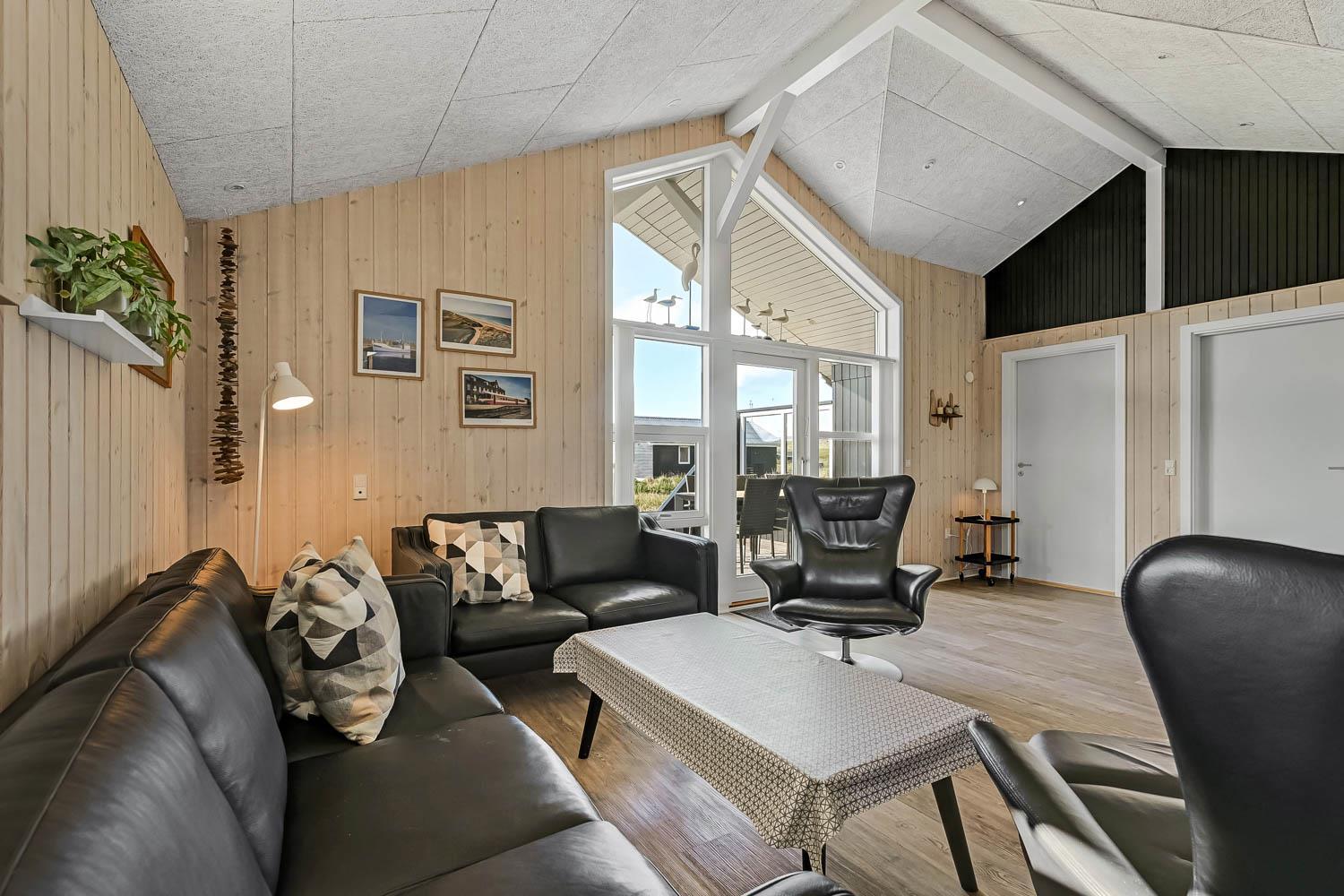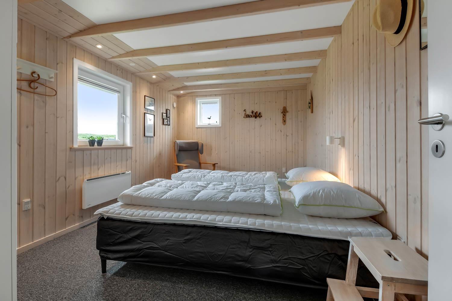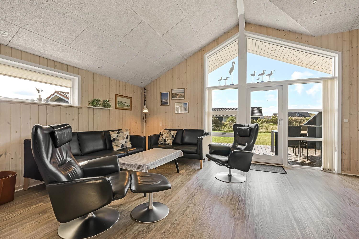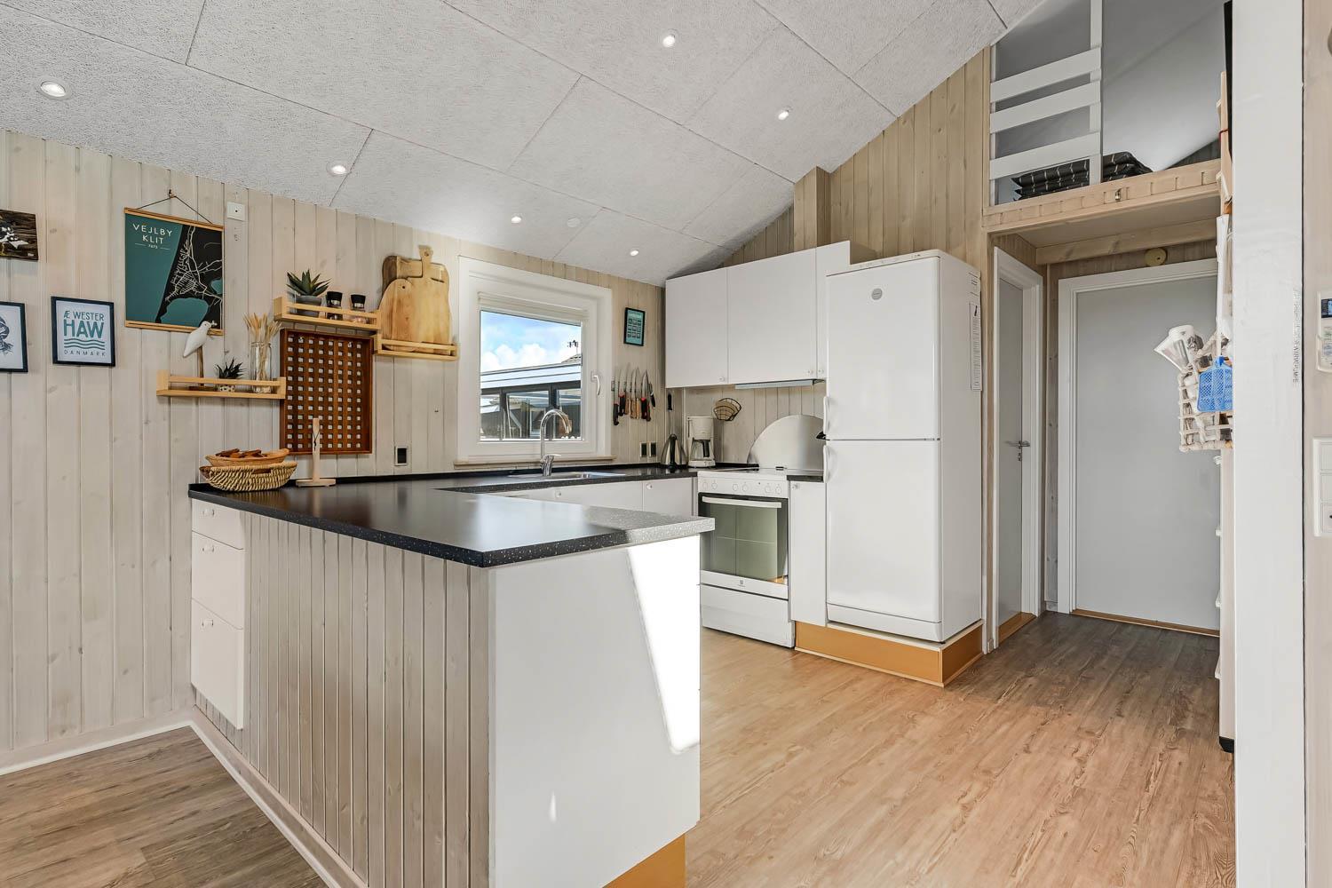 Dieses gut gelegene Ferienhaus verfügt über 4 Schlafzimmer (1DB, 1DB, 1DB + 1K). Das Haus ist 120 m² groß und das große, helle Wohnzimmer ist offen bis zum Giebel, mit einem fantastischen Lichteinfall durch ein Oberlichtfenster und große Fensterpartien, von denen aus man den Blick auf die Dünen in Richtung Meer genießen kann. Das Haus ist eingerichtet mit einem Eingangsbereich mit Waschmaschine, 4 Schlafzimmern, einem Badezimmer mit Dusche sowie einer offenen und gut ausgestatteten Küche im Zusammenhang mit dem Wohnzimmer. Die Küche und das Wohnzimmer bilden einen großartigen Raum mit Zugang zu einem großen, hellen Schlafboden. Es gibt auch einen gemütlichen Kamin, und das Haus kann zusätzlich mit einer Wärmepumpe und elektrischen Heizkörpern beheizt werden. Das Haus ist immer angenehm warm, unabhängig vom Wetter und der Jahreszeit. In der gut ausgestatteten Küche gibt es eine Kaffeemaschine, einen Heißluftofen, ein Keramikkochfeld, eine Mikrowelle, eine Spülmaschine und einen Kühlschrank mit Gefrierfach. Im Wohnzimmer gibt es einen Esstisch, eine Sofaecke mit TV, TV mit dänischen und deutschen Kanälen sowie Chromecast und Wi-Fi. Maximal 1 Haustier erlaubt.