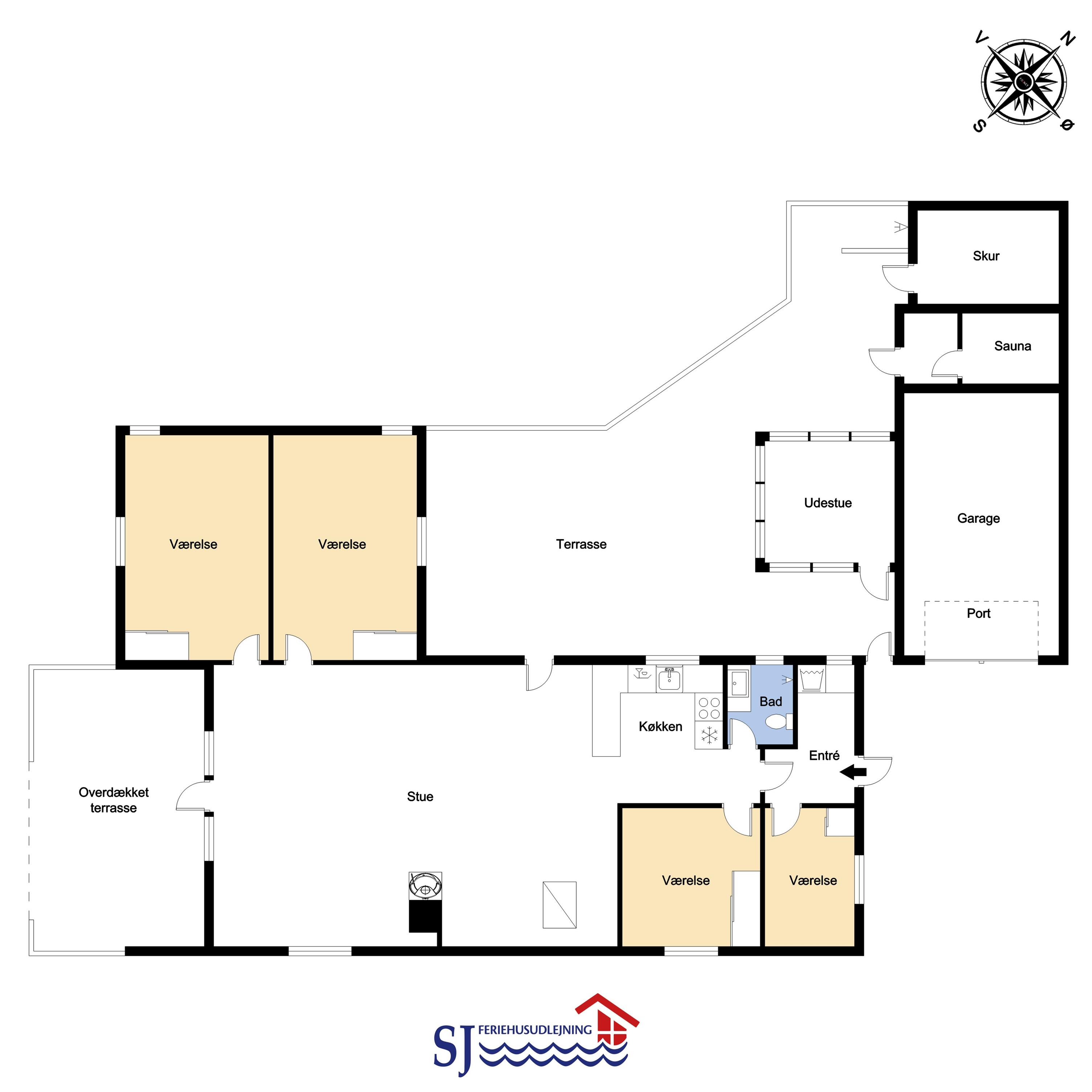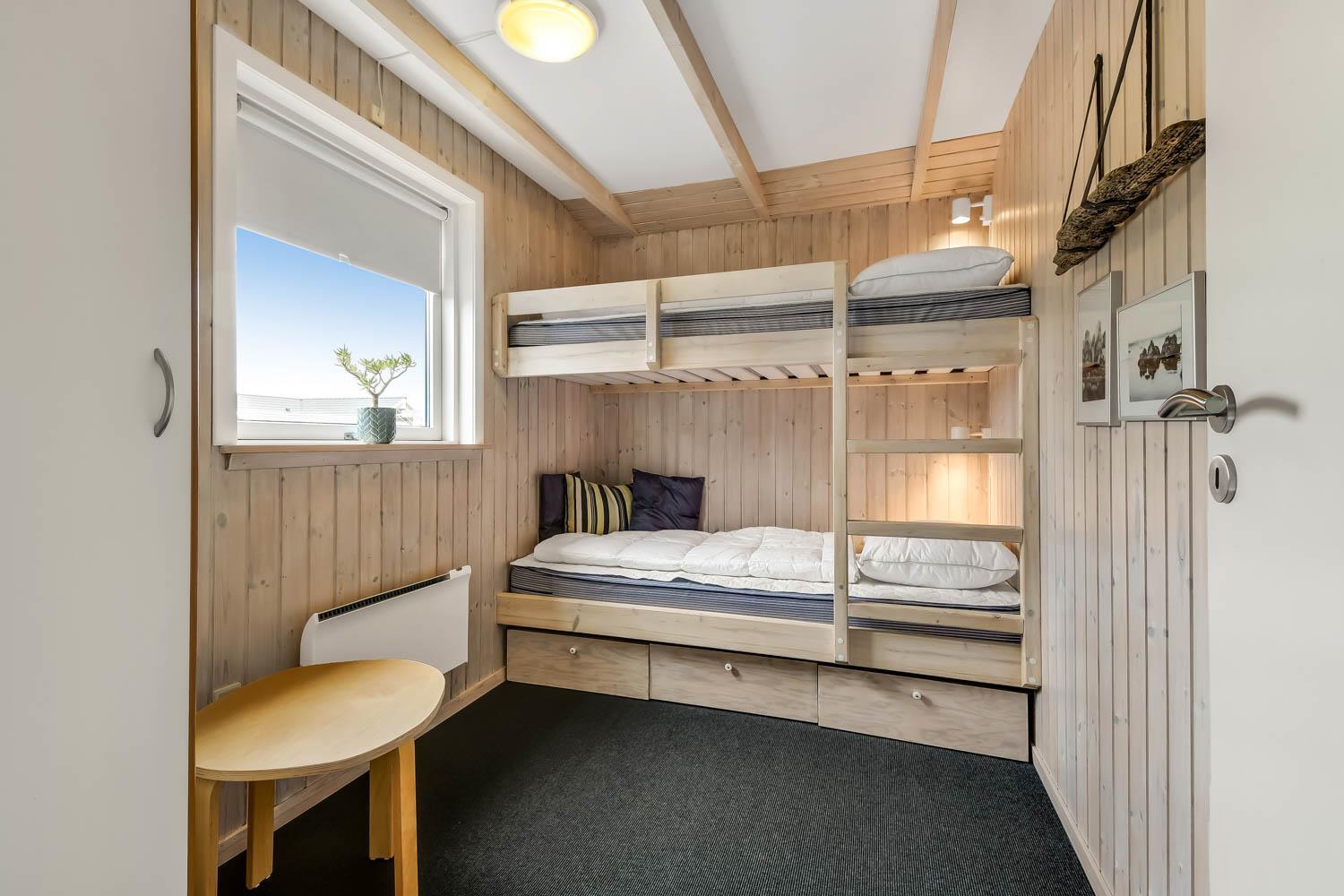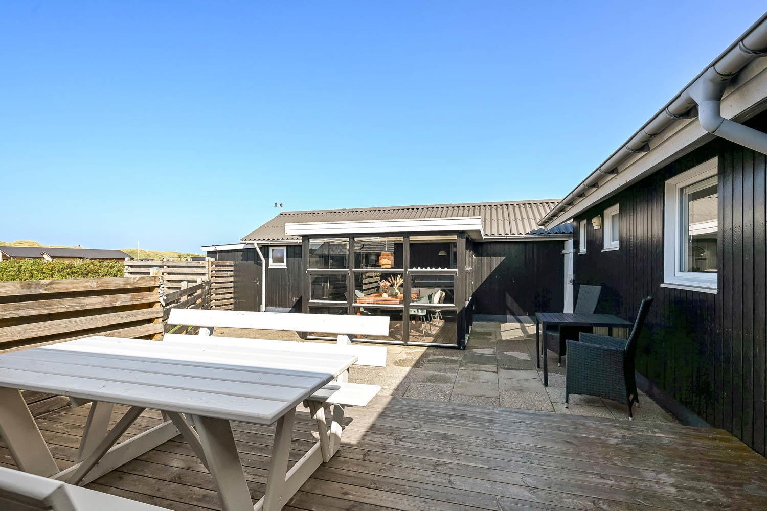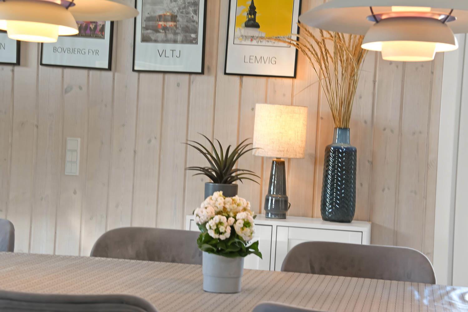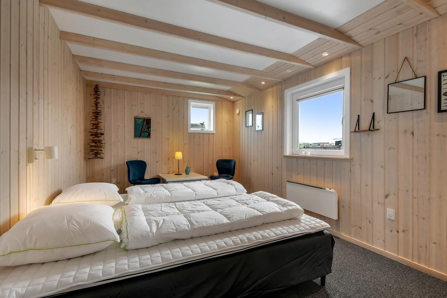 Dieses gut gelegene Ferienhaus verfügt über 4 Schlafzimmer (1DB, 1DB, 1DB + 1K). Das Haus ist 120 m² groß und das große, helle Wohnzimmer ist offen bis zum Giebel, mit einem fantastischen Lichteinfall durch ein Oberlichtfenster und große Fensterpartien, von denen aus man den Blick auf die Dünen in Richtung Meer genießen kann. Das Haus ist eingerichtet mit einem Eingangsbereich mit Waschmaschine, 4 Schlafzimmern, einem Badezimmer mit Dusche sowie einer offenen und gut ausgestatteten Küche im Zusammenhang mit dem Wohnzimmer. Die Küche und das Wohnzimmer bilden einen großartigen Raum mit Zugang zu einem großen, hellen Schlafboden. Es gibt auch einen gemütlichen Kamin, und das Haus kann zusätzlich mit einer Wärmepumpe und elektrischen Heizkörpern beheizt werden. Das Haus ist immer angenehm warm, unabhängig vom Wetter und der Jahreszeit. In der gut ausgestatteten Küche gibt es eine Kaffeemaschine, einen Heißluftofen, ein Keramikkochfeld, eine Mikrowelle, eine Spülmaschine und einen Kühlschrank mit Gefrierfach. Im Wohnzimmer gibt es einen Esstisch, eine Sofaecke mit TV, TV mit dänischen und deutschen Kanälen sowie Chromecast und Wi-Fi. Maximal 1 Haustier erlaubt.