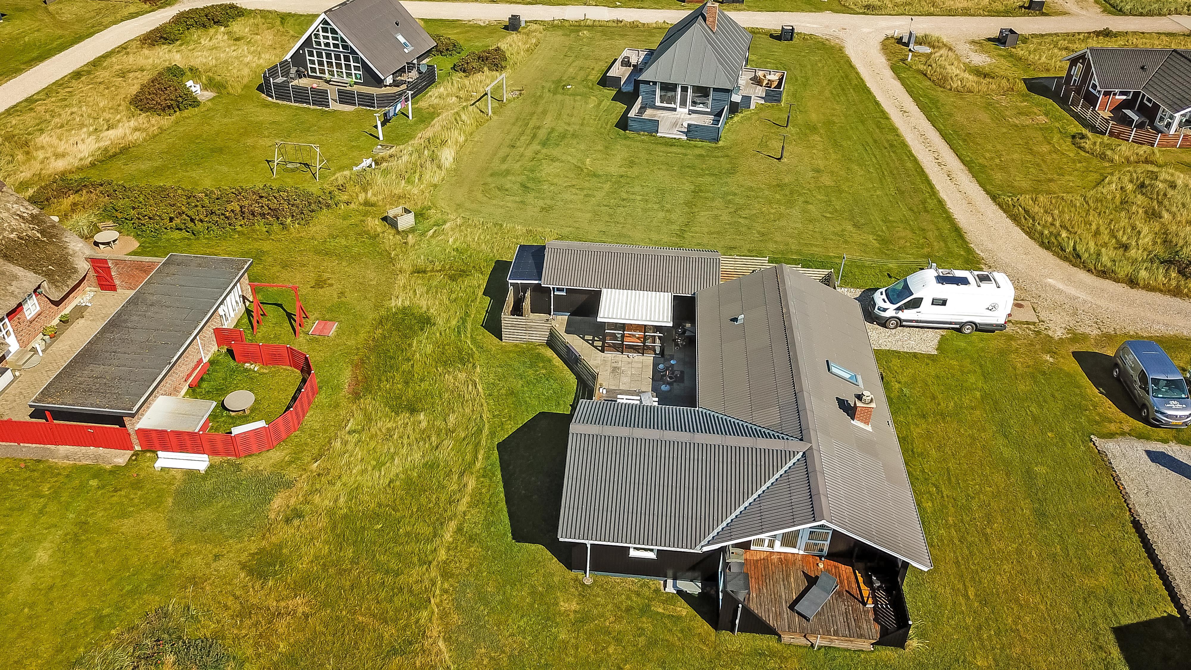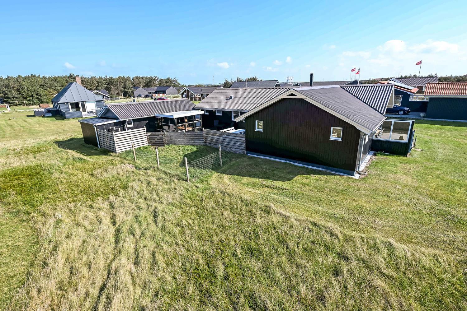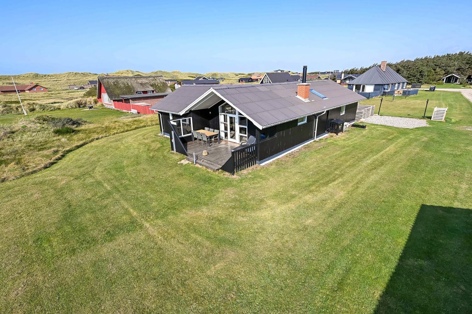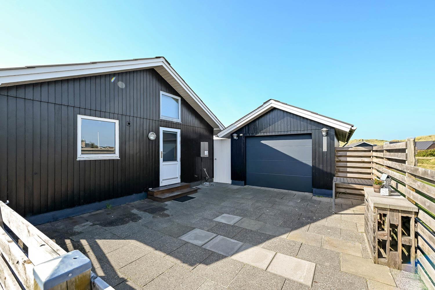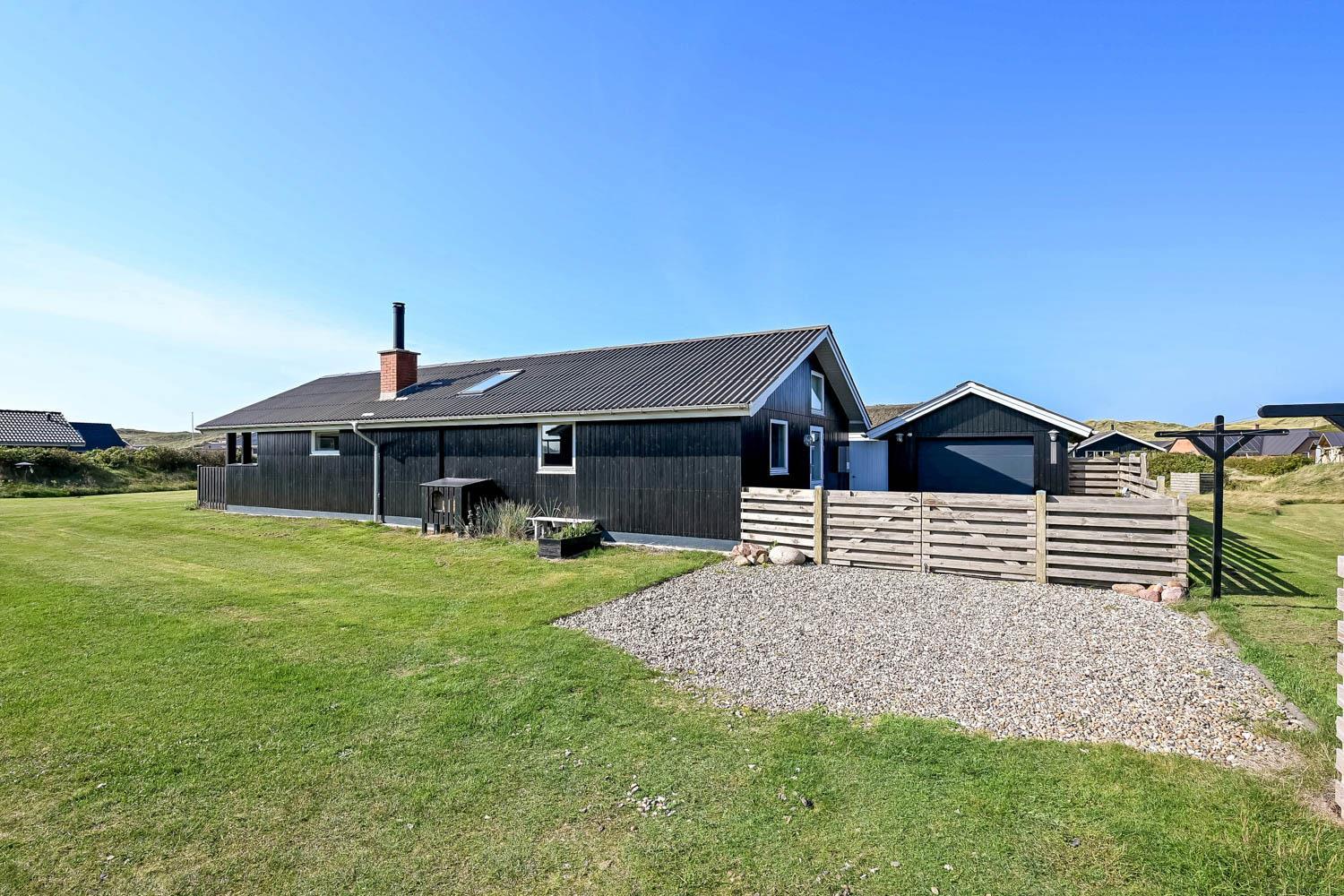 Das Haus liegt auf einem Naturgrundstück, nur 150 Meter von der Nordsee entfernt und ebenfalls nur 150 Meter vom Vejlby Torv mit Kaufmann und Café John Wayne. Vom Wohnzimmer und dem Eingang gibt es einen Zugang zu den eingezäunten Terrassen des Hauses, sowohl nach Süden als auch nach Westen, was es ermöglicht, die Sonne den ganzen Tag über zu genießen. Außerdem gibt es im Bereich der westlich gelegenen Terrasse eine Außendusche mit kaltes Wasser, eine Sauna und einen wunderbaren Wintergarten mit Essplatz und einem fantastischen Blick auf die hohen Dünen der Nordsee. Grill und Gartenmöbel können nach Bedarf umgestellt werden. Es gibt auch eine Lademöglichkeit für Elektroautos in der Garage des Hauses. Es gibt eine Hundegehege.