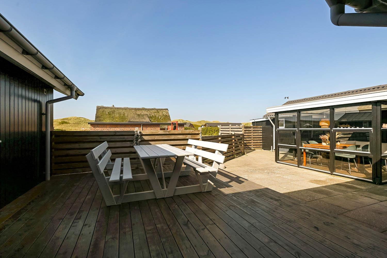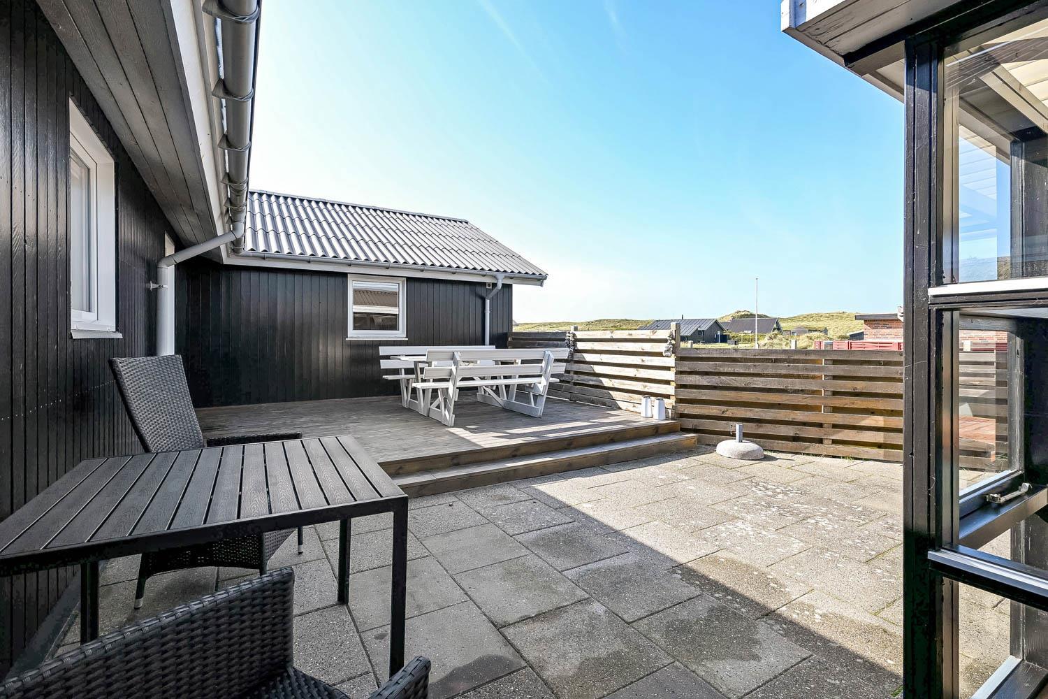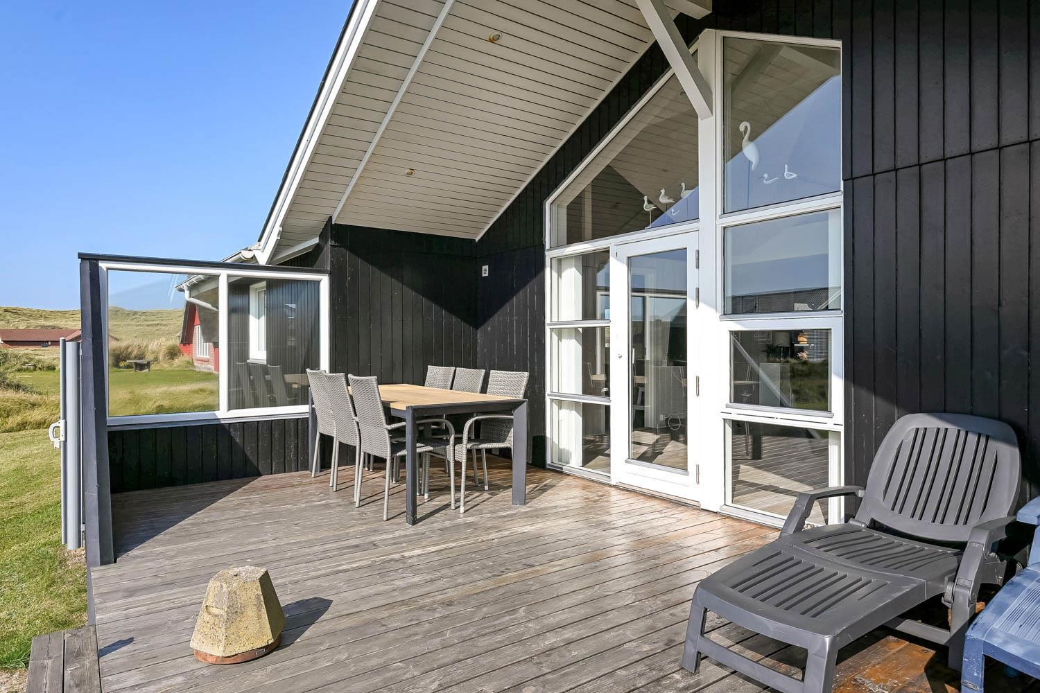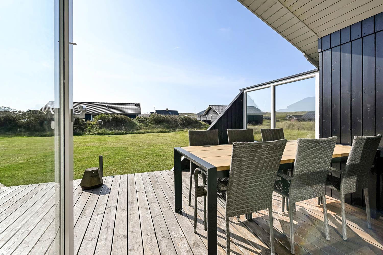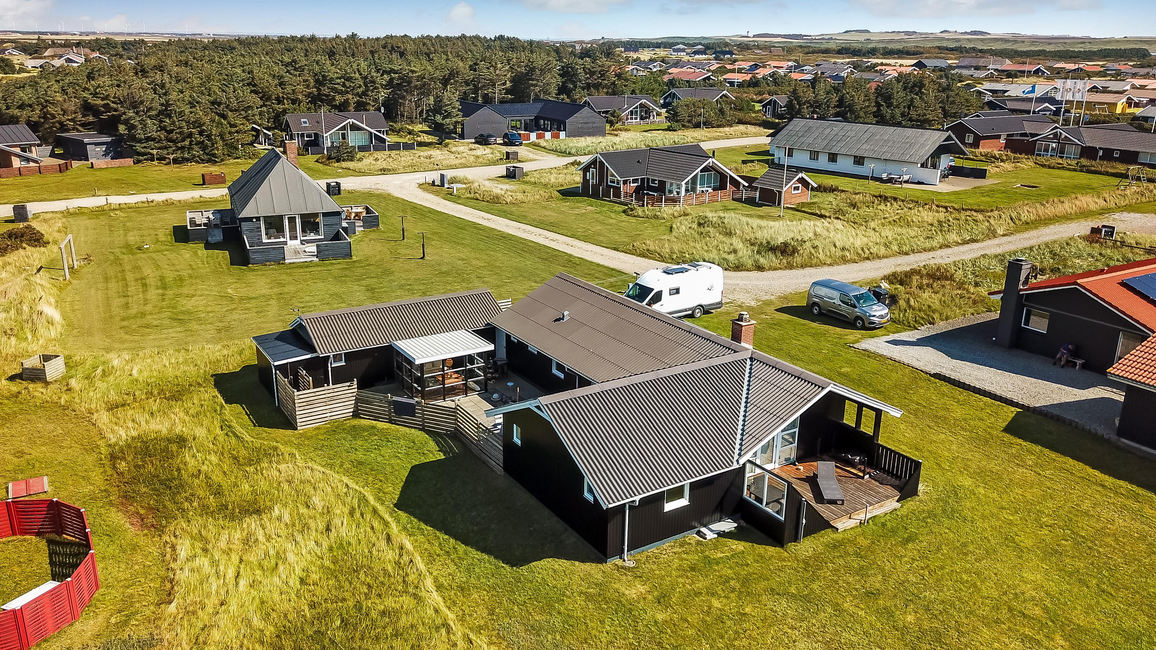 Das Haus liegt auf einem Naturgrundstück, nur 150 Meter von der Nordsee entfernt und ebenfalls nur 150 Meter vom Vejlby Torv mit Kaufmann und Café John Wayne. Vom Wohnzimmer und dem Eingang gibt es einen Zugang zu den eingezäunten Terrassen des Hauses, sowohl nach Süden als auch nach Westen, was es ermöglicht, die Sonne den ganzen Tag über zu genießen. Außerdem gibt es im Bereich der westlich gelegenen Terrasse eine Außendusche mit kaltes Wasser, eine Sauna und einen wunderbaren Wintergarten mit Essplatz und einem fantastischen Blick auf die hohen Dünen der Nordsee. Grill und Gartenmöbel können nach Bedarf umgestellt werden. Es gibt auch eine Lademöglichkeit für Elektroautos in der Garage des Hauses. Es gibt eine Hundegehege.