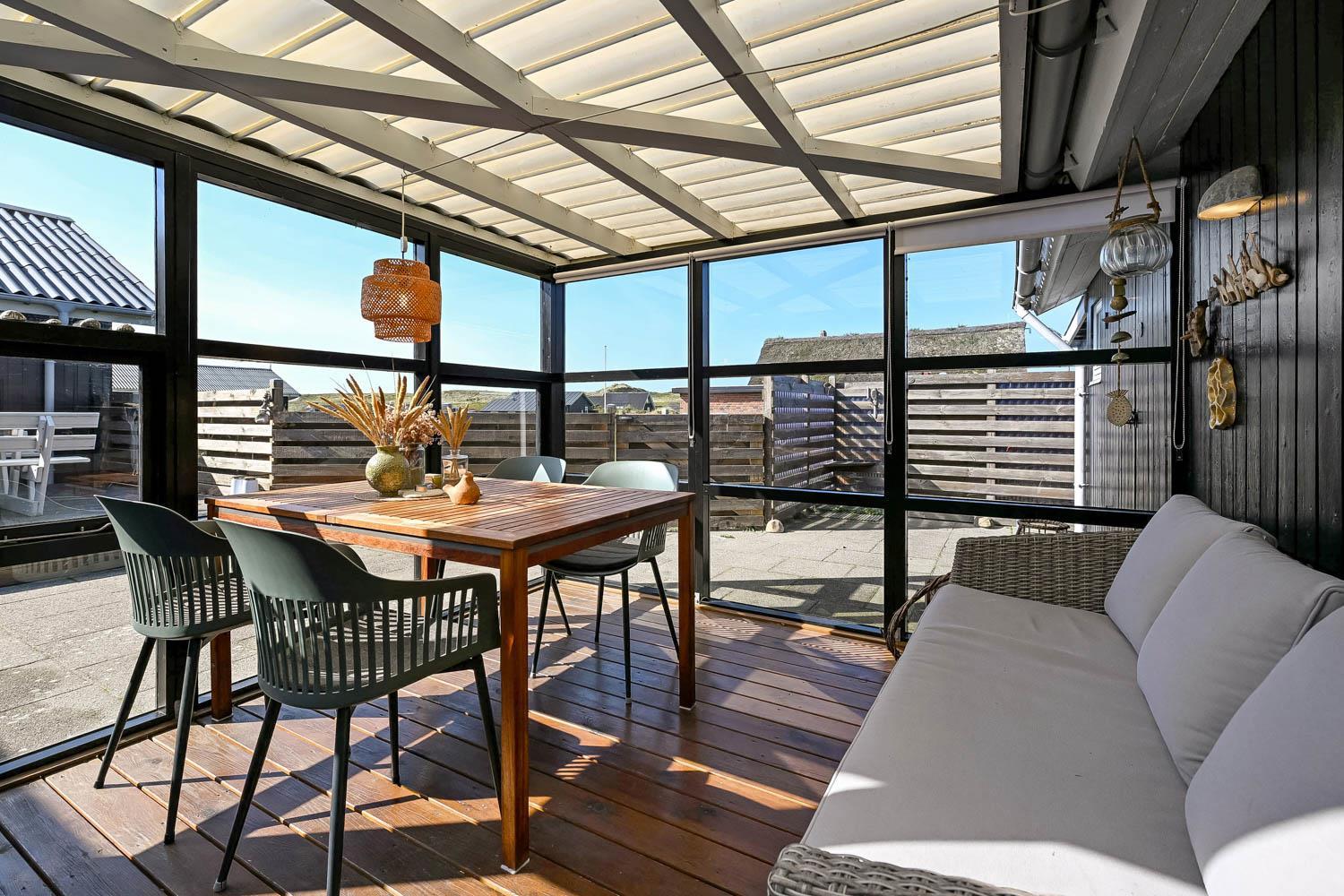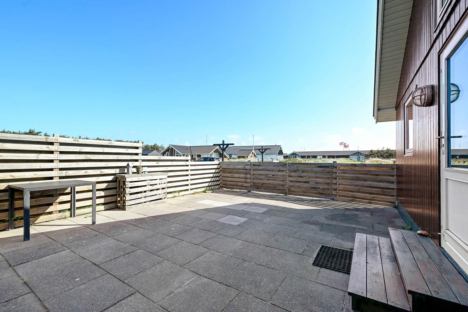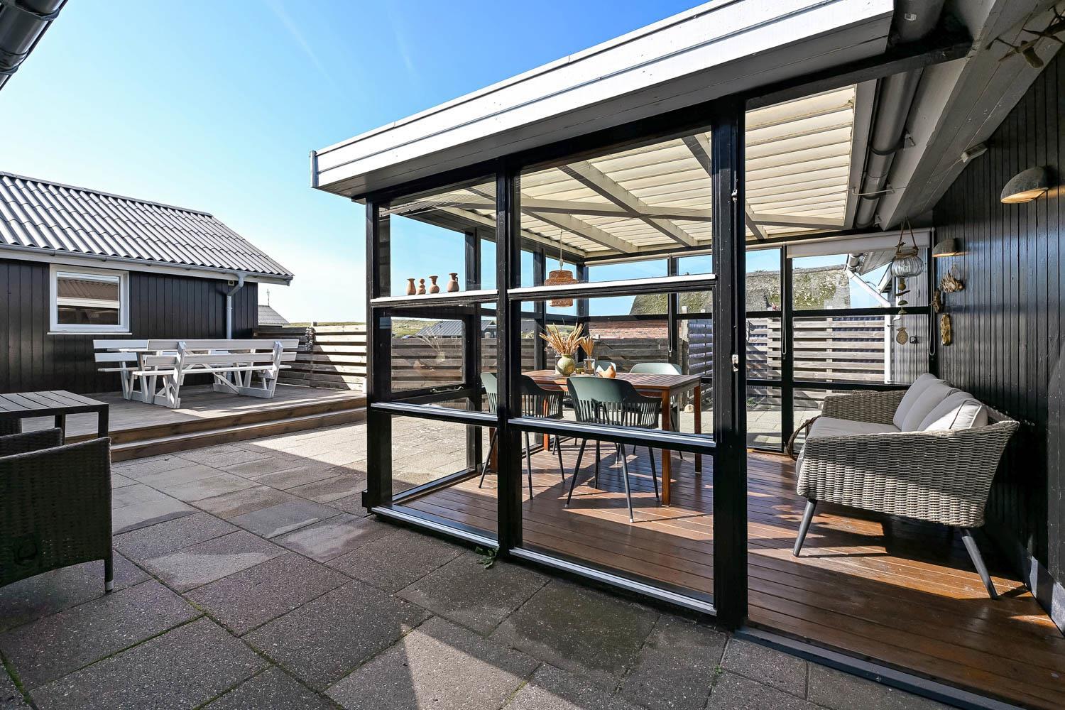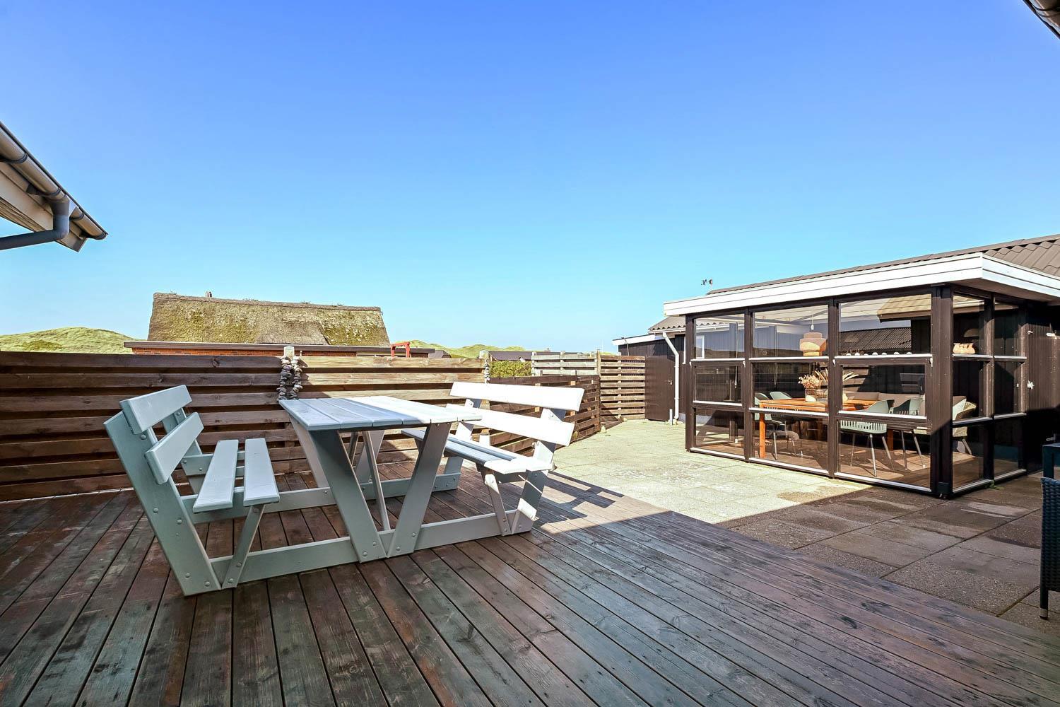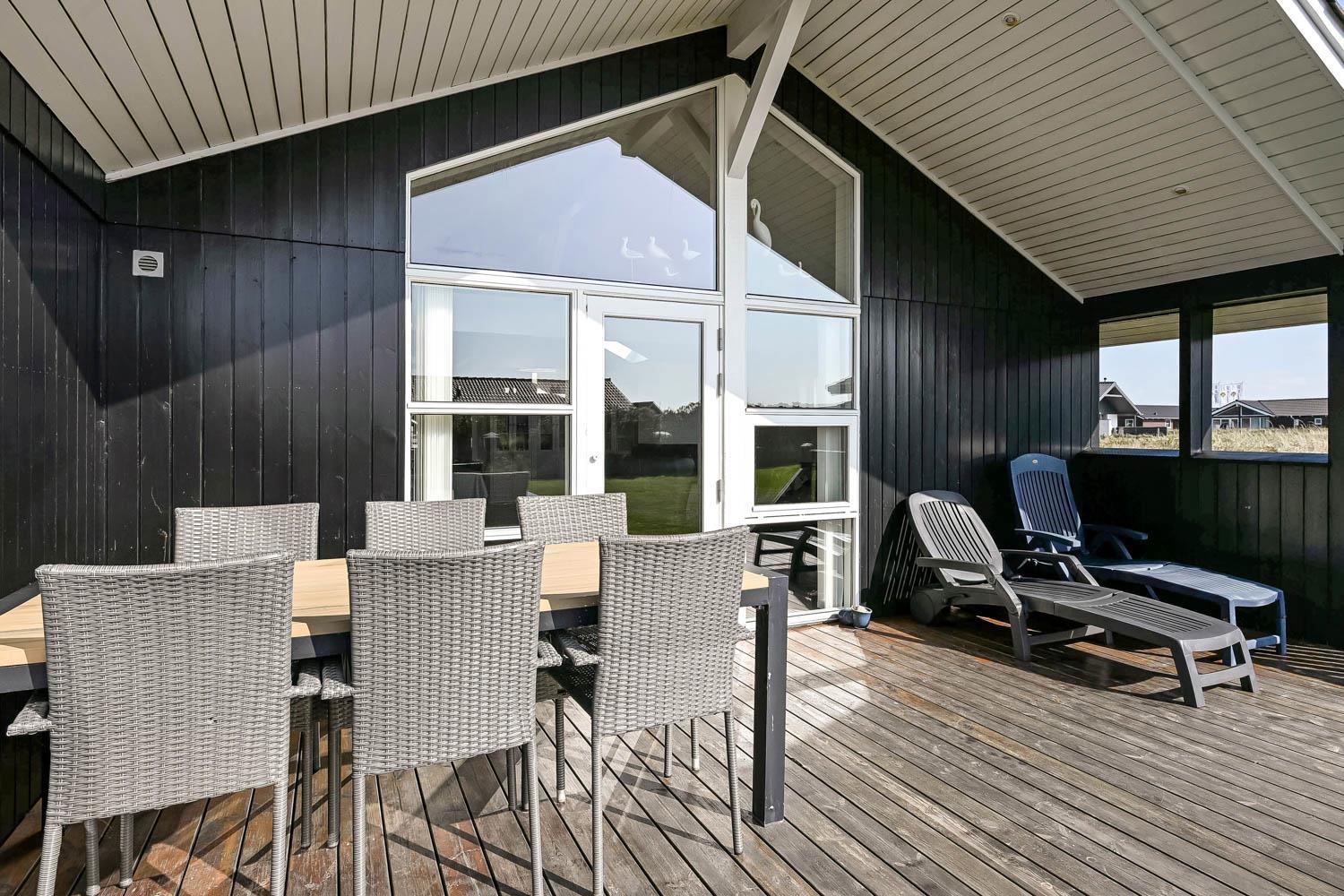 Das Haus liegt auf einem Naturgrundstück, nur 150 Meter von der Nordsee entfernt und ebenfalls nur 150 Meter vom Vejlby Torv mit Kaufmann und Café John Wayne. Vom Wohnzimmer und dem Eingang gibt es einen Zugang zu den eingezäunten Terrassen des Hauses, sowohl nach Süden als auch nach Westen, was es ermöglicht, die Sonne den ganzen Tag über zu genießen. Außerdem gibt es im Bereich der westlich gelegenen Terrasse eine Außendusche mit kaltes Wasser, eine Sauna und einen wunderbaren Wintergarten mit Essplatz und einem fantastischen Blick auf die hohen Dünen der Nordsee. Grill und Gartenmöbel können nach Bedarf umgestellt werden. Es gibt auch eine Lademöglichkeit für Elektroautos in der Garage des Hauses. Es gibt eine Hundegehege.