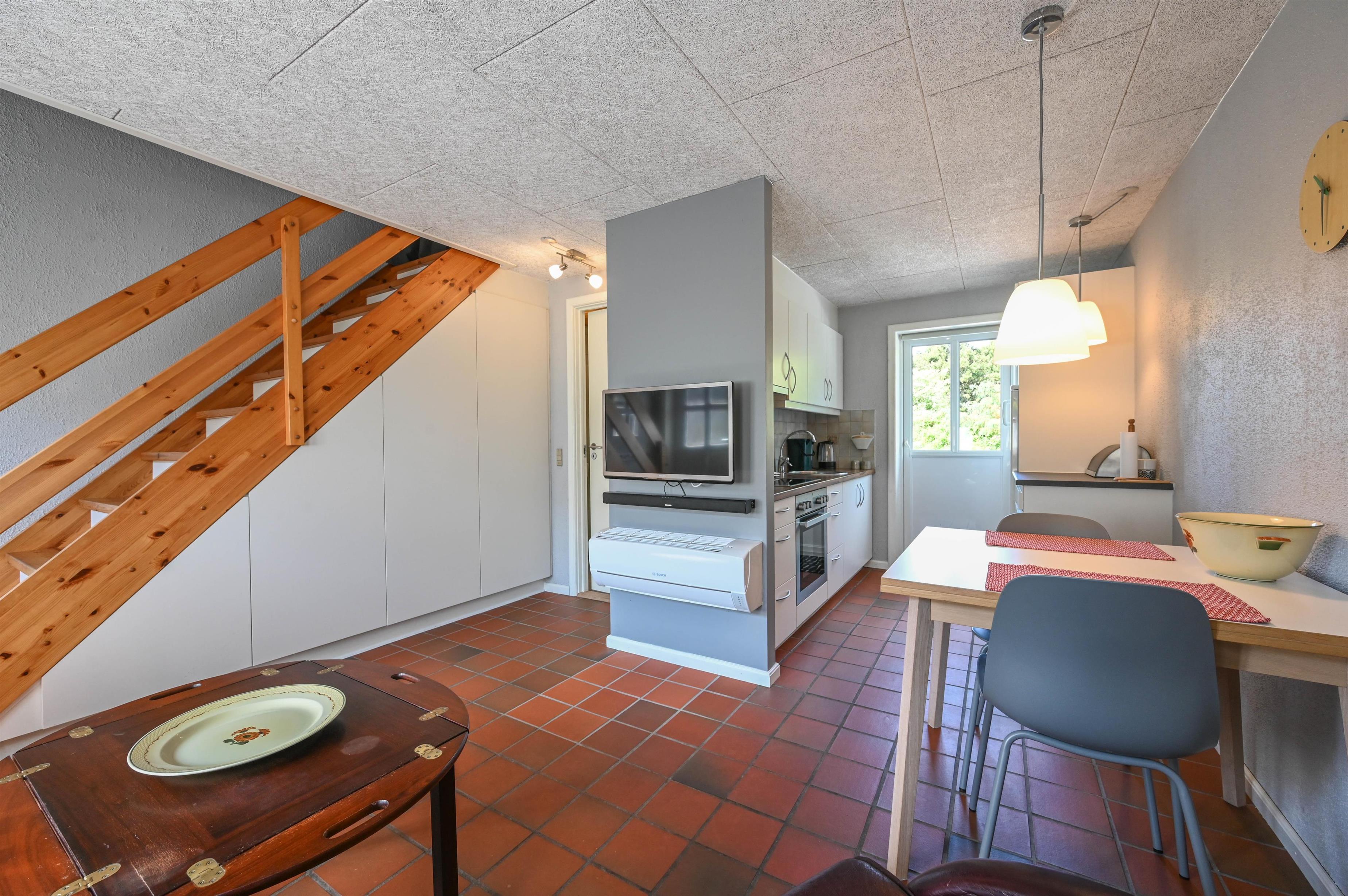 Das offene Wohn- und Esszimmer ist freundlich eingerichtet, mit bequemen Möbeln, Klimaanlage/Wärmepumpe und einer gut ausgestatteten Küche mit allem, was du brauchst.