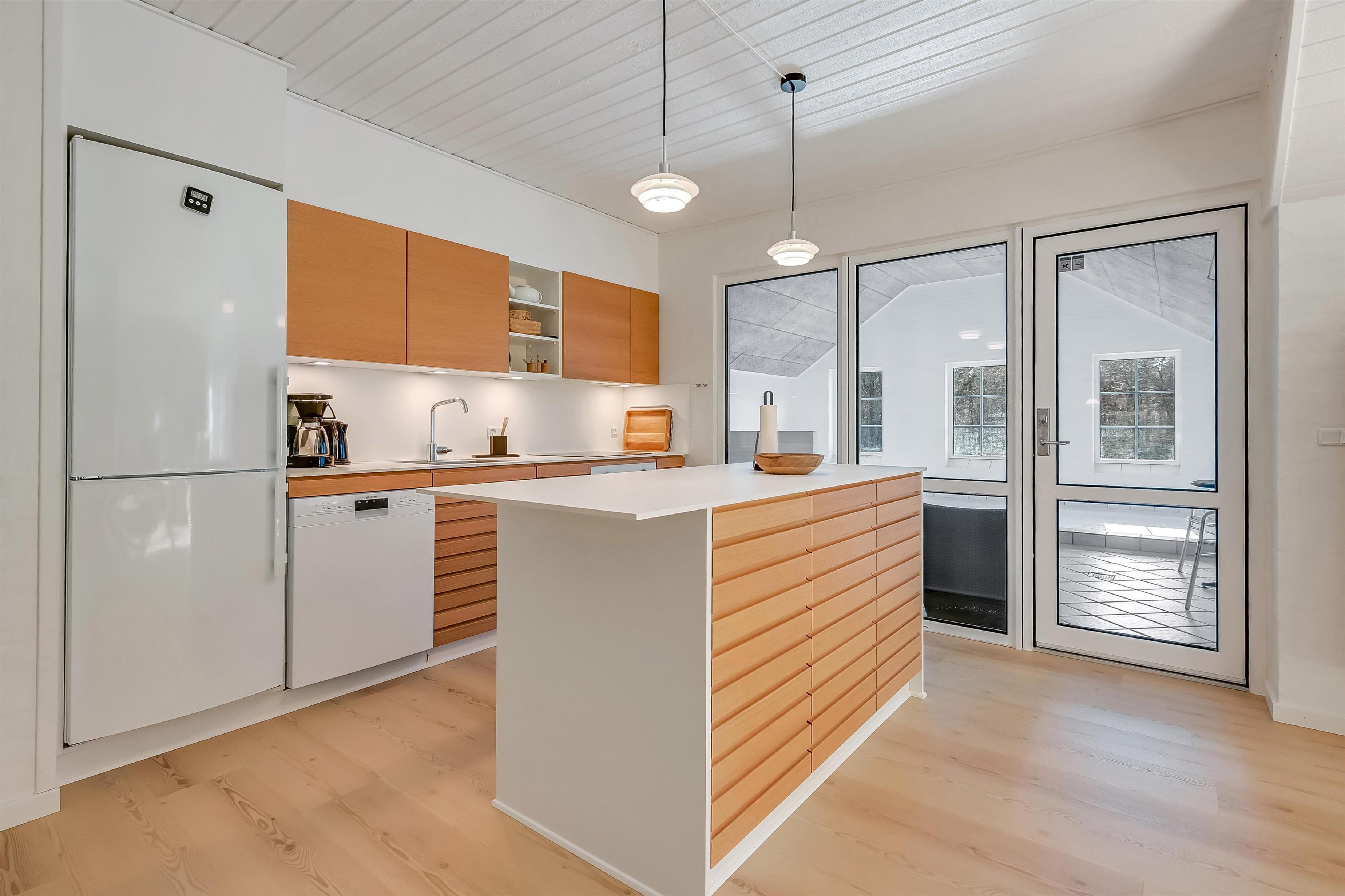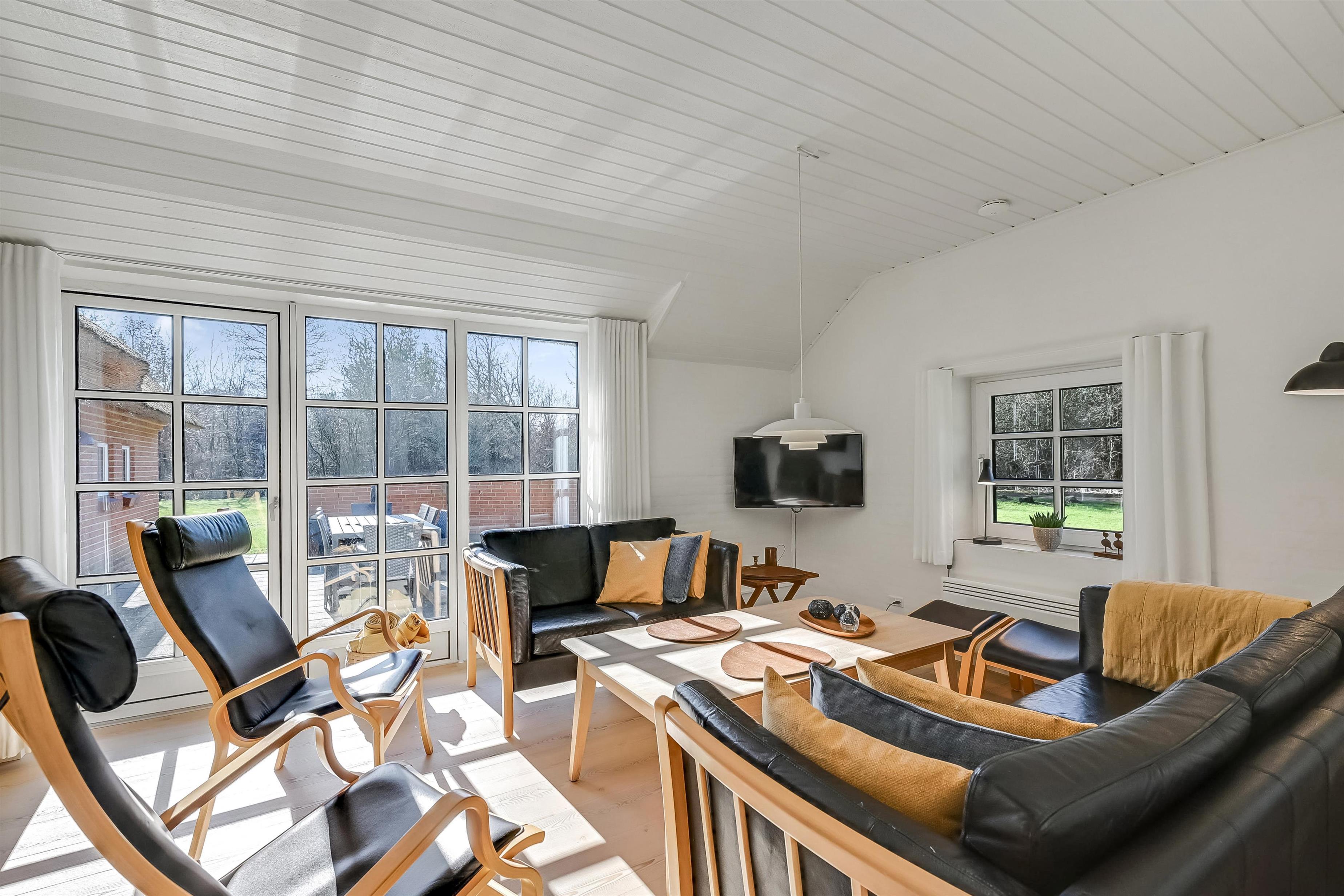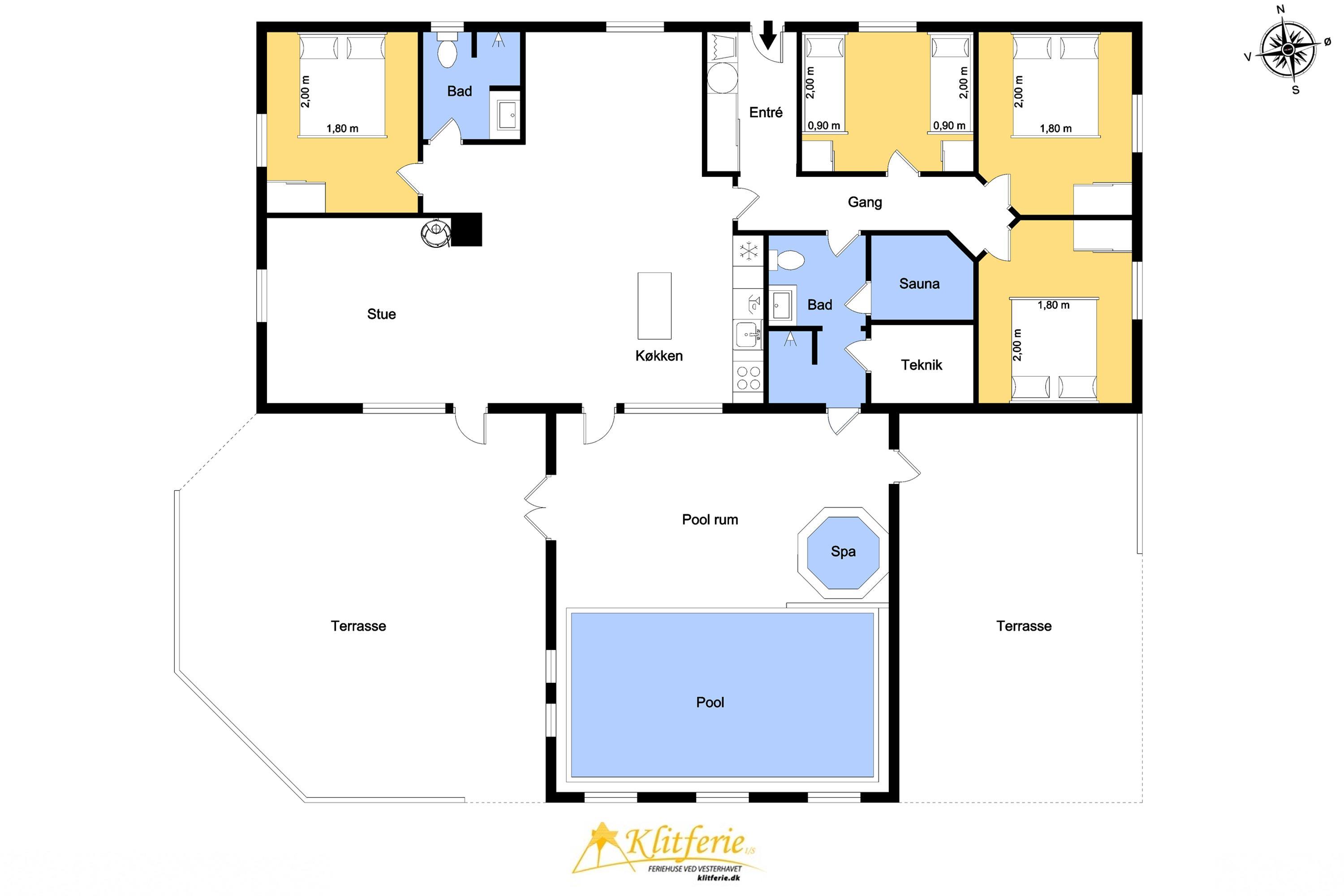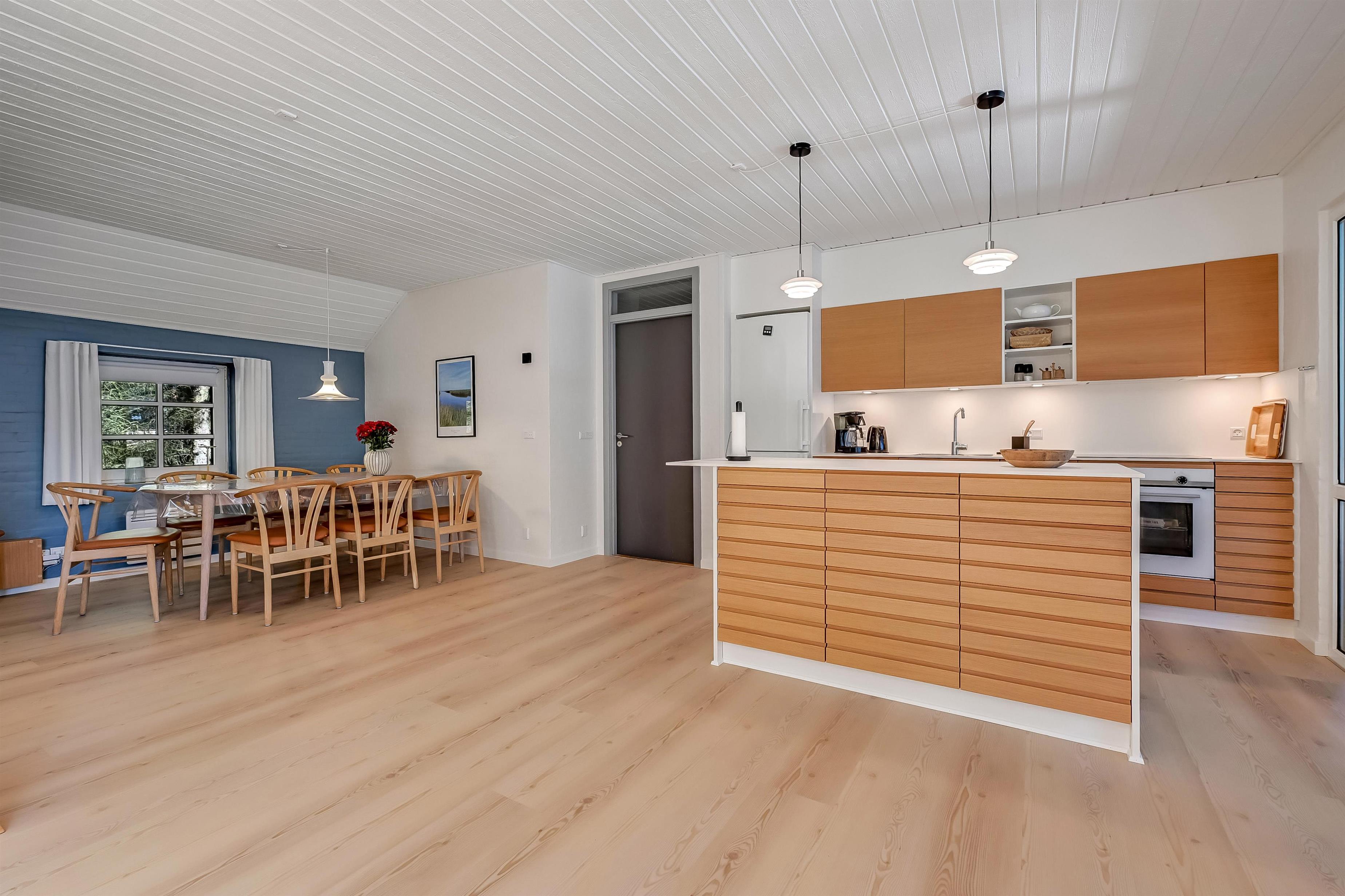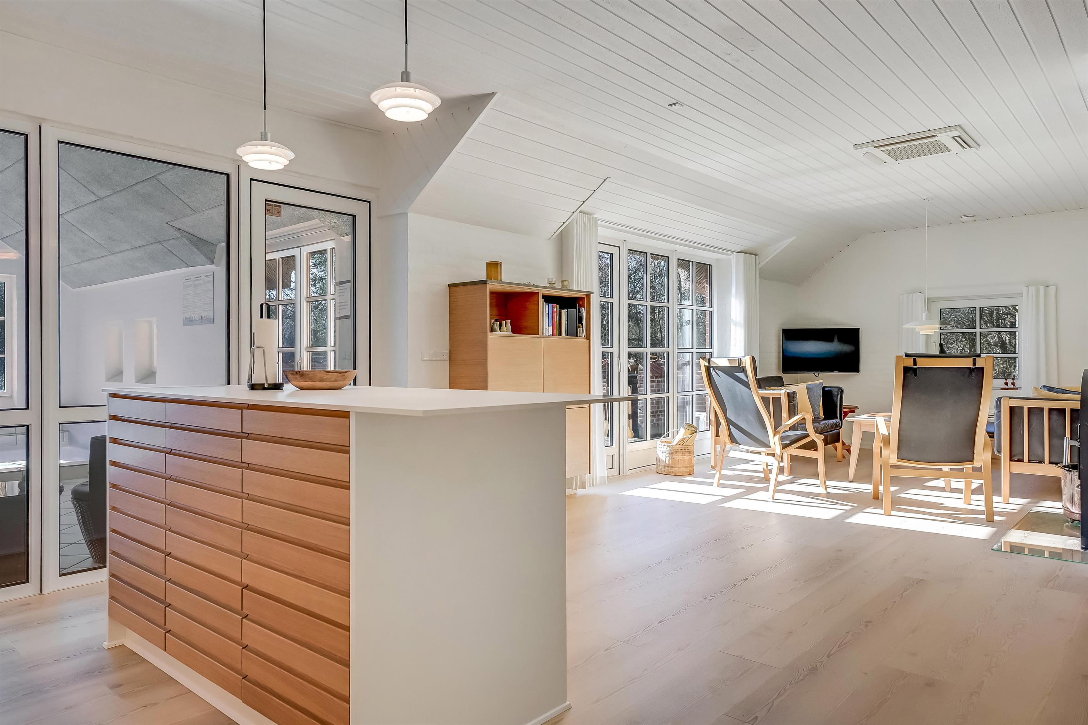 Aufteilung: Eingangsflur mit Waschmaschine und Wäschetrockner. An die neue, gut ausgestattete Küche schließt sich das Wohnzimmer mit hochwertigen Möbeln und einem schönen Kaminofen an. Insgesamt 4 Schlafzimmer, drei mit Doppelbett und eines mit zwei Einzelbetten. Die Wellnessabteilung hält Swimmingpool, Whirlpool und Sauna für euch bereit. Es gibt zwei moderne Bäder mit Fußbodenheizung und einer begehbaren Dusche. Dänisches TV DR und Satellitenschüssel für den Empfang deutscher TV-Sender.