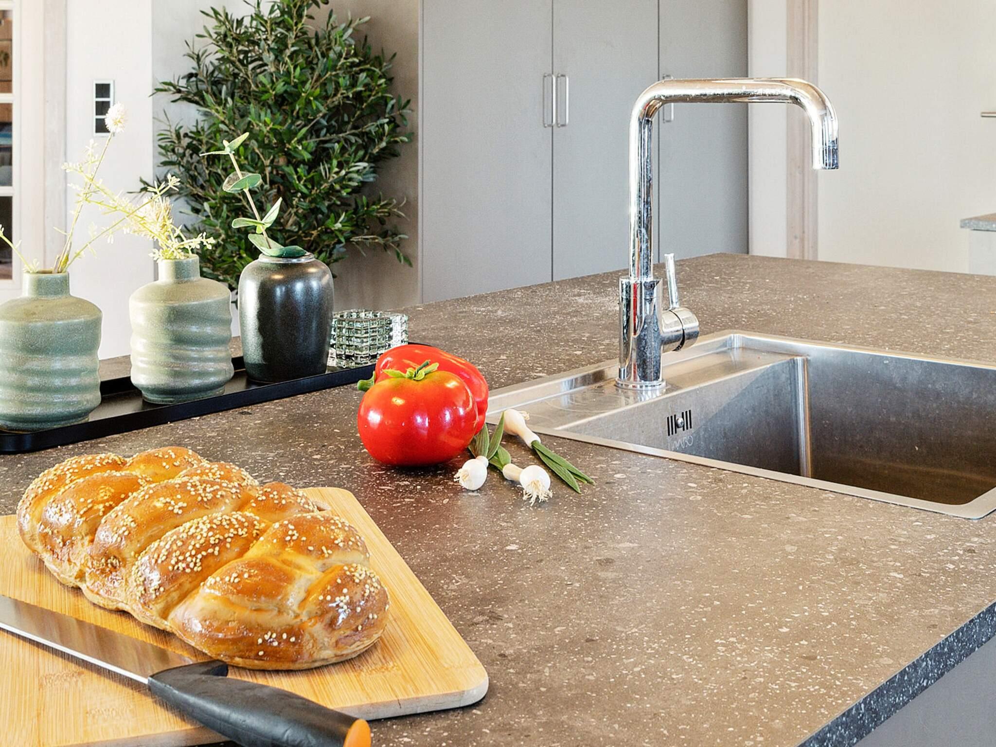 Der Ess-Wohnbereich ist geschmackvoll eingerichtet und bietet u.a. Flachbild-TV, Sitzecke und Holzofen. In der Küche gibt es je zwei Geschirrspüler, Backöfen und Kühlschränke sowie einen großen Gefrierschrank. Außerdem vier Badezimmer im Haus, die alle mit einer Dusche und angenehmer Fußbodenheizung ausgestattet sind.