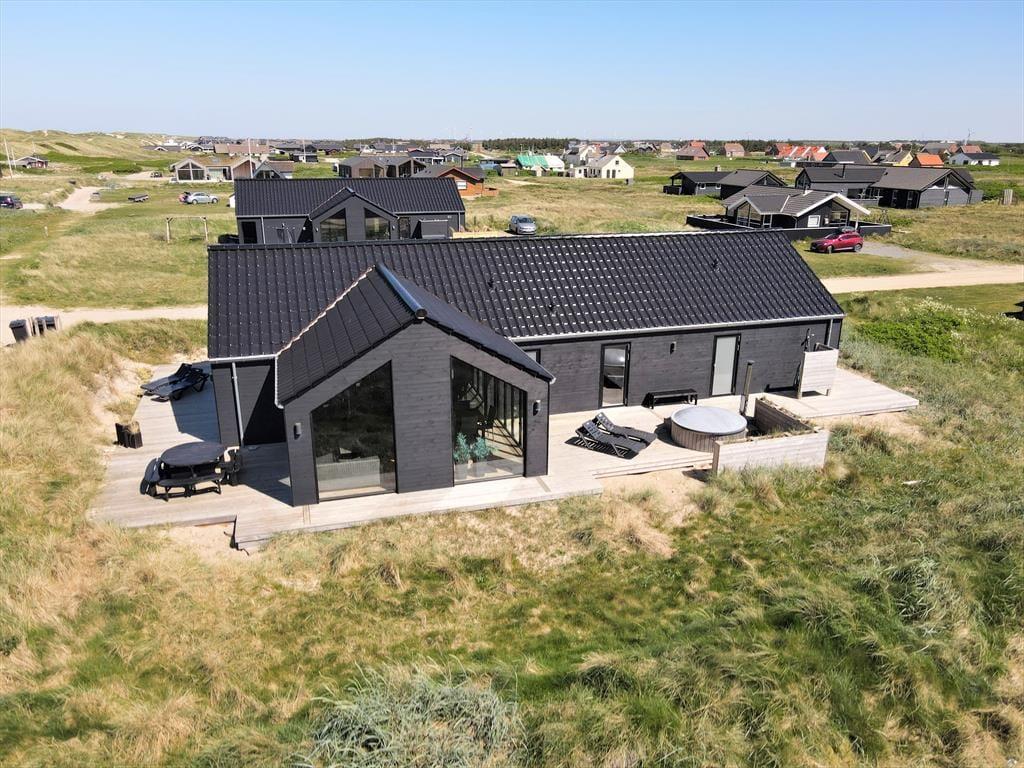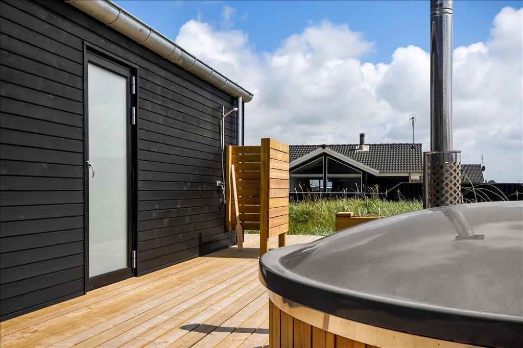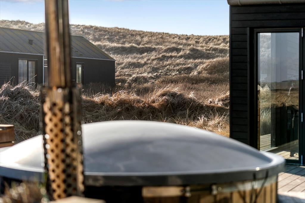 Die große Holzterrasse fungiert als natürliche Erweiterung des Wohnbereichs – hier kannst du das Leben im Freien in aller Ruhe genießen. Ein Teil der Terrasse ist überdacht, sodass du sowohl im Schatten als auch windgeschützt sitzen kannst. Es gibt ausreichend Platz für Lounge-Möbel und einen Grill. Auf der Terrasse steht das herrliche Wildnisbad, das zu langen, wohltuenden Bädern unter freiem Himmel einlädt. Ob im Morgensonnenschein mit einer Tasse Kaffee oder am Abend unter dem Sternenhimmel – das sprudelnde Wasser sorgt immer für Entspannung. Der Garten rund ums Haus bietet Platz zum Spielen für Kinder und Hunde, während Vogelgezwitscher und die salzige Meeresluft die Stimmung perfekt abrunden. Hier spürst du sofort, wie der Urlaubsmodus einsetzt.