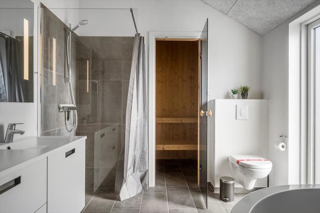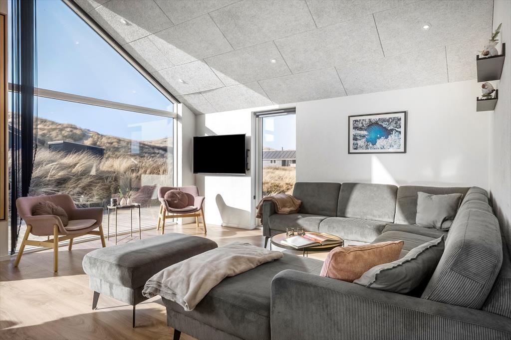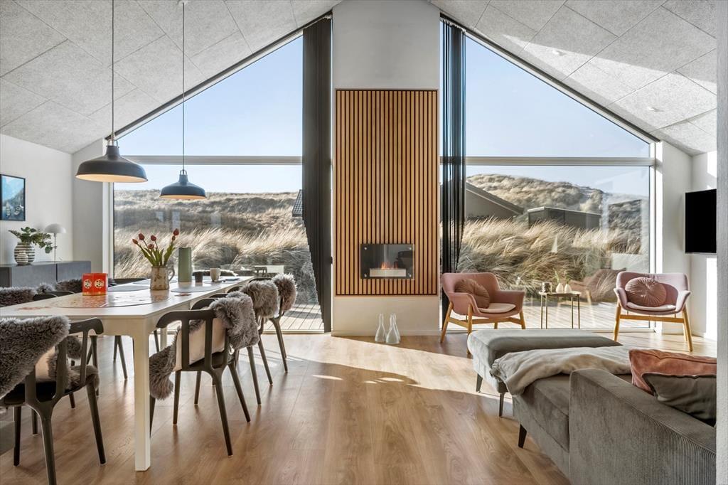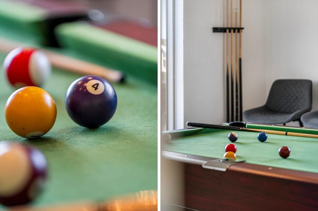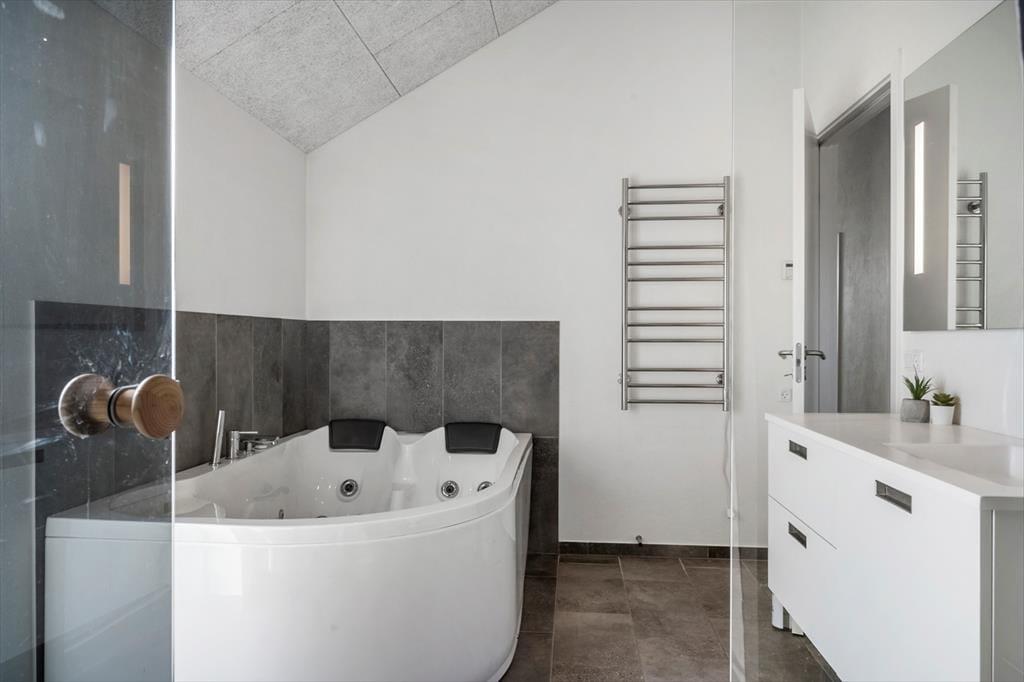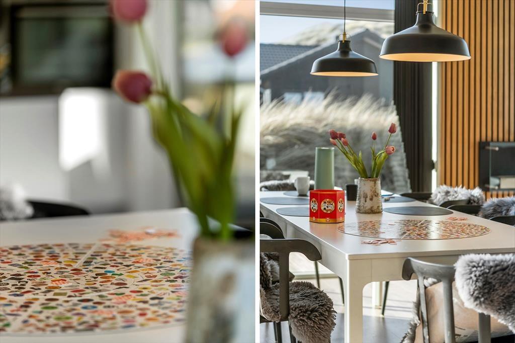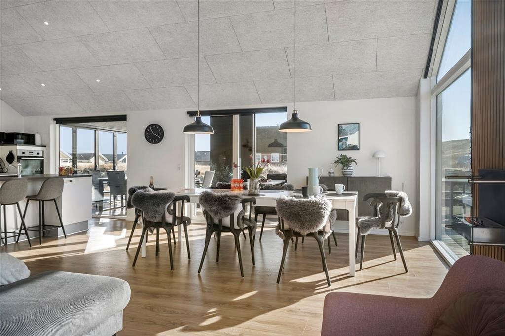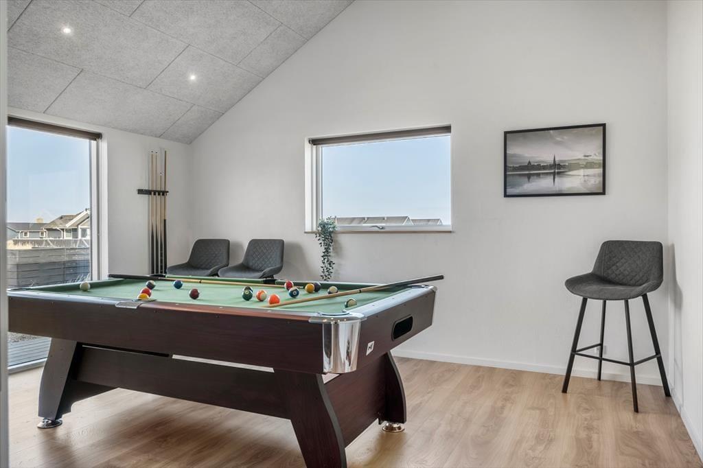 Das Ferienhaus strahlt Licht und Großzügigkeit aus, die Einrichtung ist modern und einladend, mit hohen Decken und großen Fensterflächen, die die Natur ins Haus holen. Die Küche ist offen mit dem Essbereich und dem Wohnzimmer verbunden, sodass es ganz natürlich ist, gemeinsame Momente beim Kochen, Kartenspielen oder gemütlich vor dem Fernseher zu verbringen. Das Badezimmer ist als kleine Wellness-Oase mit Whirlpool und Sauna gestaltet – von hier aus hast du sogar direkten Zugang zur Terrasse, was den Übergang von warmer Entspannung zu frischer Luft besonders angenehm macht. Wenn es etwas lebhafter zugehen soll, lädt der Aktivitätsraum mit Billardtisch und Tischtennisplatte zu stundenlangem Spielspaß ein – hier ist für jede Altersgruppe etwas dabei.