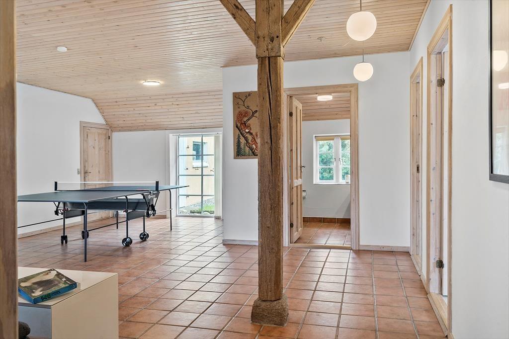 Schon beim Betreten von „Simonsbjerg“ spürt man die besondere Ruhe und Großzügigkeit, die das ganze Haus durchzieht. Der große Wohnbereich mit Kaminofen, Essplatz und offener Küche bildet das natürliche Zentrum – perfekt, um mit der Familie gemeinsam zu kochen, zu essen und lange Abende mit Gesprächen und Spielen zu verbringen. Warme Holzmaterialien und große Fensterfronten sorgen für eine helle, freundliche Atmosphäre – und bieten gleichzeitig einen herrlichen Ausblick auf die Landschaft und das Wasser – sogar vom Sofa aus. Im Aktivitätsraum des Hauses kannst du deine Mitreisenden zu einer Runde Tischtennis herausfordern, und wenn du mit Kindern reist, ist das eine ideale Möglichkeit, überschüssige Energie loszuwerden, während die Erwachsenen sich eine wohlverdiente Pause gönnen. Es wurde viel Wert auf Details gelegt – mit Raum für gemeinschaftliche Stunden genauso wie für individuelle Rückzugsmöglichkeiten – zu jeder Jahreszeit.