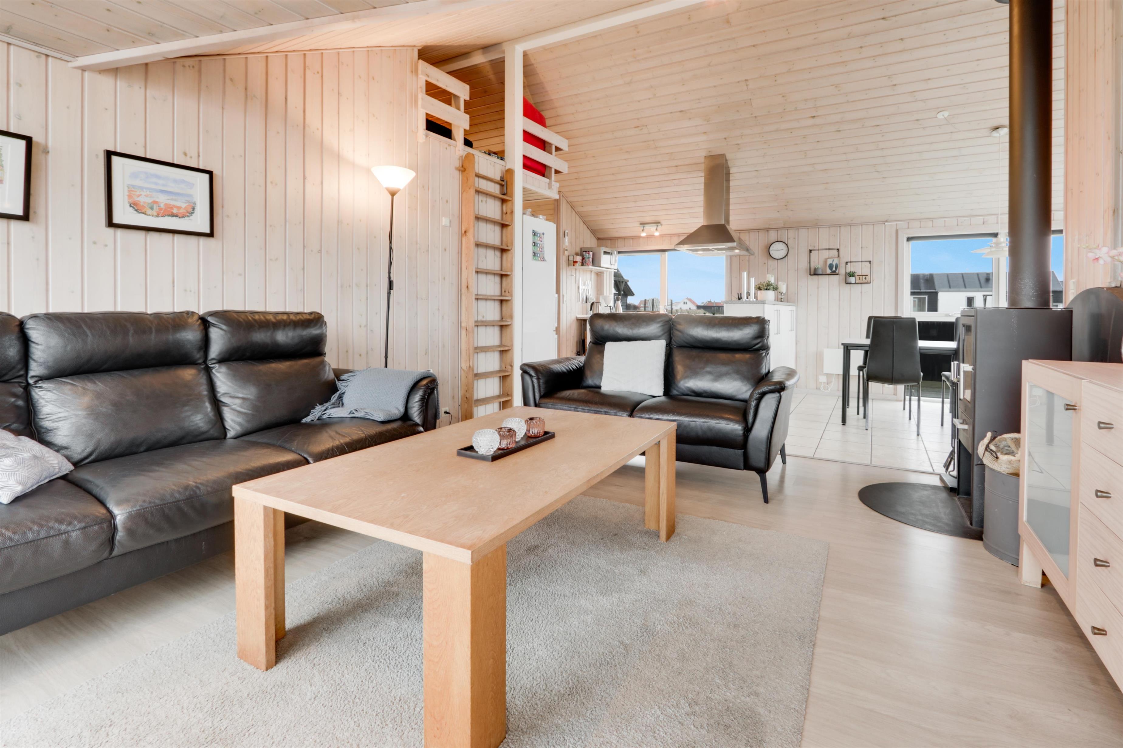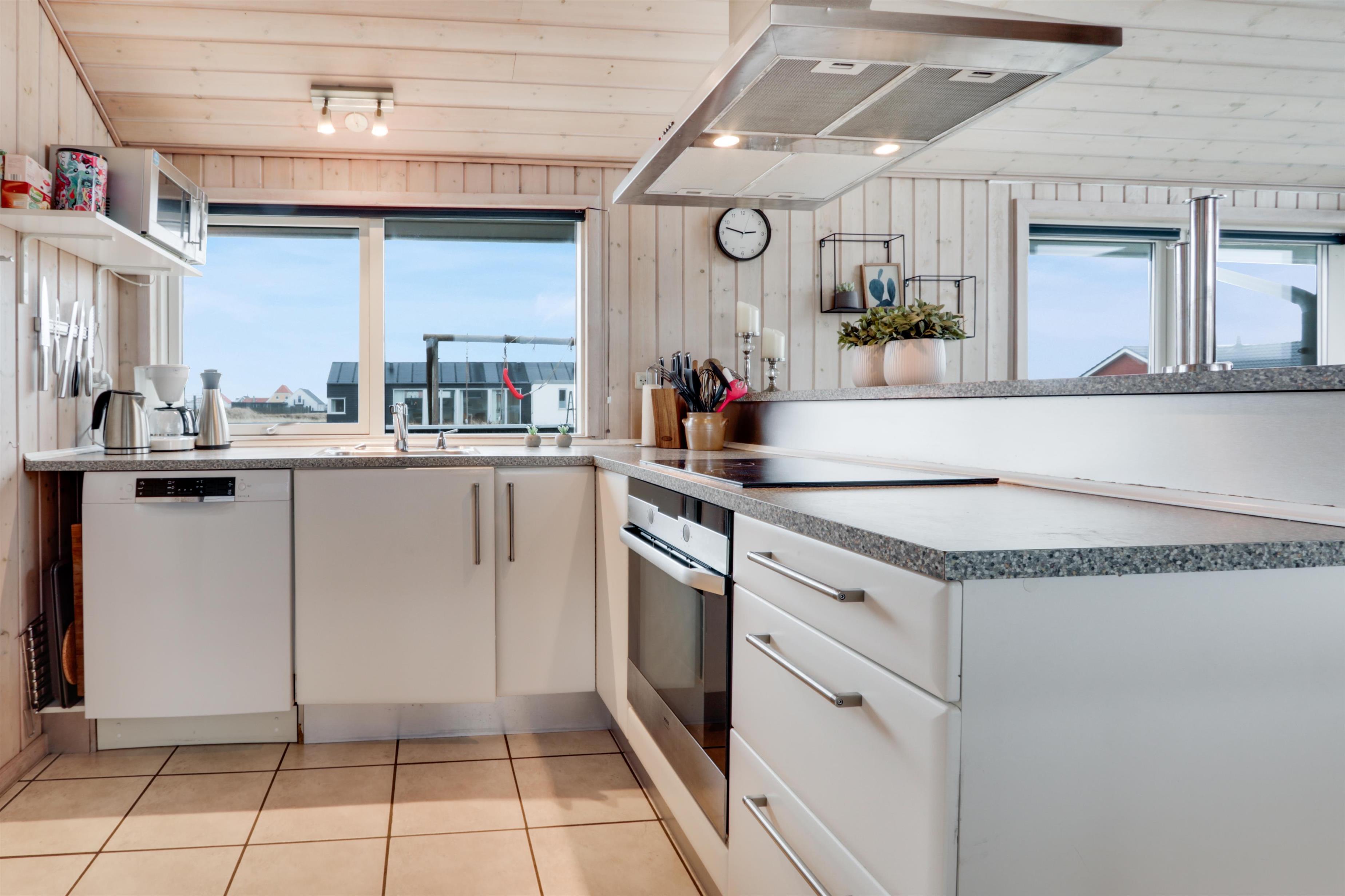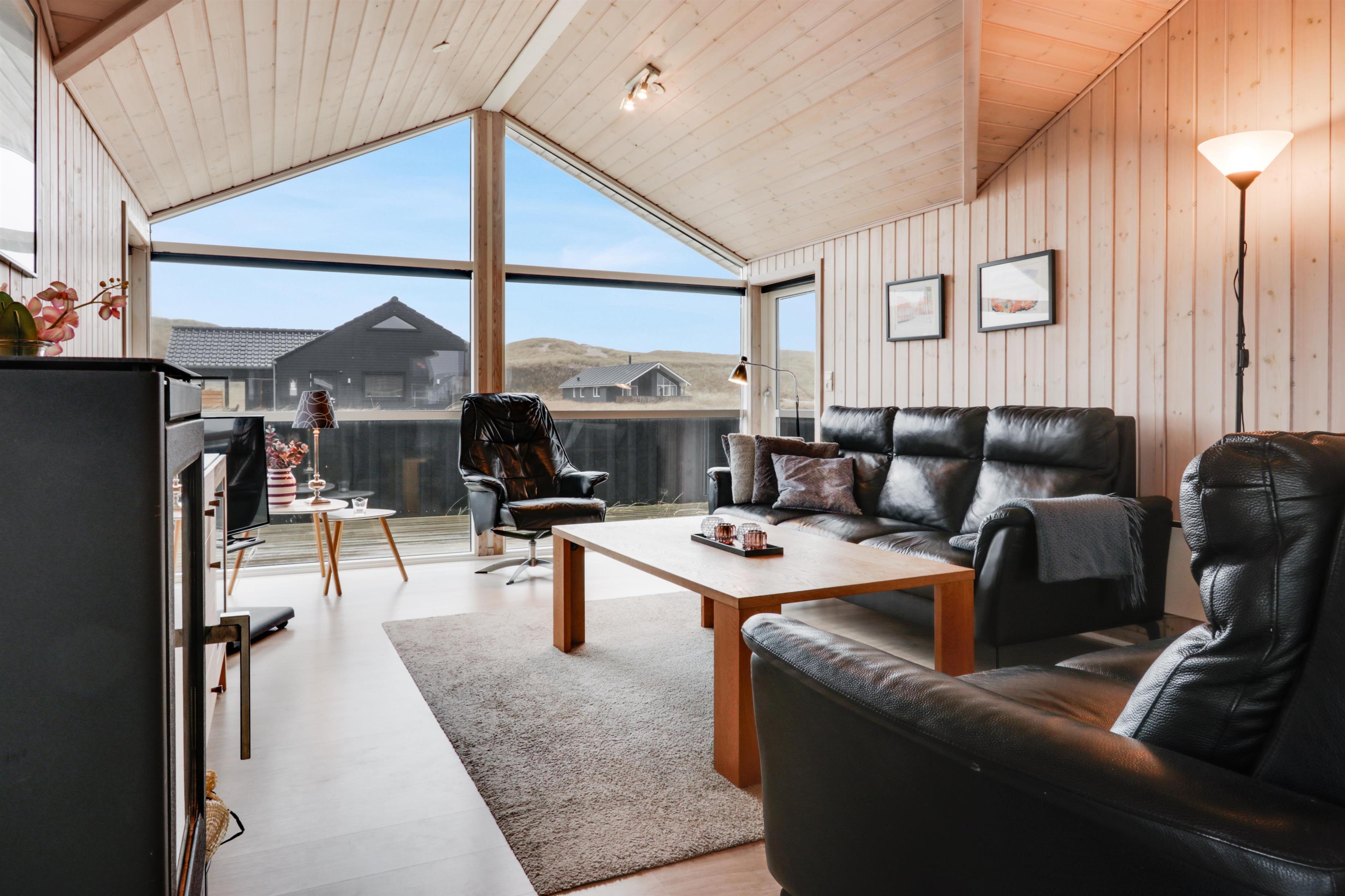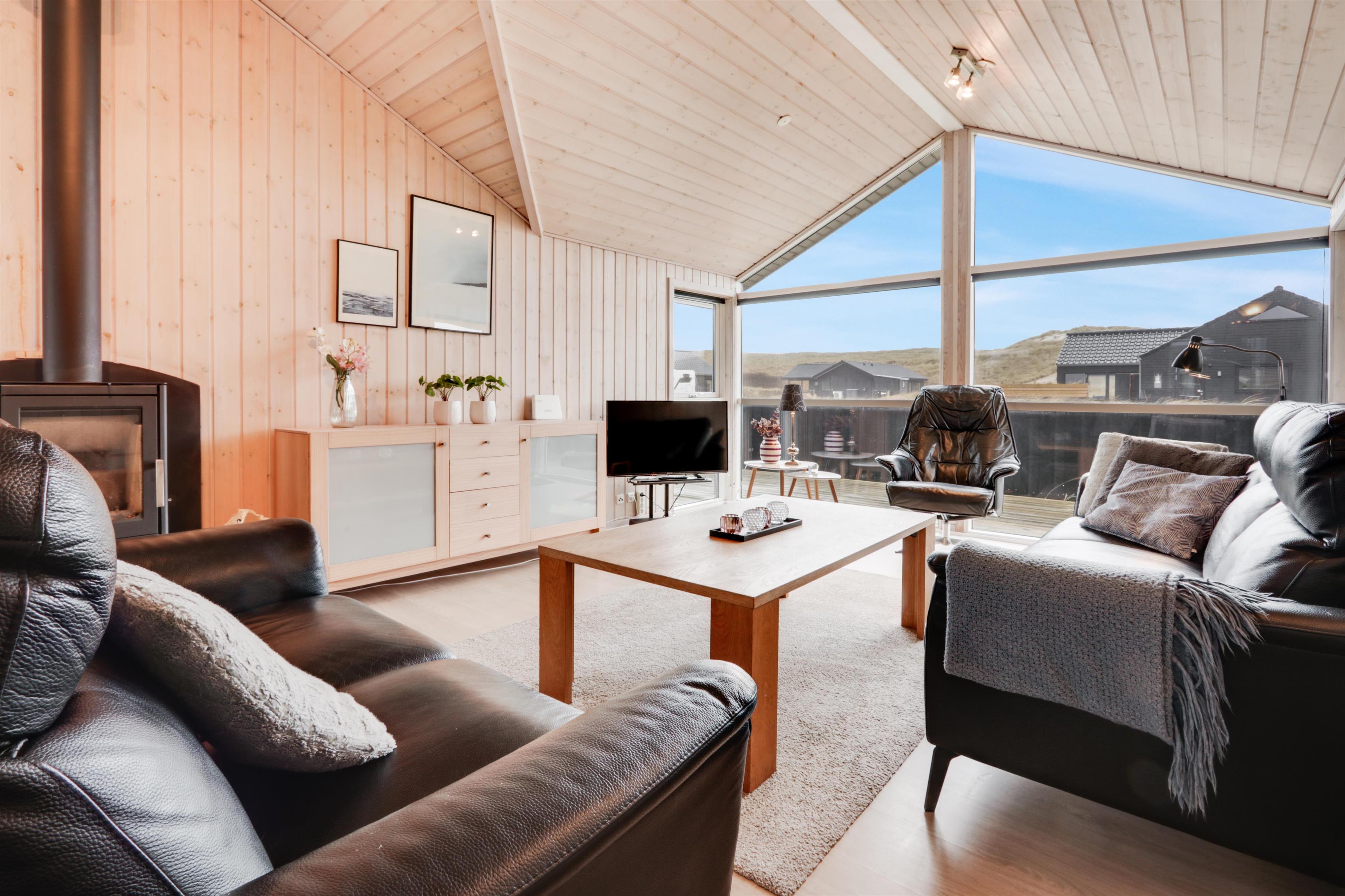 Schönes Ferienhaus aus Holz auf einem Dünengrundstück dicht an der Nordsee gelegen. Das Haus ist hell und freundlich eingerichtet mit Holzboden, die Wände sind durch hohe Decke geöffnet und es gibt große Panoramafenster. Schöner Wohnraum mit Ledermöbeln, F-TV mit dänischen und deutschen Programmen und die Möglichkeit für Streaming von TV / Radio / Apps für die Sie selber einen Abonnement haben. Ein Kaminofen und eine Wärmepumpe sorgen beide für eine schöne Wärme und helfen auch dabei eine günstigere Nebenkostenrechnung zu bekommen. An dem einen Ende vom Wohnraum steht der Esstisch, von dem Sie einen schönen Blick über die Gegend haben. Die Küche ist modern eingerichtet mit E-Herd, Kühl-/Gefrierschrank, Geschirrspüler und Mikrowelle. Schönes großes Badezimmer mit Toilette, Waschbecken, Dusche, Whirlpool und Zugang zur Sauna und Fliesenboden mit Fußbodenheizung. 3 gute Schlafräume, jeweils mit 1 DB. Vom Wohnraum gibt es eine steile Leiter zum offenen Schlafboden mit 2 Schlafmöglichkeiten. Waschmaschine. Nichtraucher-Haus. 1 Haustier ist erlaubt.